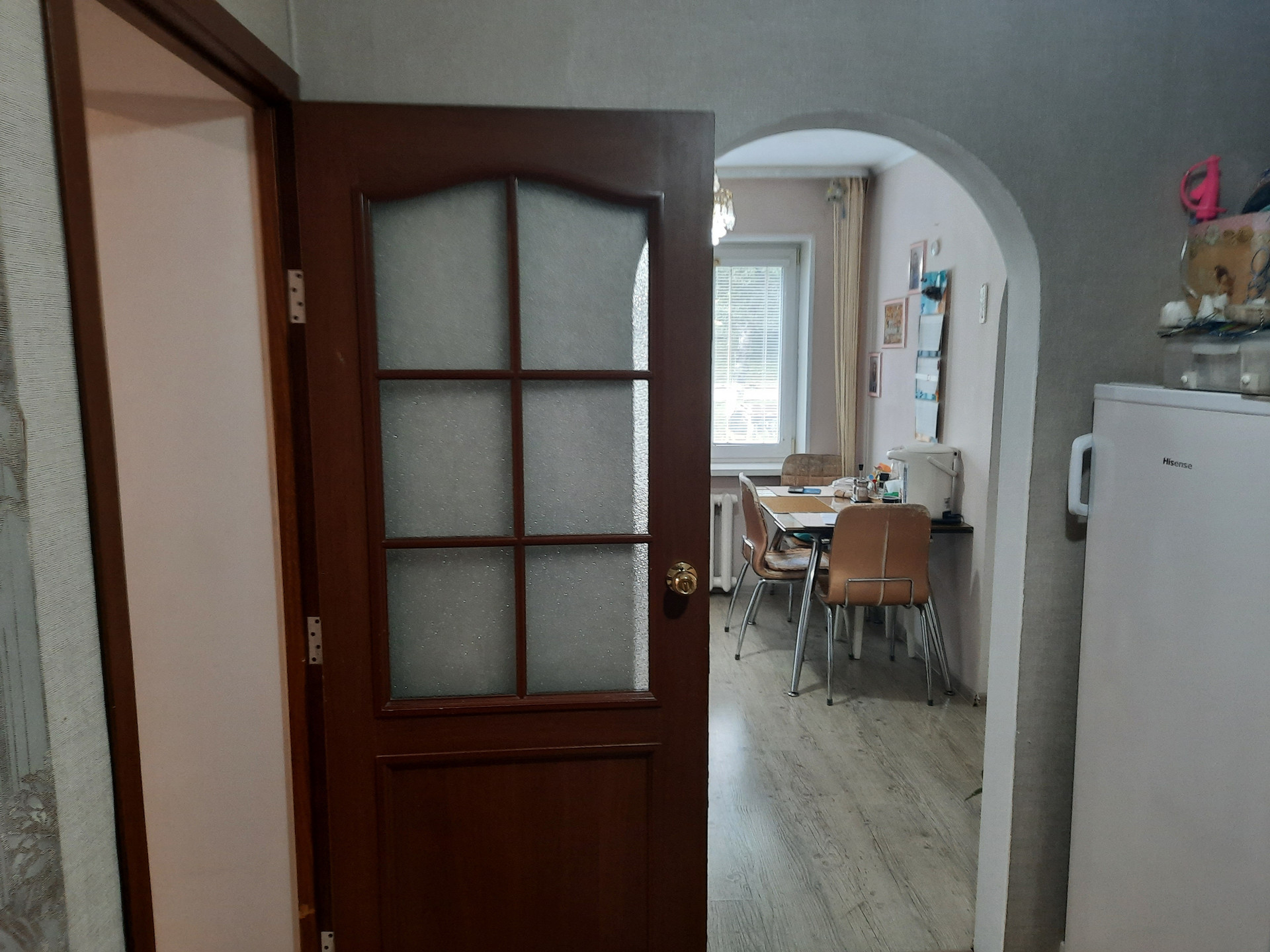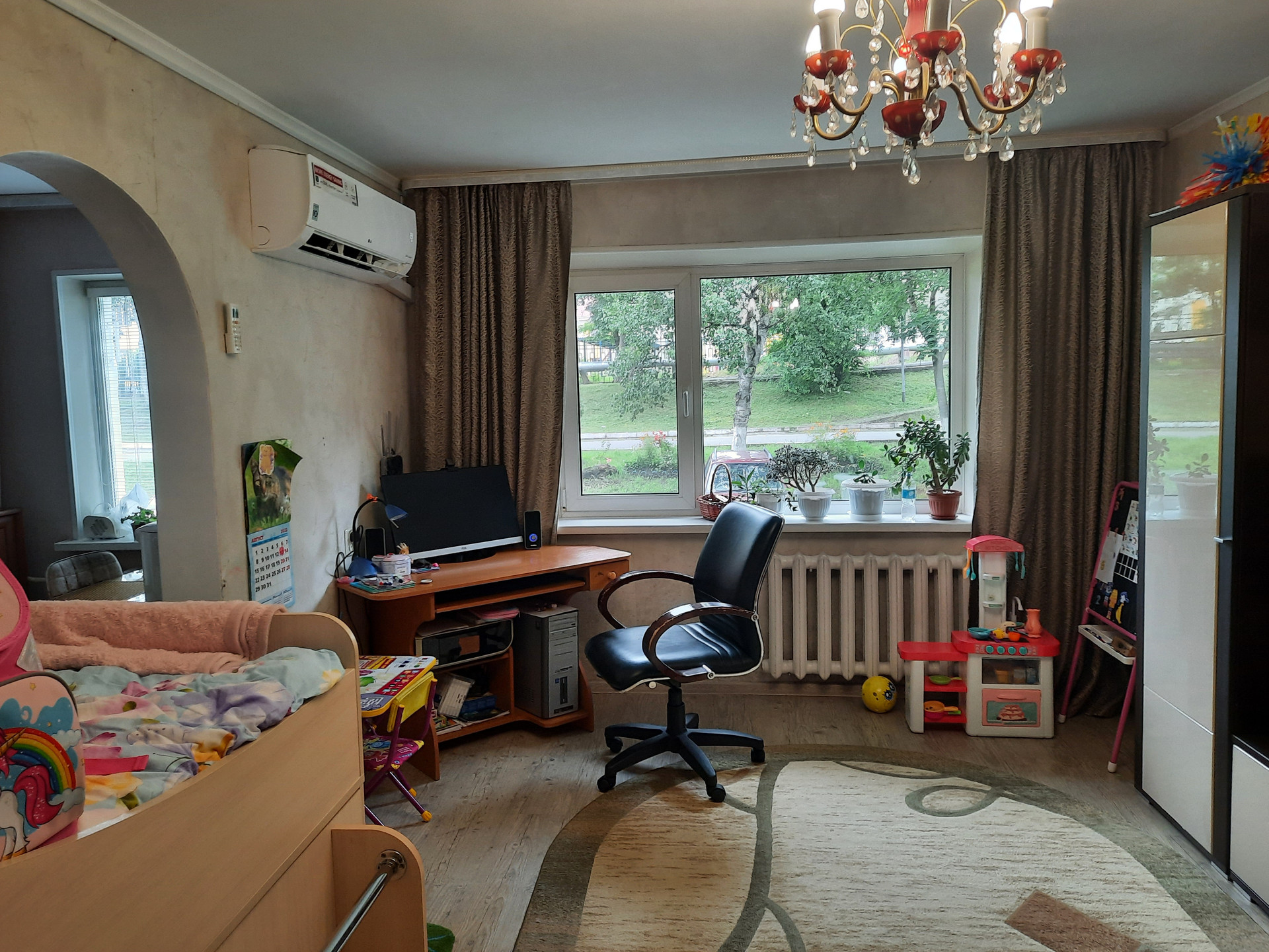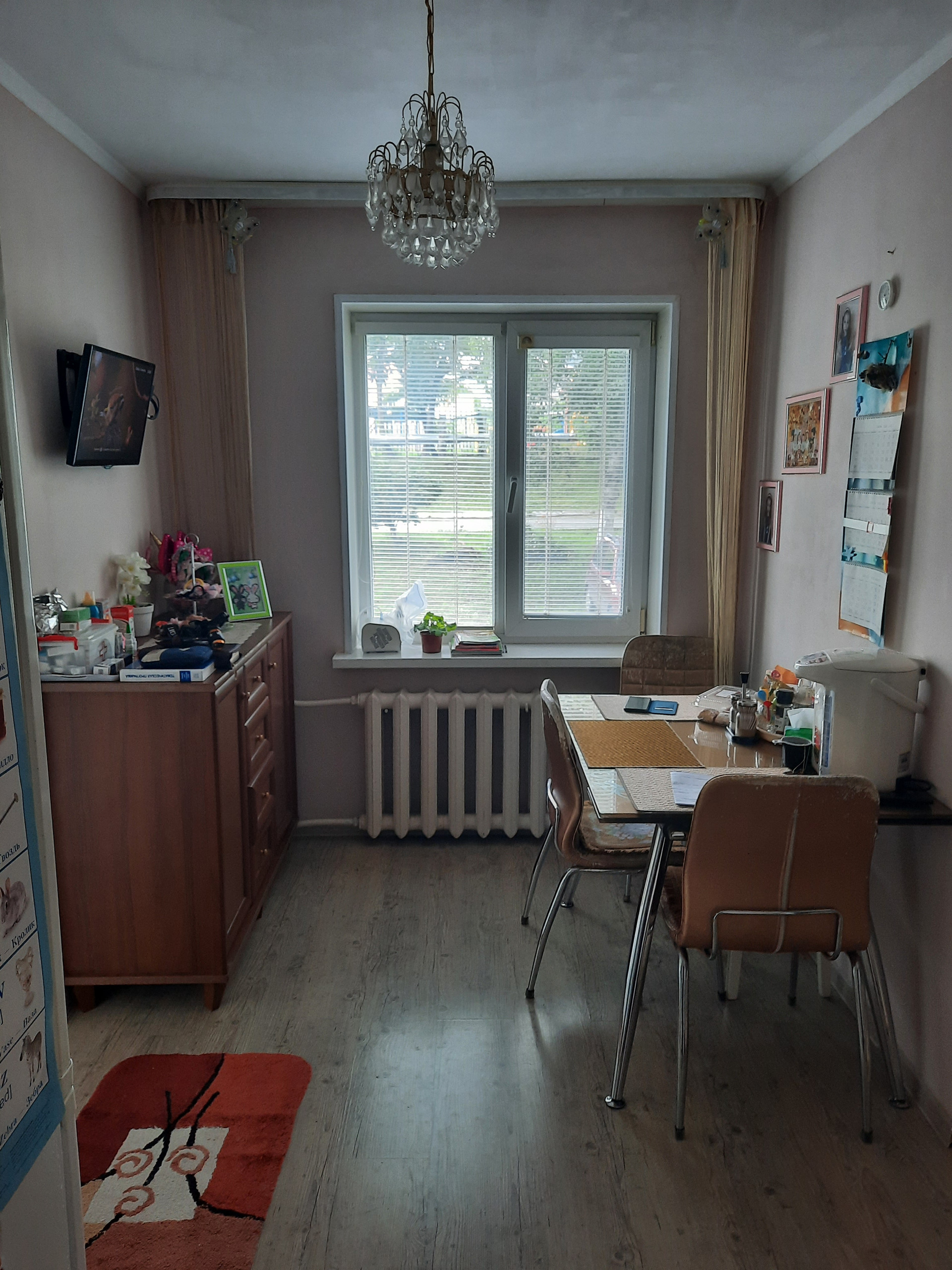 Трёхкомнатная квартира на первом этаже с отличным ремонтом и замечательной планировкой.  Квартира сухая, надёжно  изолированная от подвала, тёплая, везде большие пластиковые окна, радиаторы чугунные.  Сделан полностью ремонт: потолки и стены выровненные, в кухне и спальне натяжные потолки, ламинат на полу, большой сан.узел, одна комната оборудована под столовую. Квартира тёплая, солнечная. Рядом с домом школа, дет. сад, дом культуры. супермаркеты, остановка автобуса