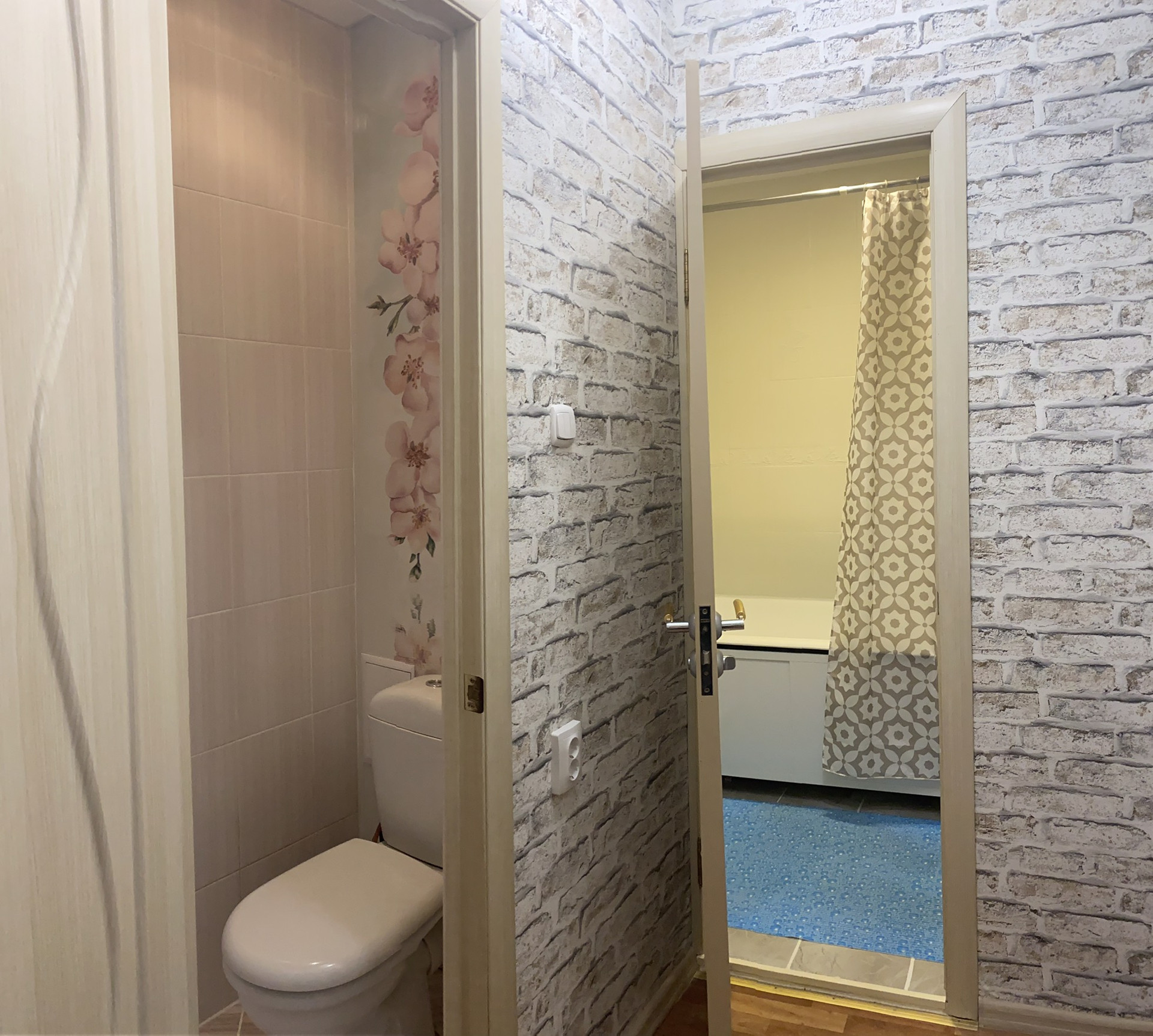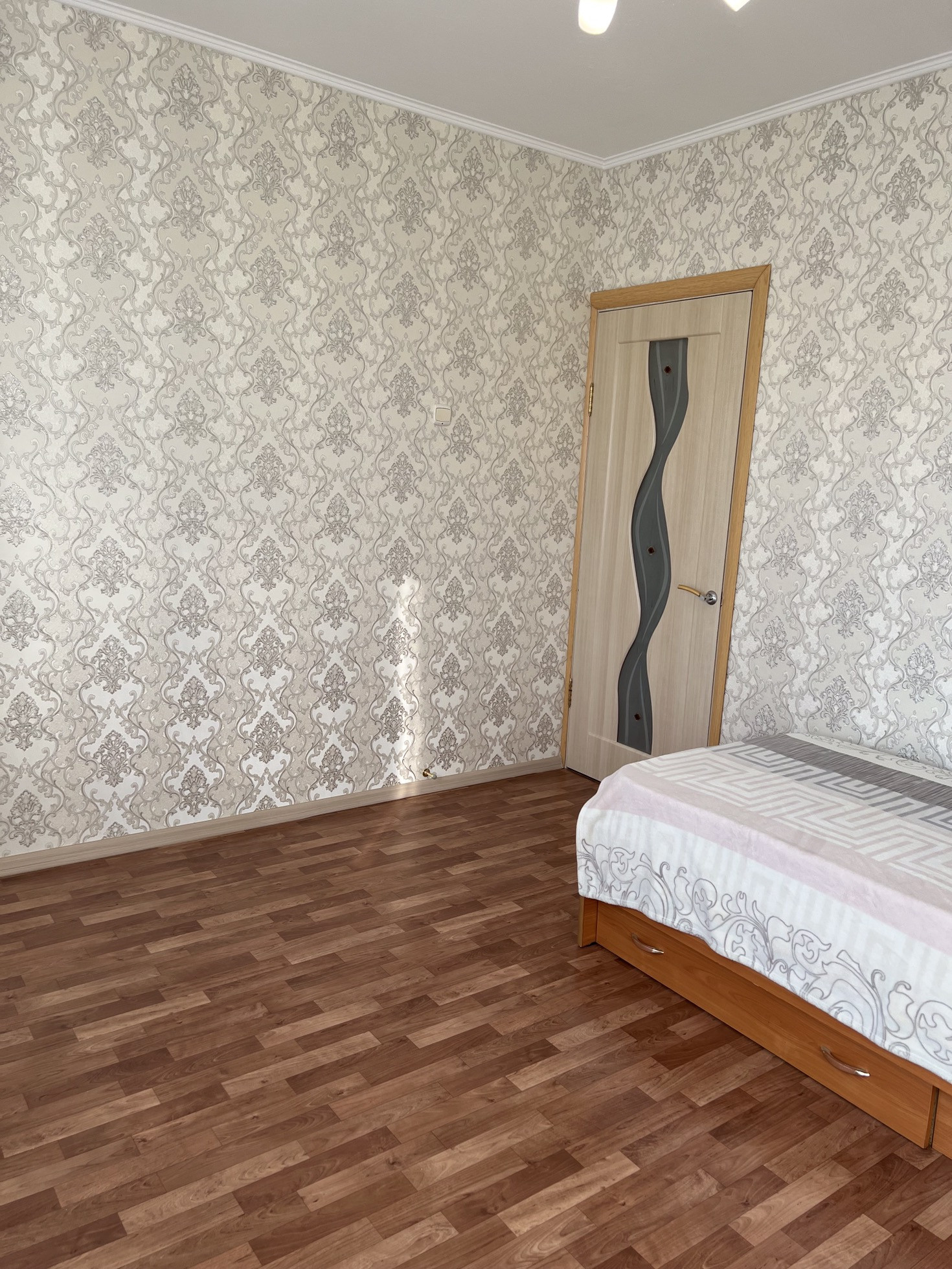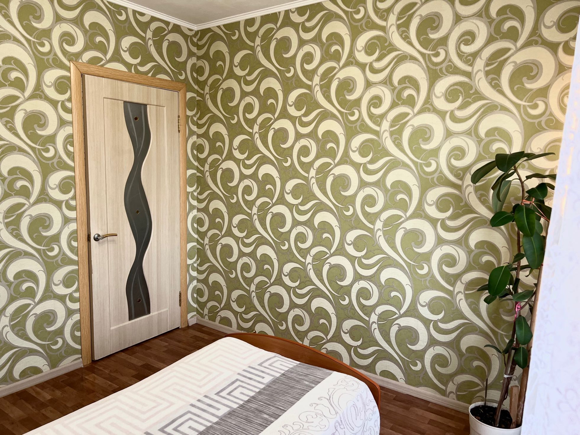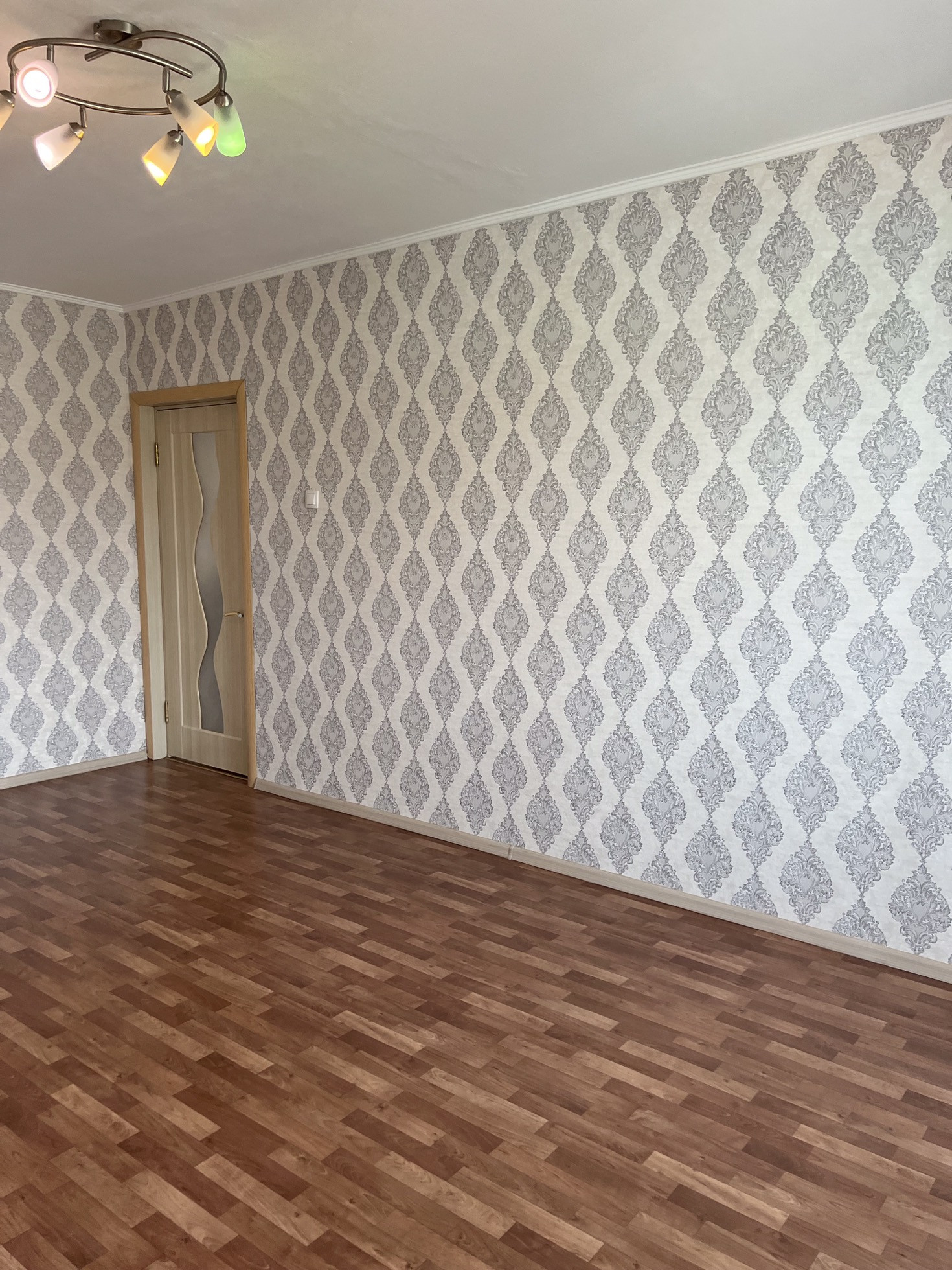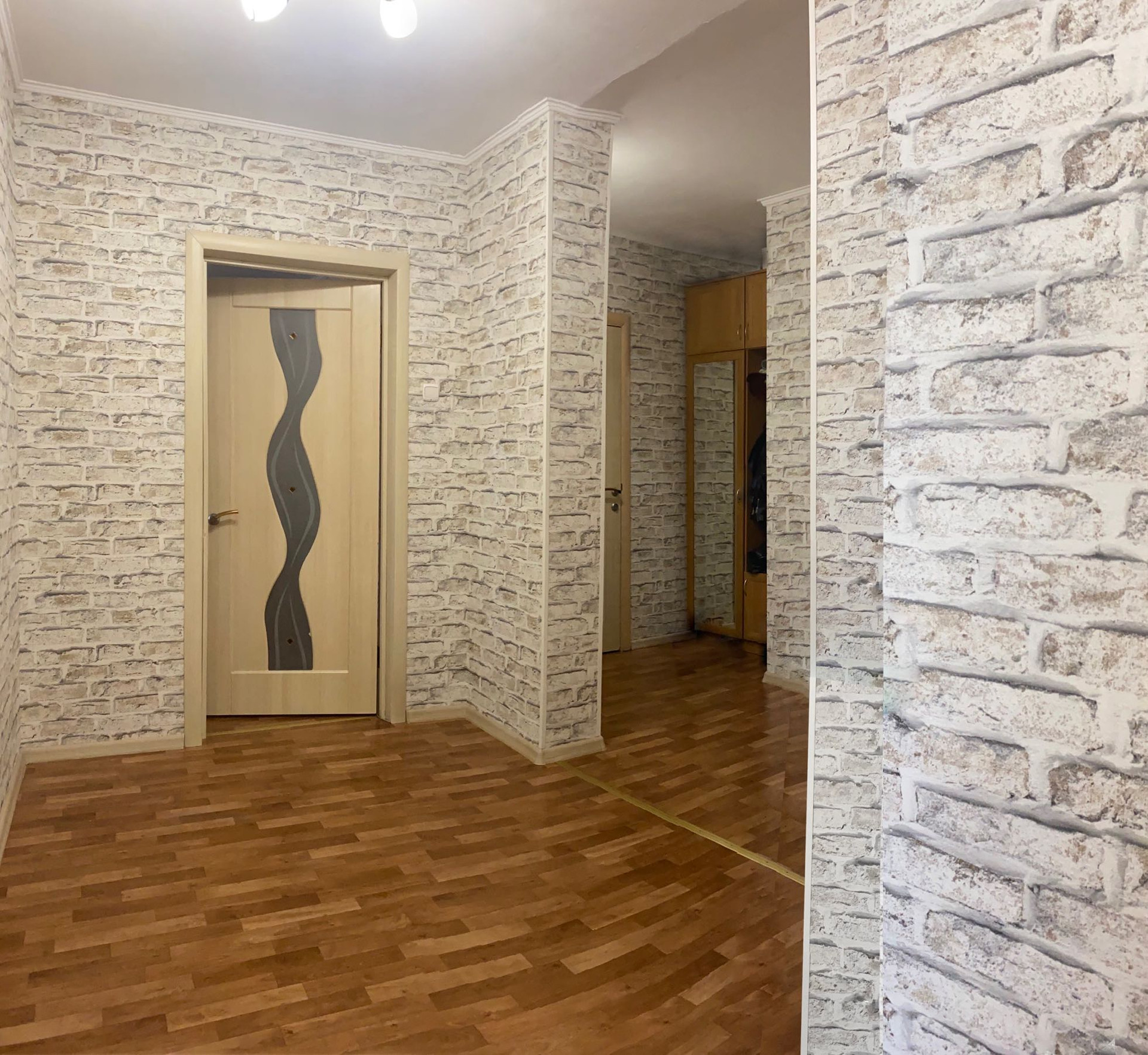 Стены выровнены и оклеены хорошими обоями. На полу постелен линолеум без изъянов. Профессионально установлены отличные межкомнатные и входная двери.