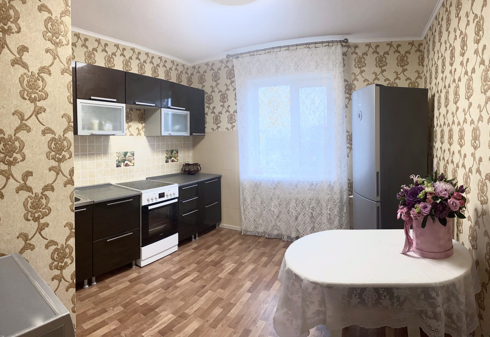 В квартире просторная кухня, в которой удобно расположить многочисленную бытовую технику и большой обеденный стол.