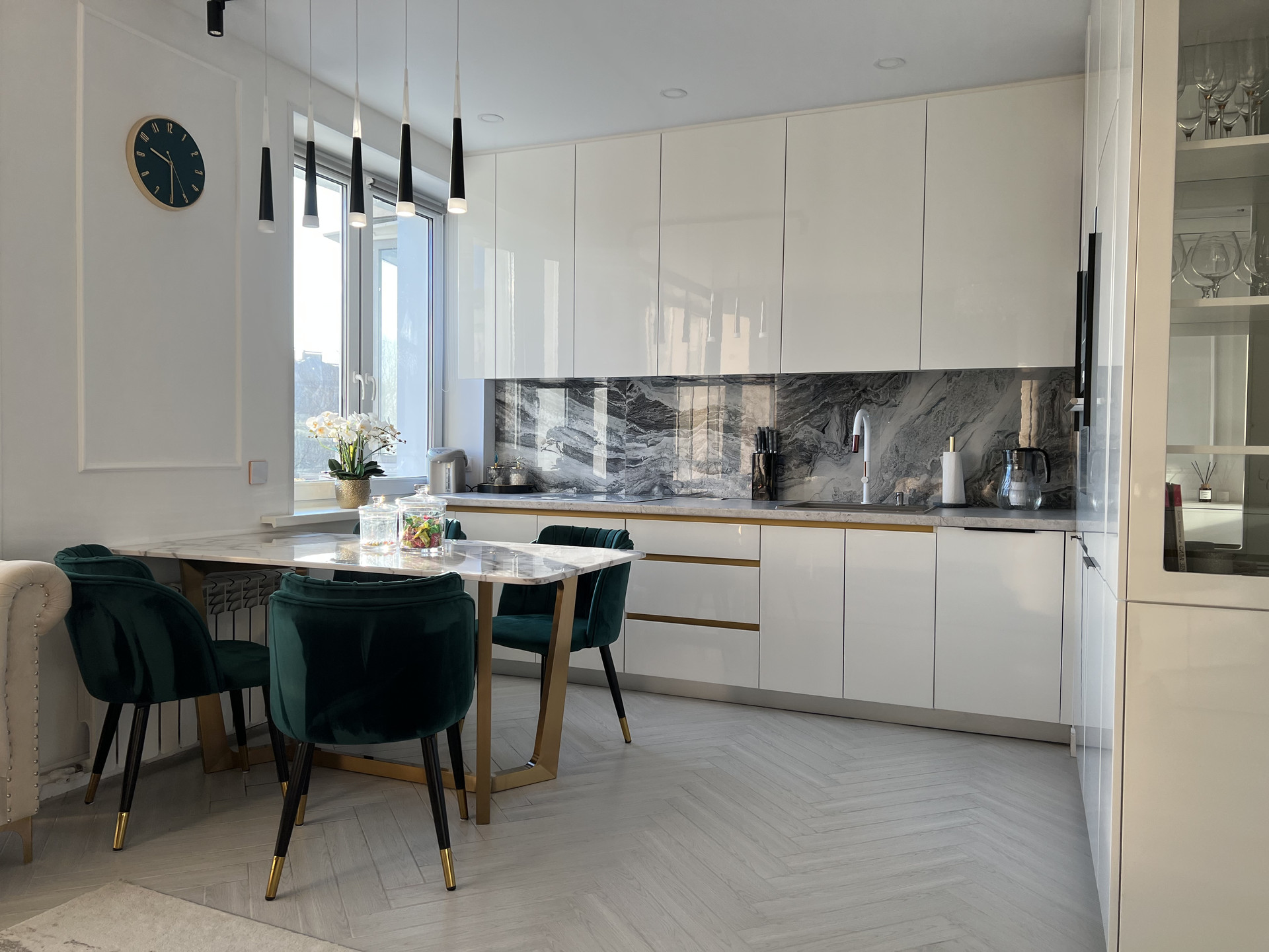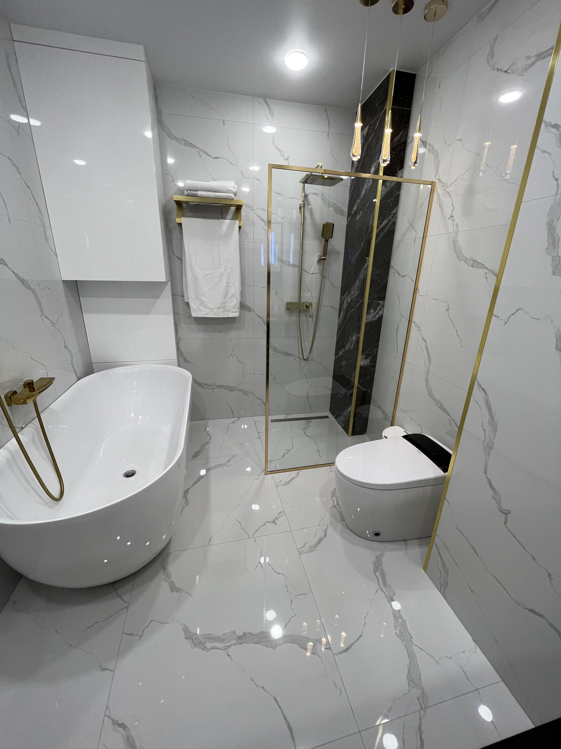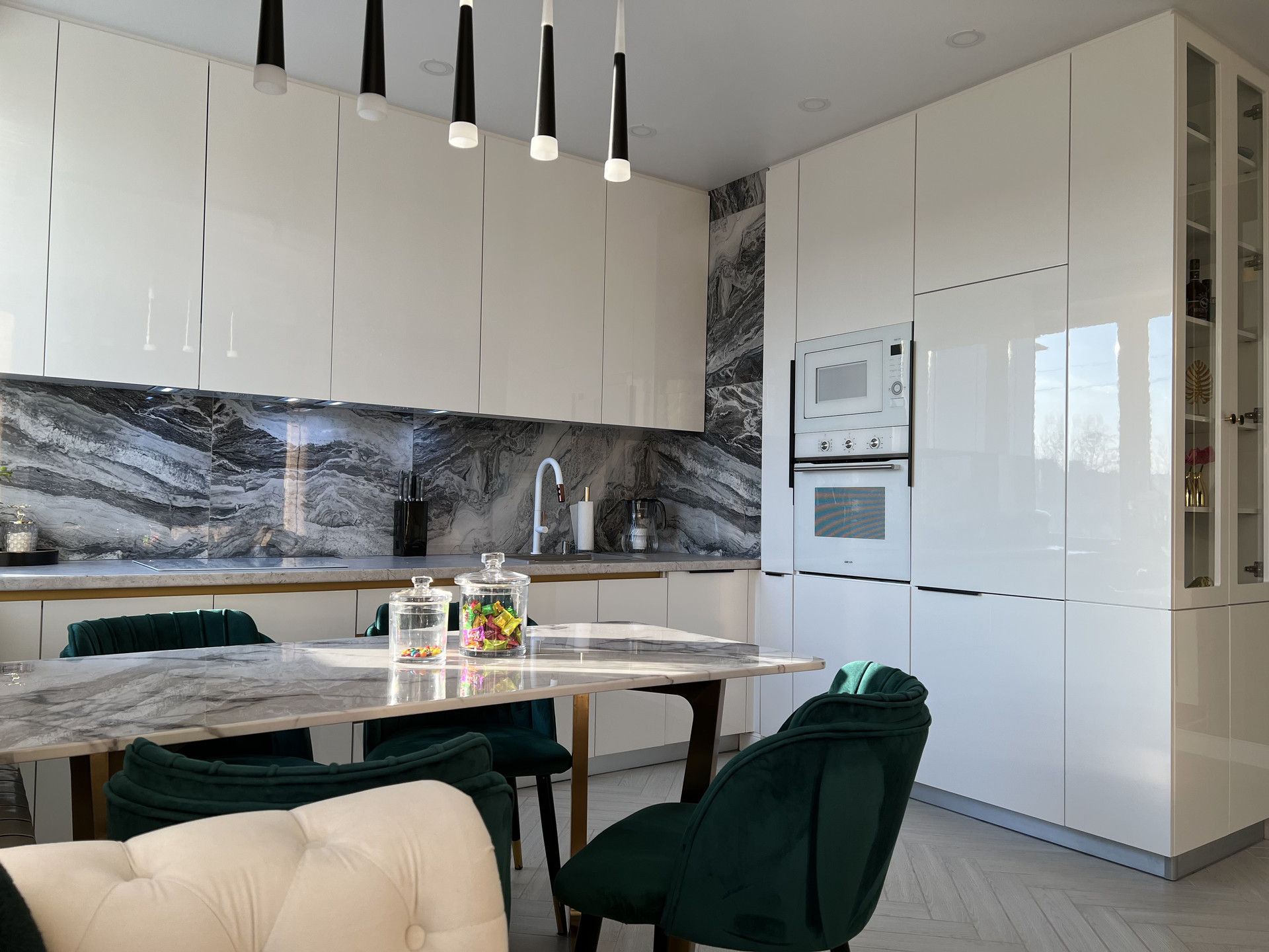 Три отдельных спальни(хозяйская и две детских), уютная гостиная с двумя диванами, камином, просторной кухней с шикарным каменным столом, большой санузел с тропическим душем в пол, умным унитазом и ванной-чашей, а так же тумбой с двумя раковинами, и конечно же огромная прихожая.