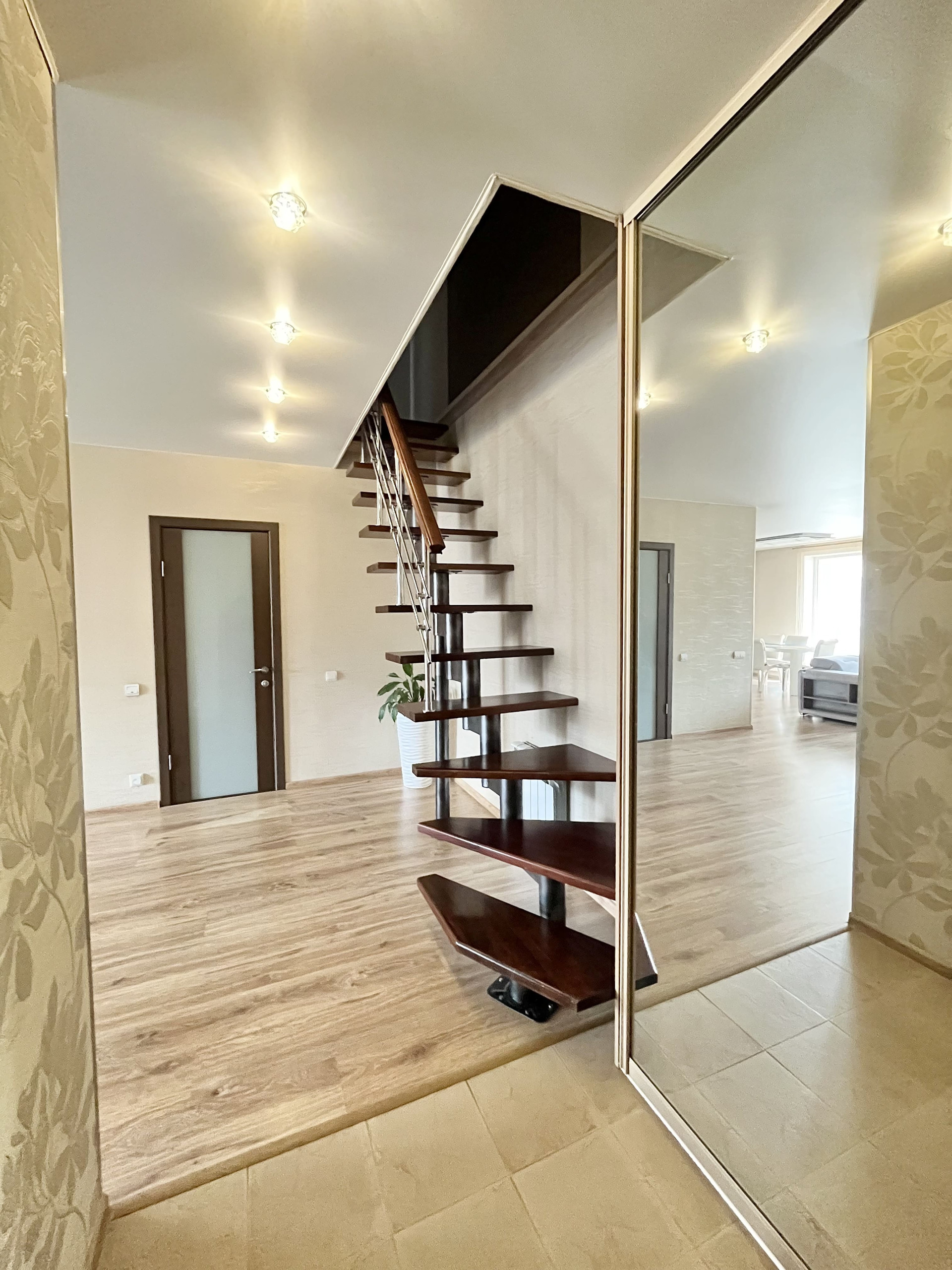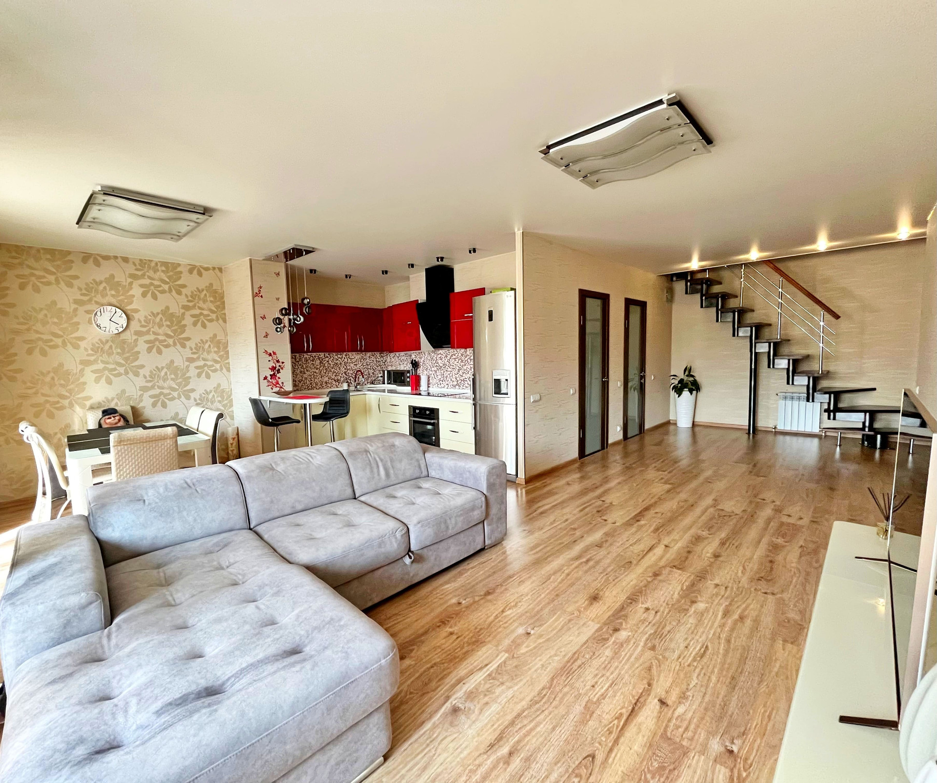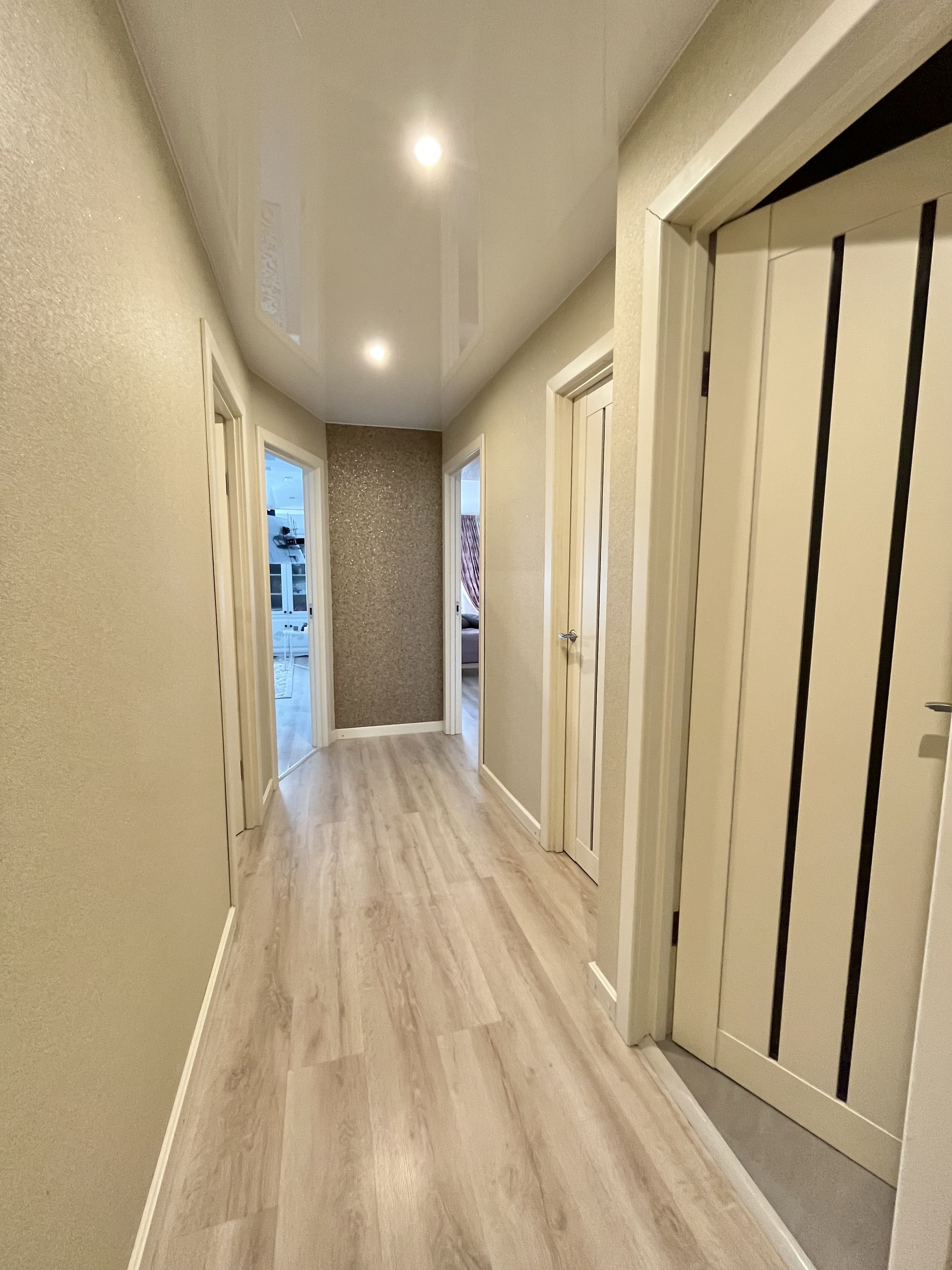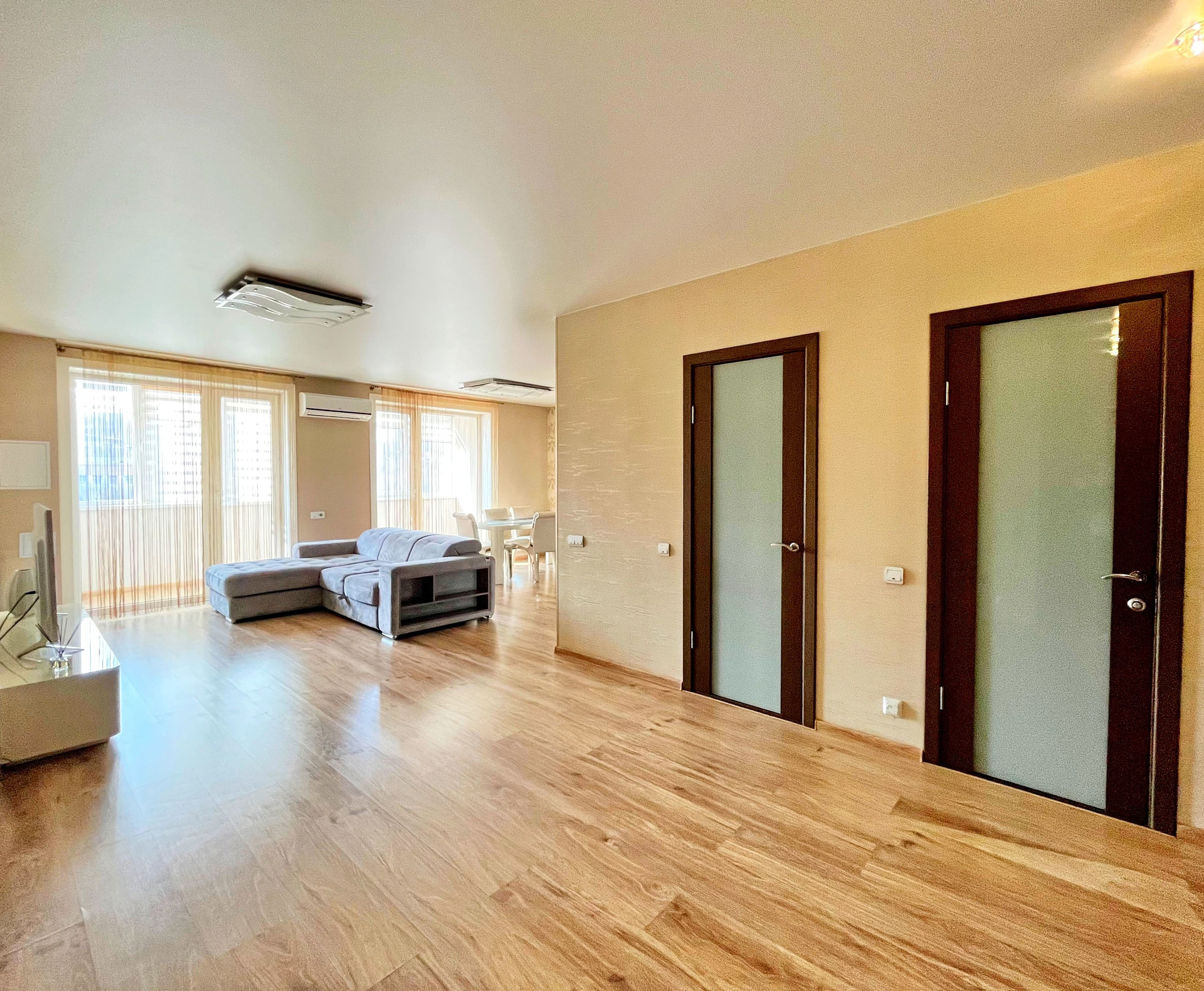 Входная дверь Гардиан (с хорошей шумоизоляцией и интересным 3D дизайном), качественные межкомнатные двери, натяжные потолки, софиты, красивые светильники, на полу качественный ламинат, 2 кондиционера.