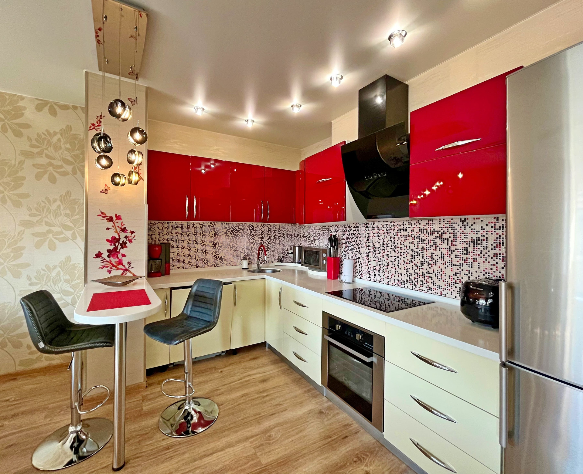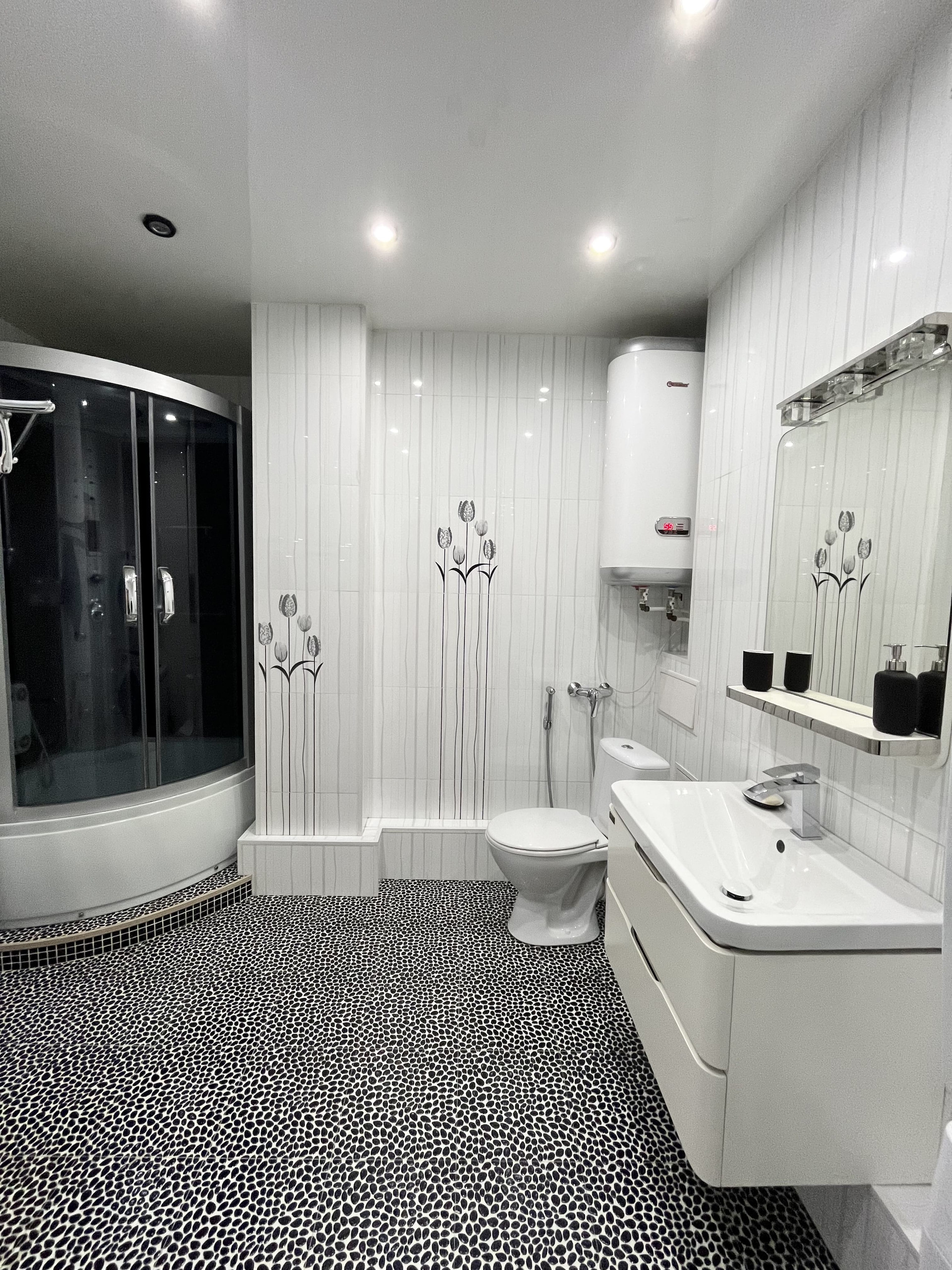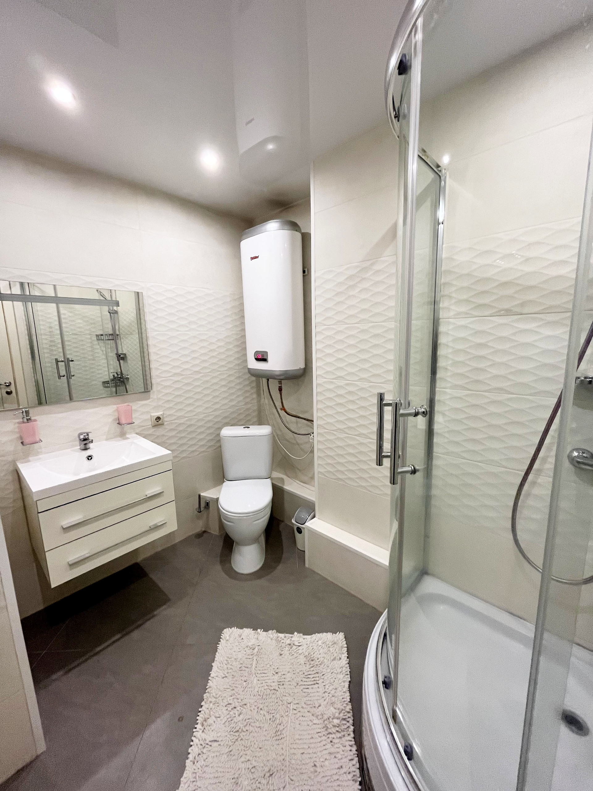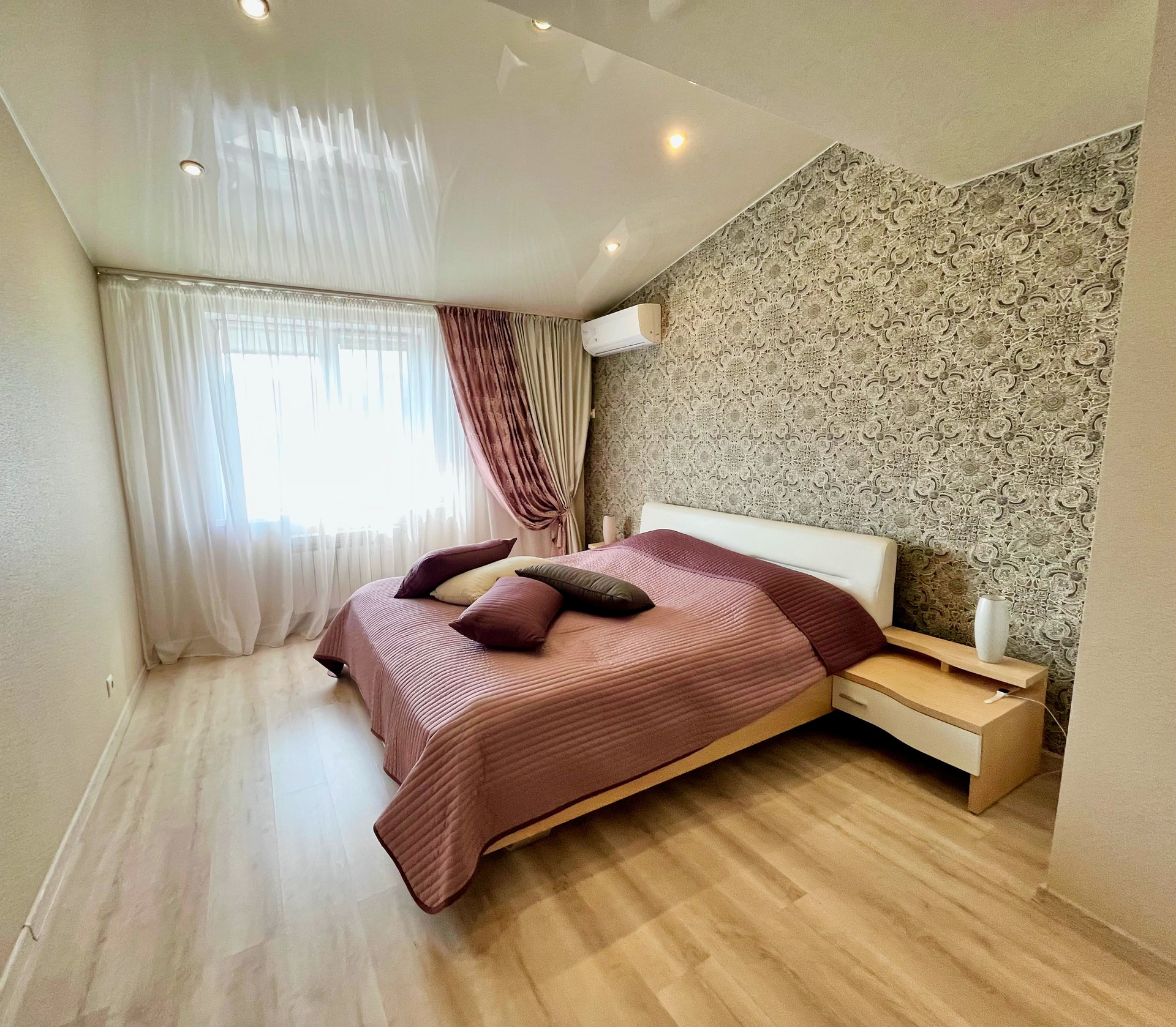 Входная дверь Гардиан (с хорошей шумоизоляцией и интересным 3D дизайном), качественные межкомнатные двери, натяжные потолки, софиты, красивые светильники, на полу качественный ламинат, 2 кондиционера.