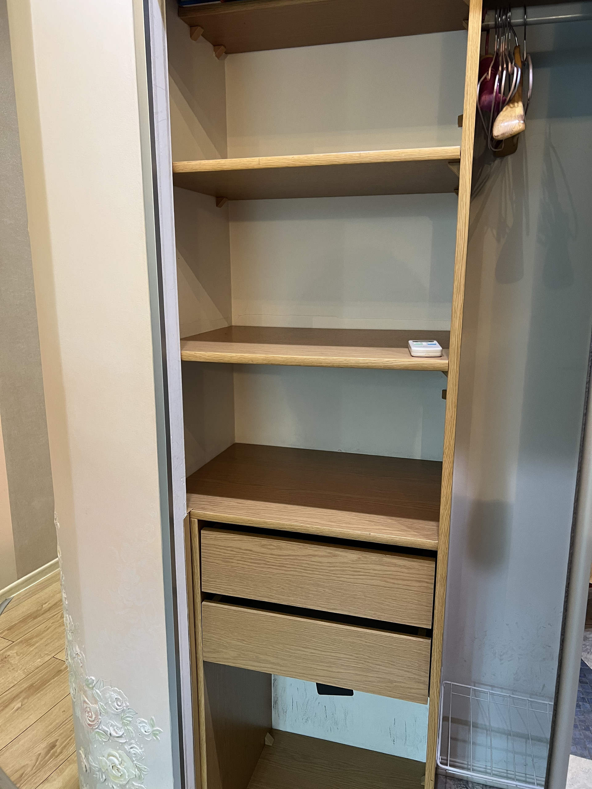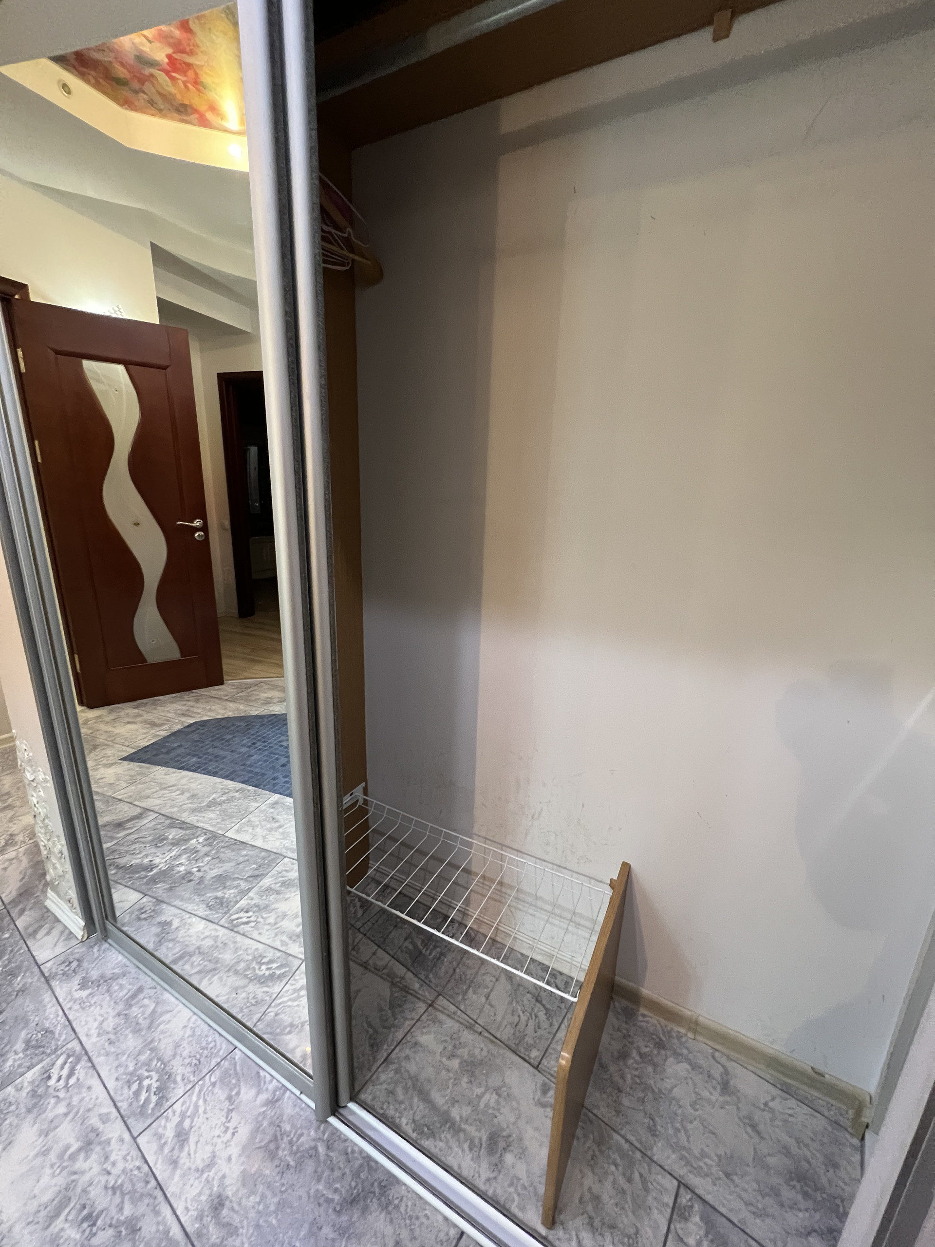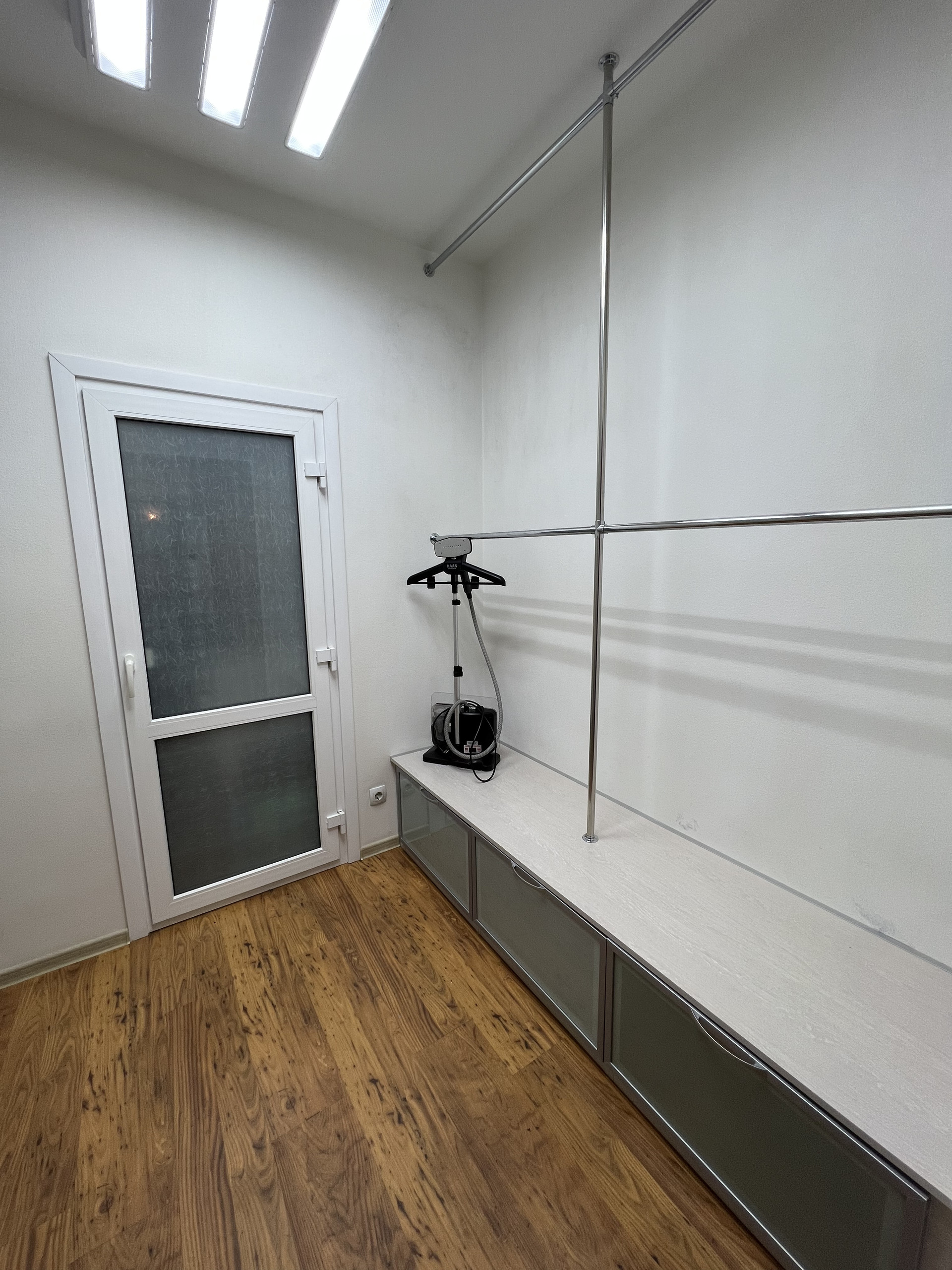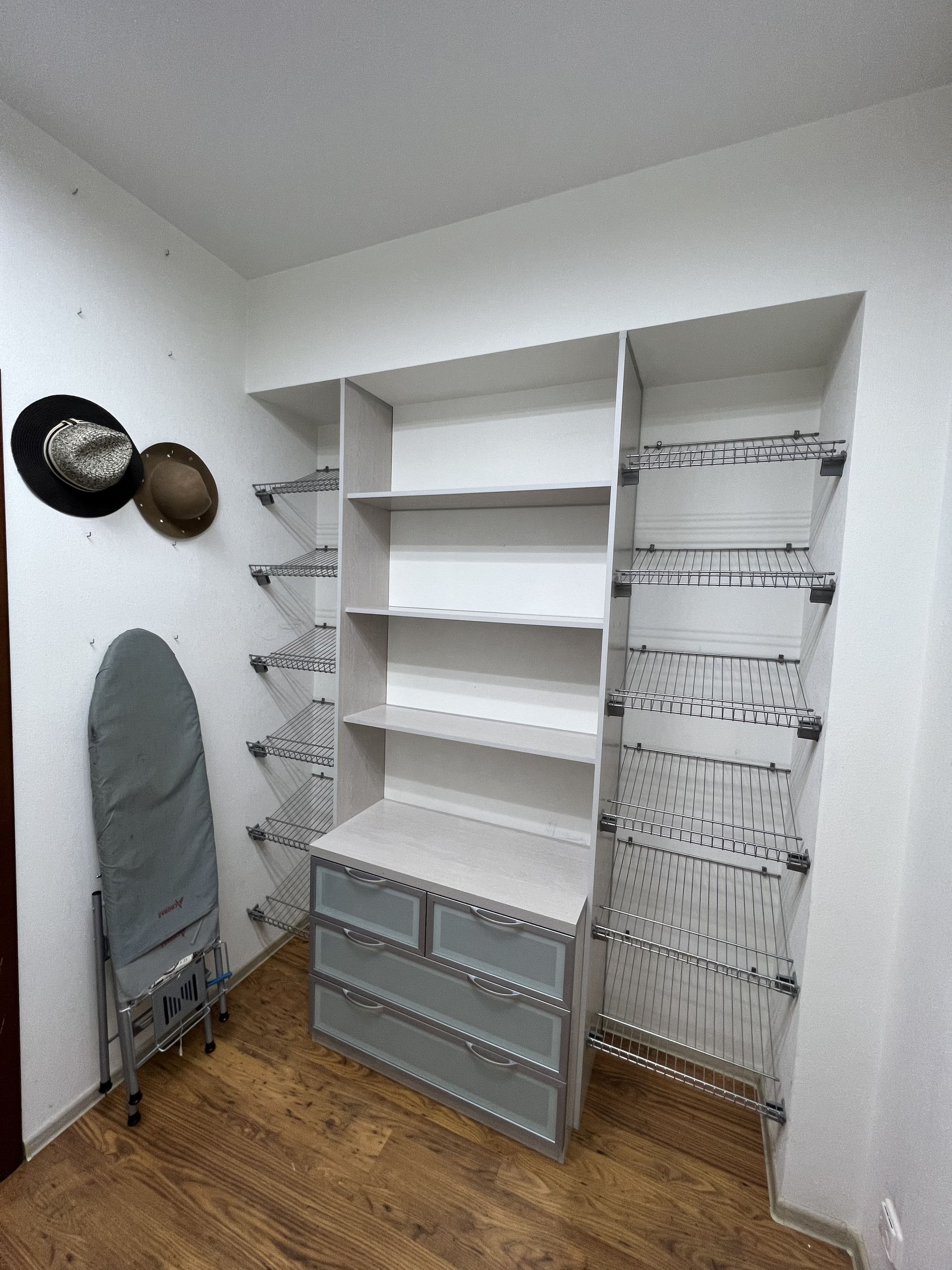 Гардеробная вместит в себя все ваши вещи . Есть места под плечики , а так же обувь и личные вещи .