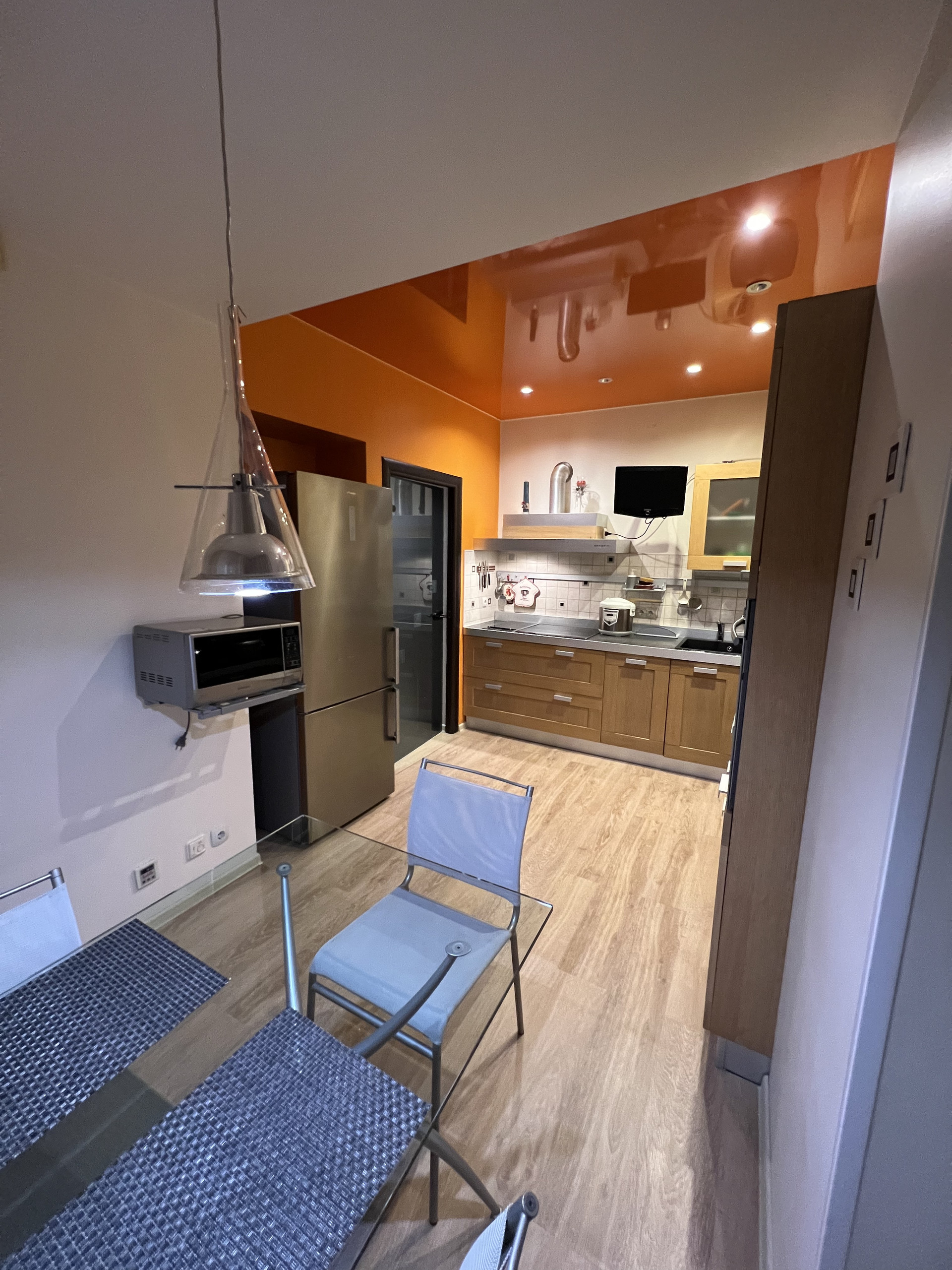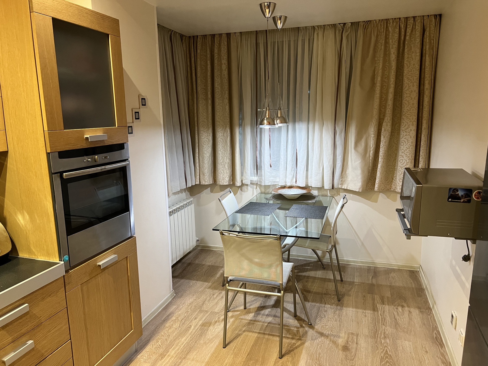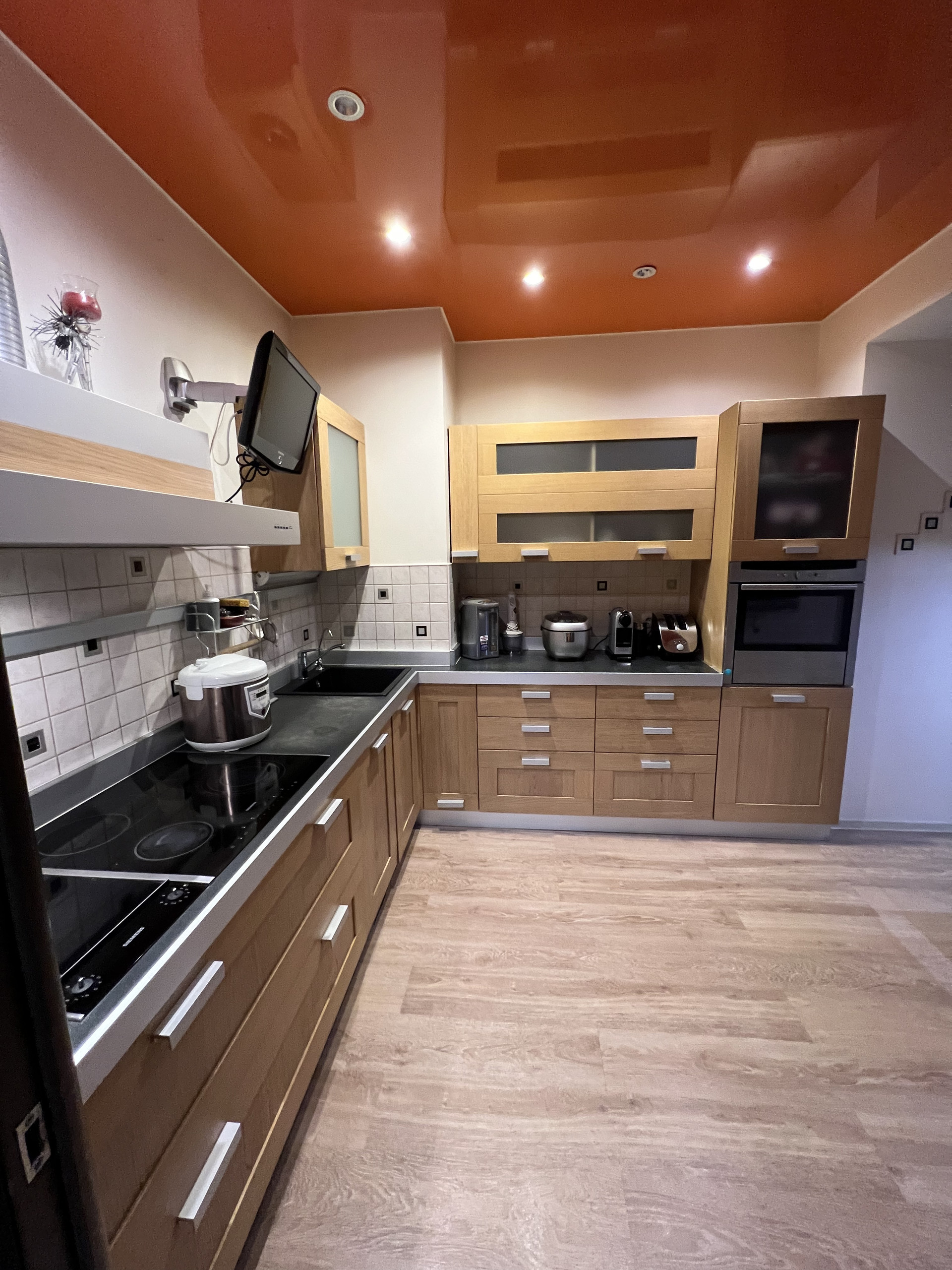 Кухня имеет особенную ауру , в которой хочется с удовольствием находится . Качественная фирменная техника , встроенные духовой шкаф и варочная панель.