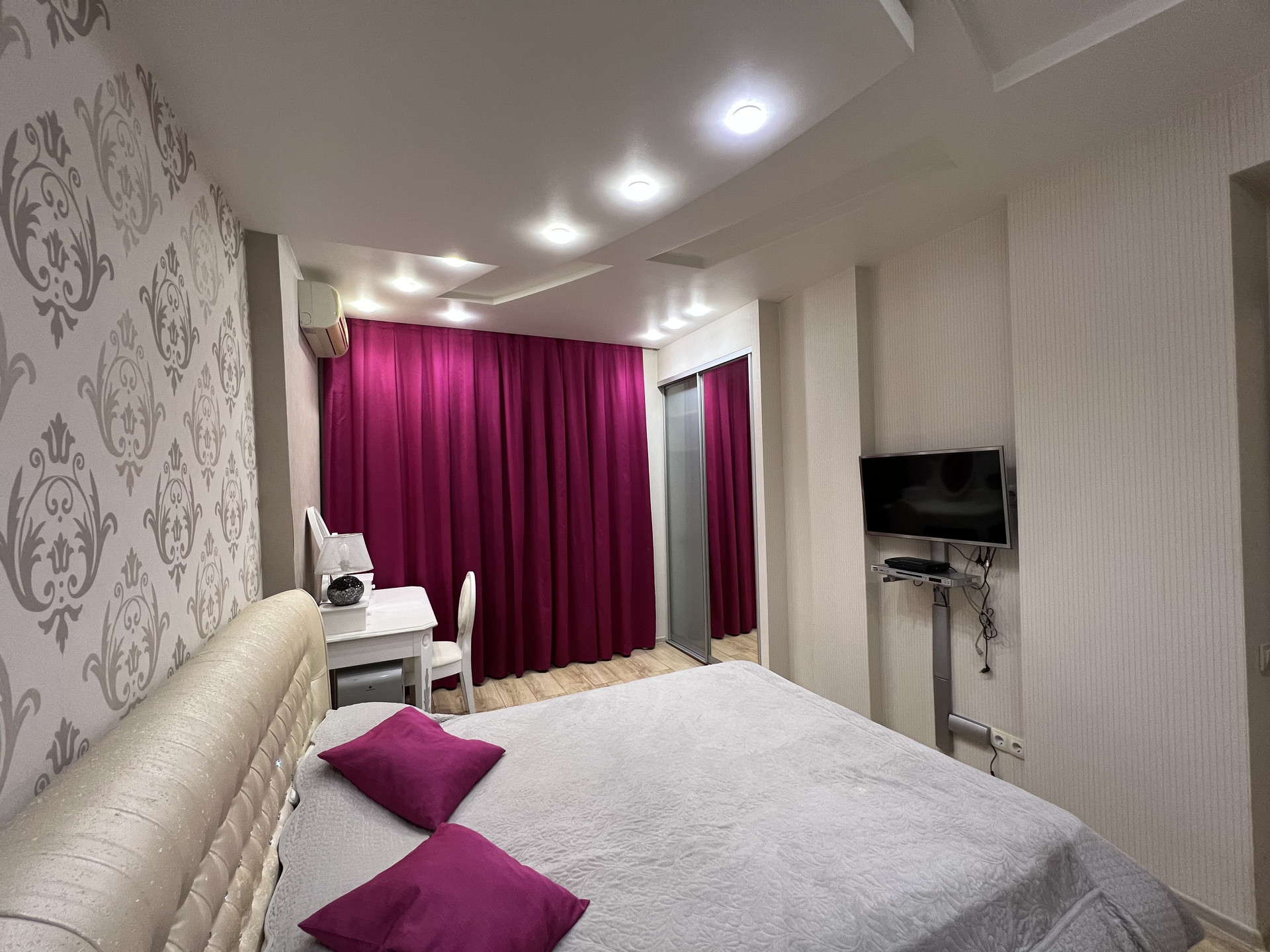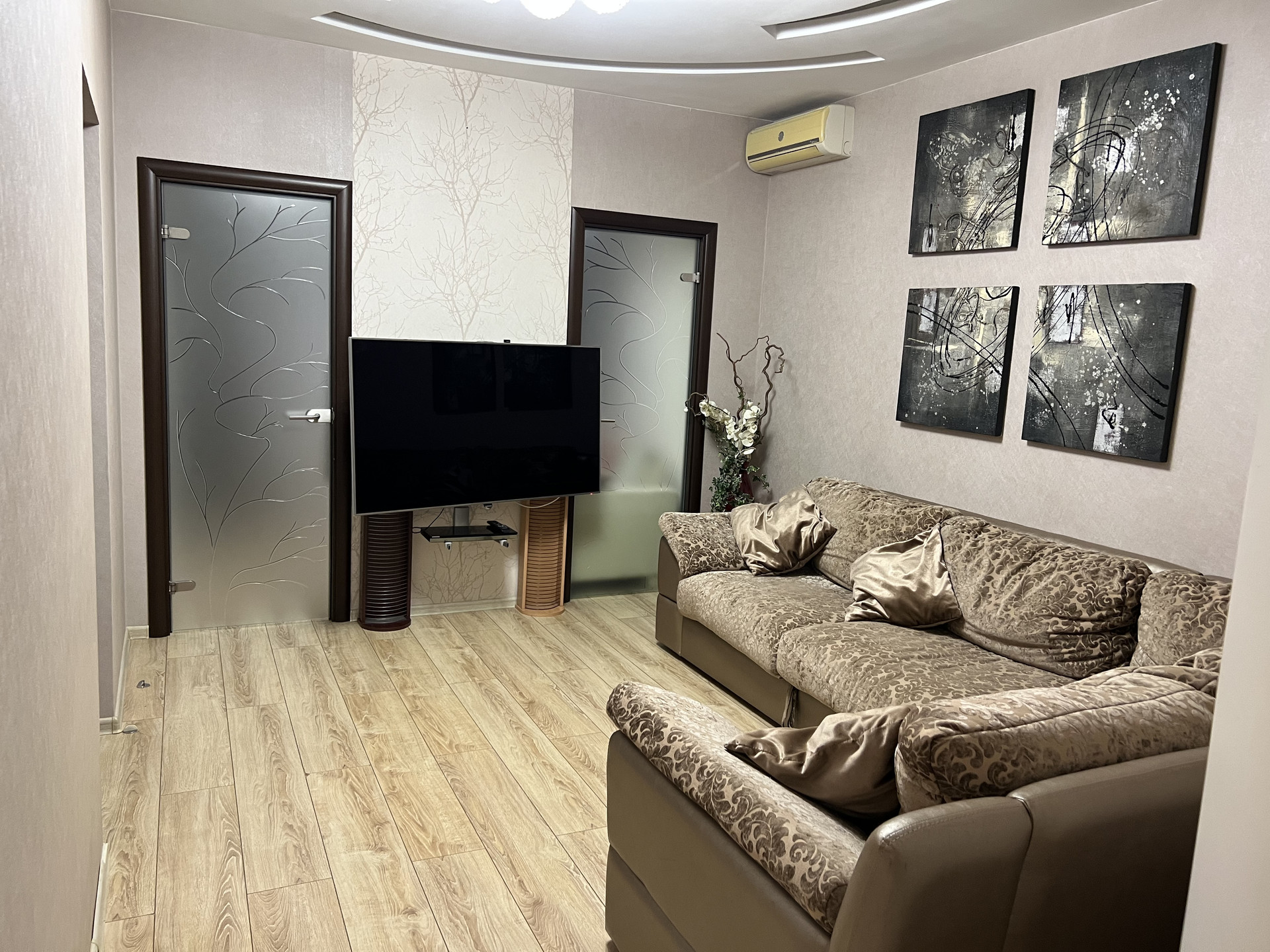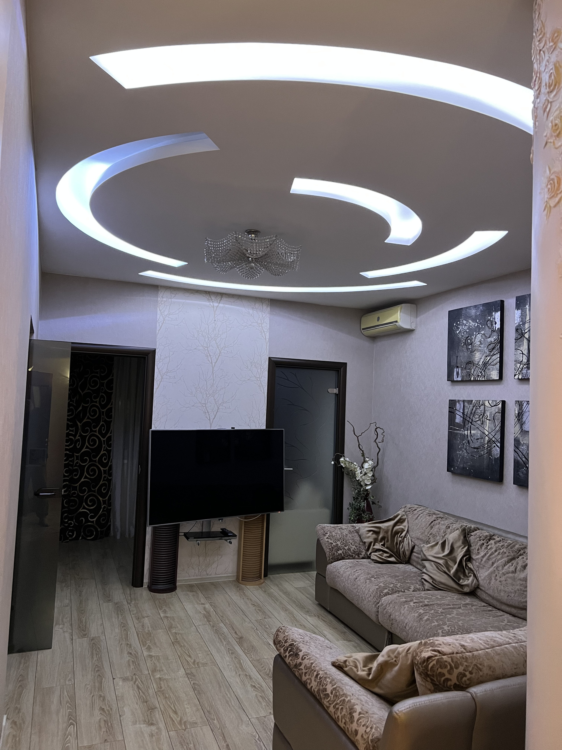 В каждой комнате стоит кондиционер , теплый пол германского производства. Так же комнаты имеют собственное ТV . Качественный паркет , встроеные шкафы , а так же потолки по дизайн проекту с большим количеством качественного света.