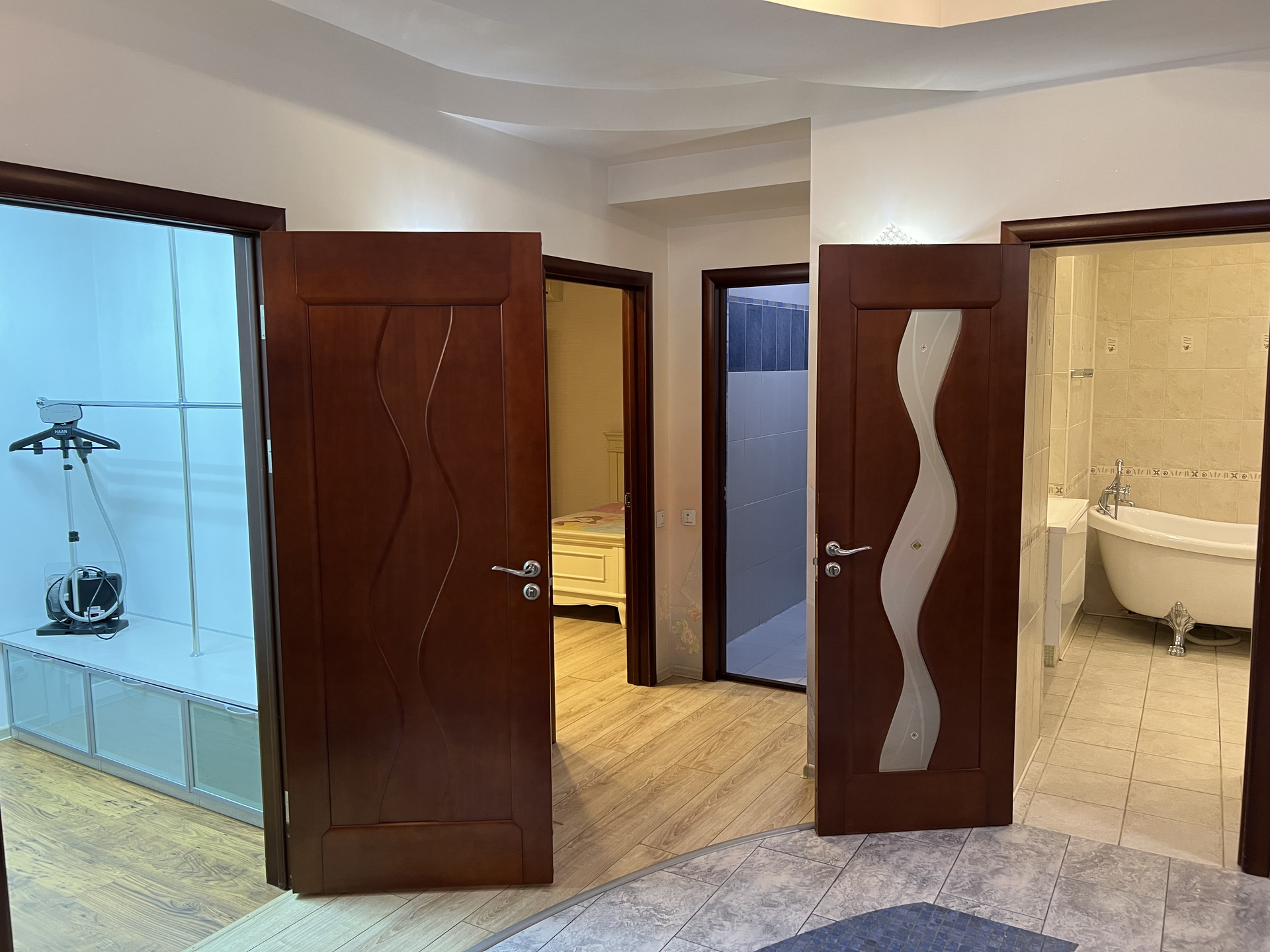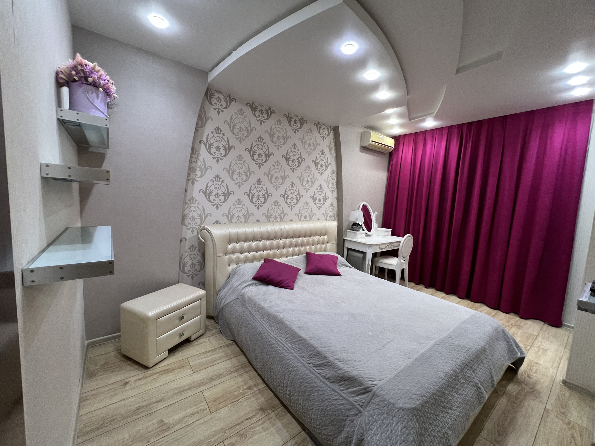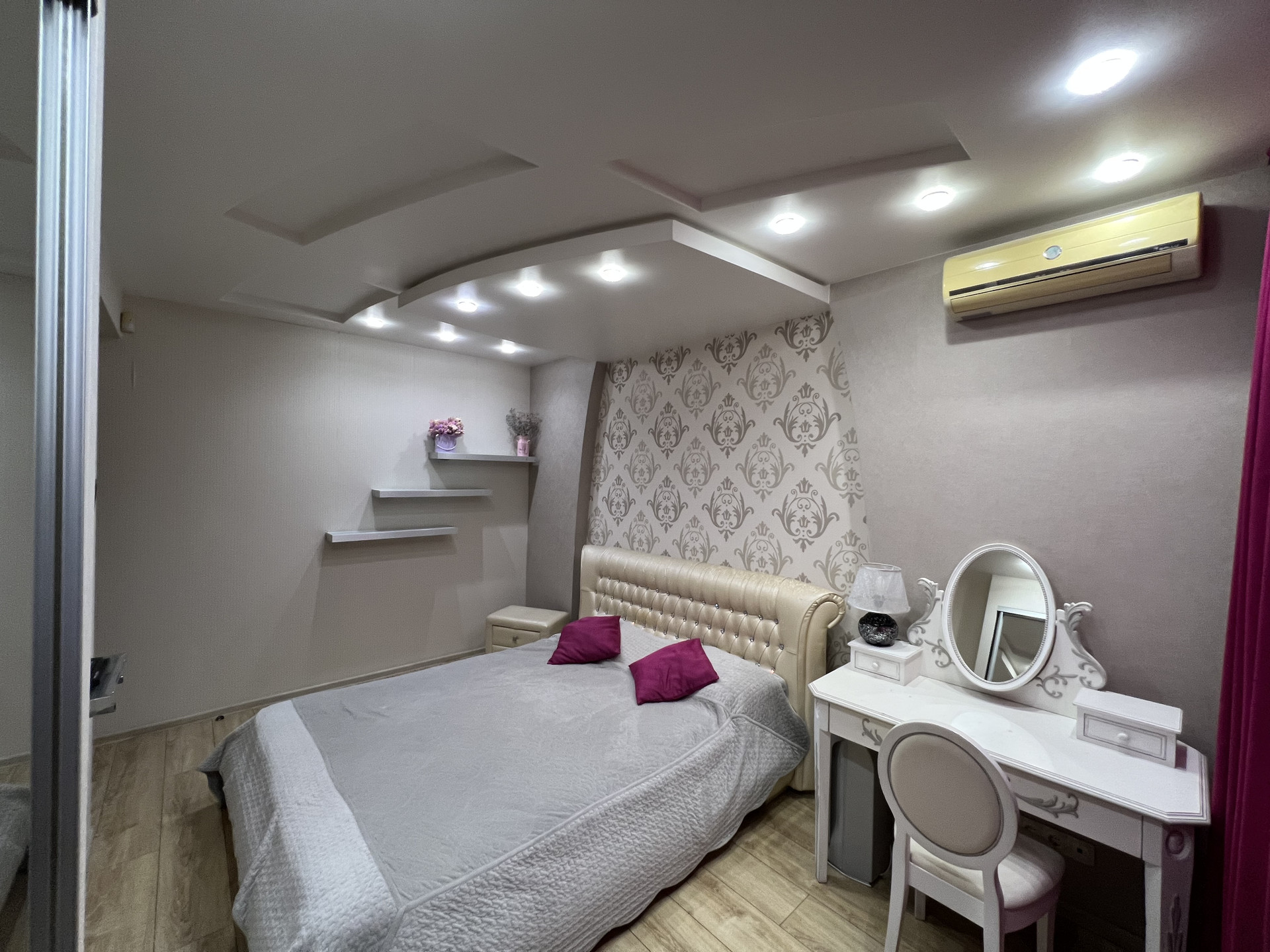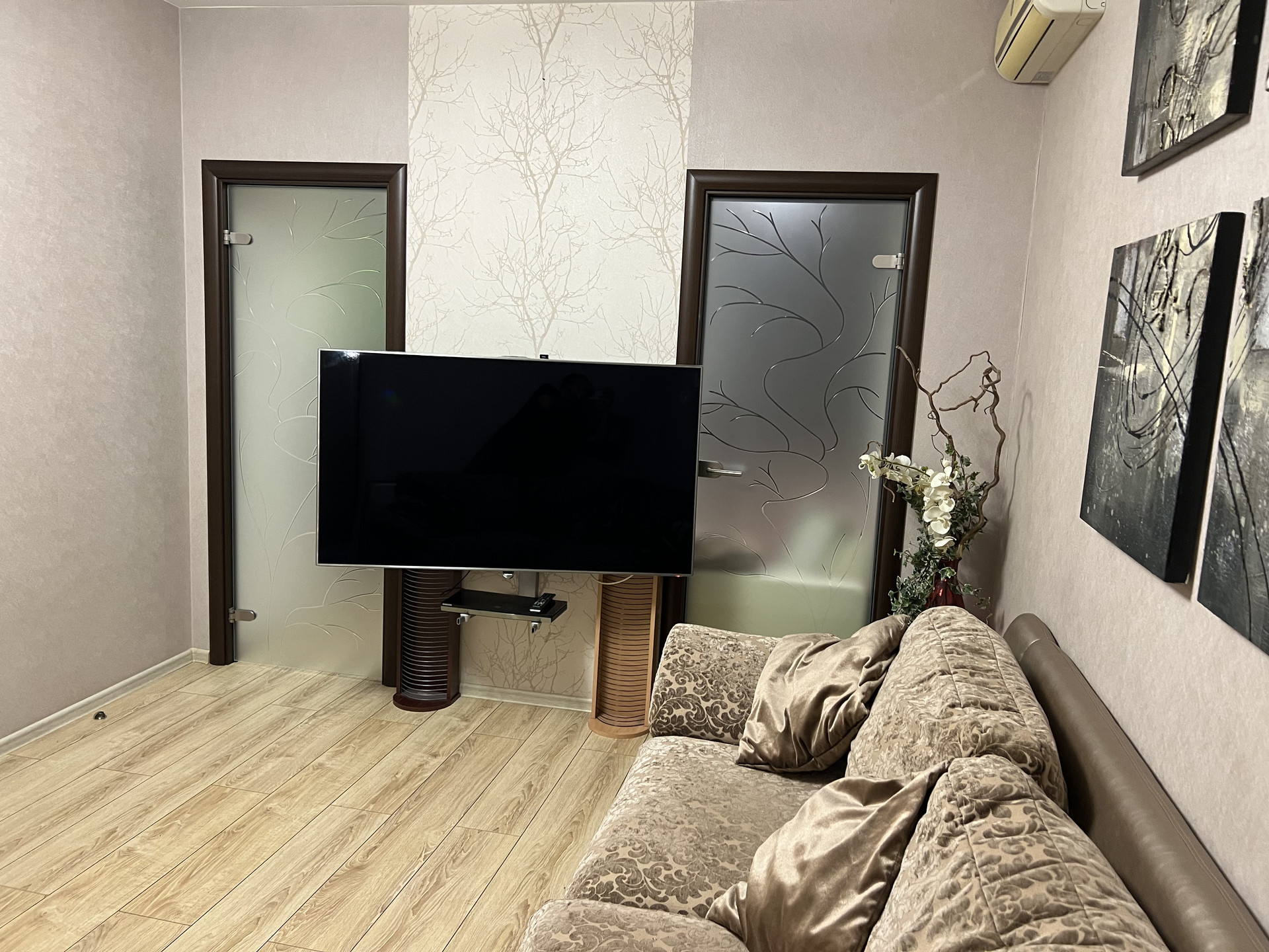 В каждой комнате стоит кондиционер , теплый пол германского производства. Так же комнаты имеют собственное ТV . Качественный паркет , встроеные шкафы , а так же потолки по дизайн проекту с большим количеством качественного света.