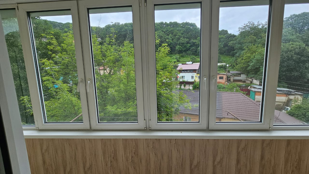 Большая застекленная (пластиковыми окнами) лоджия (с кладовкой).