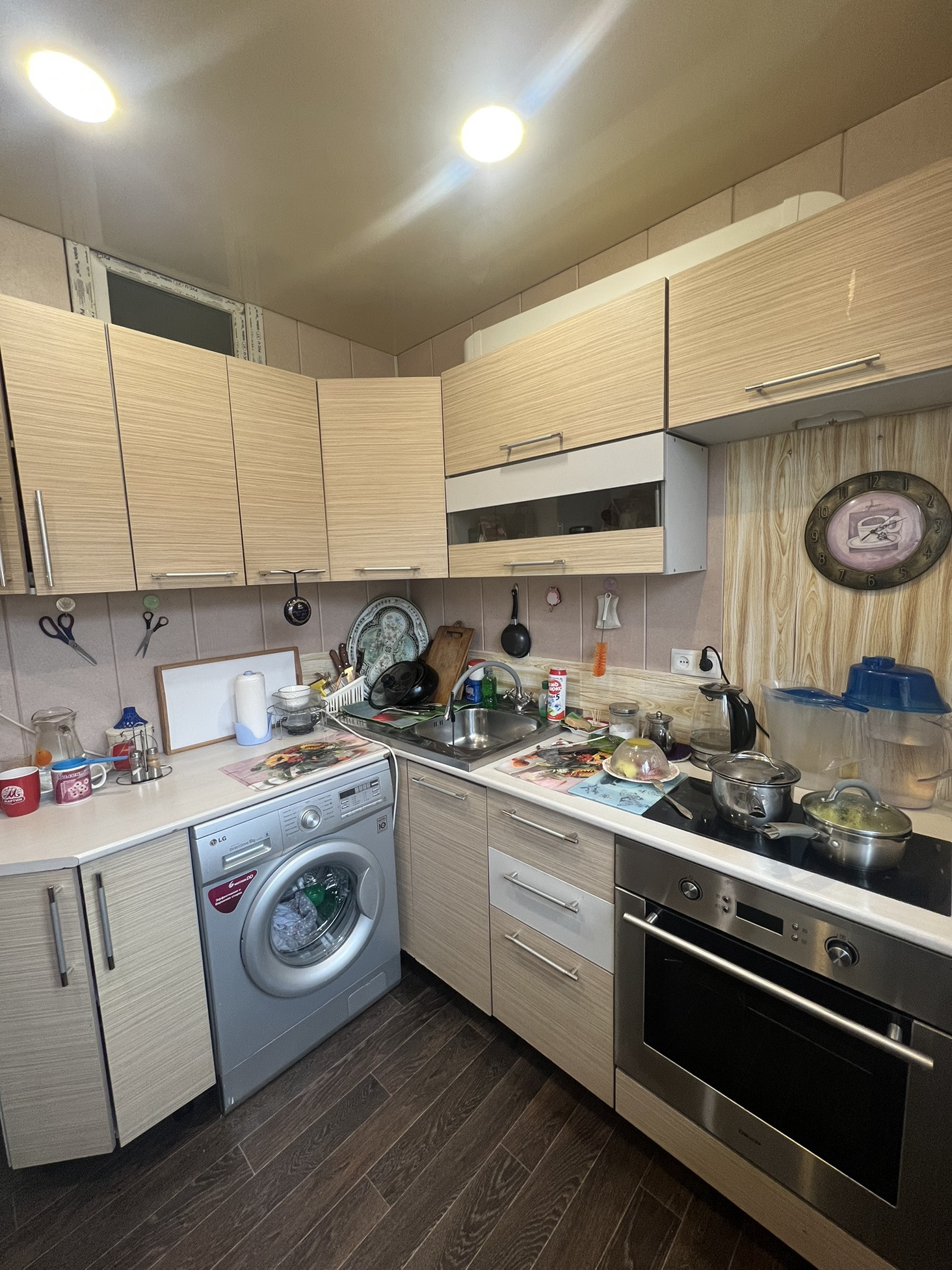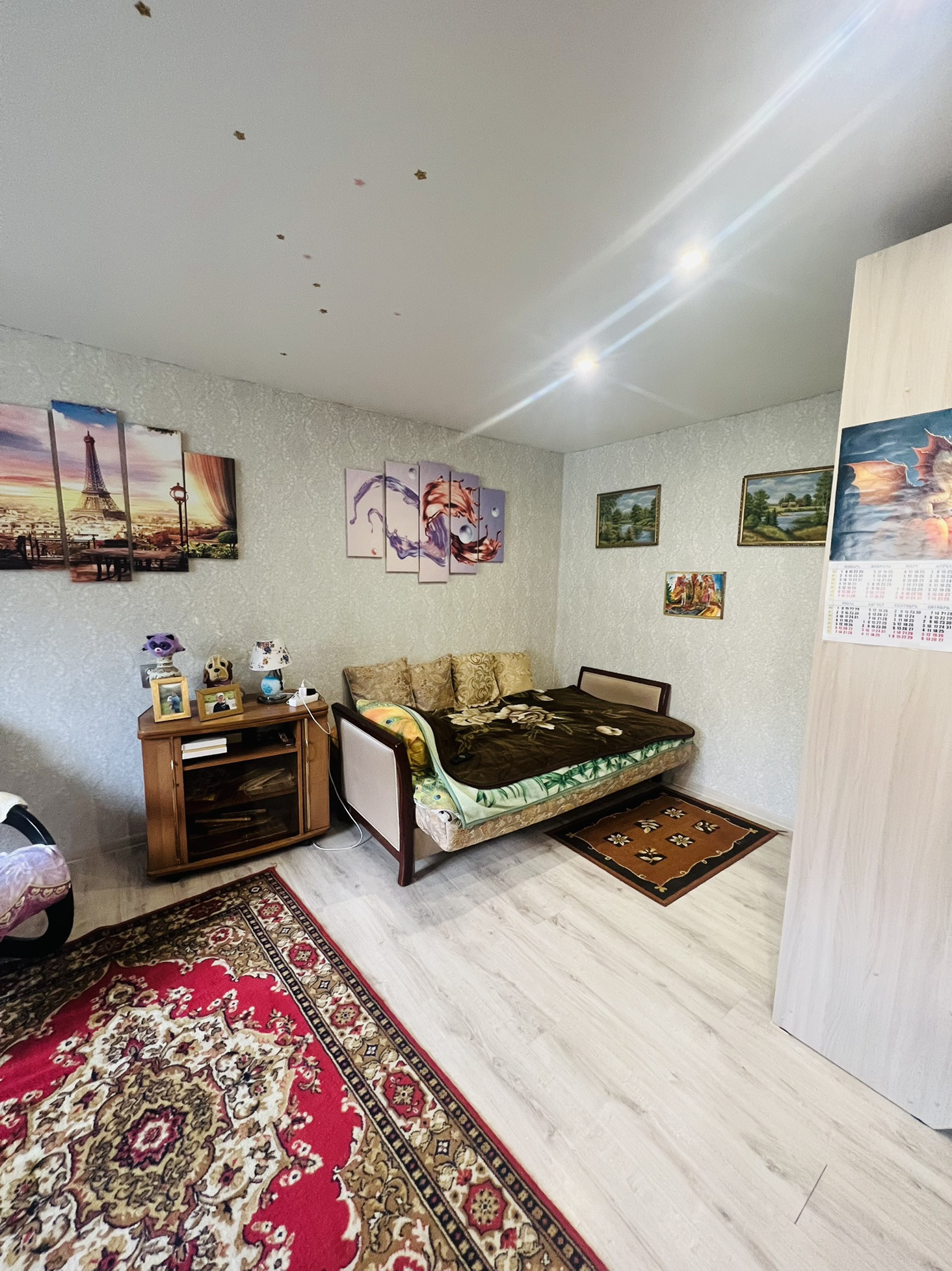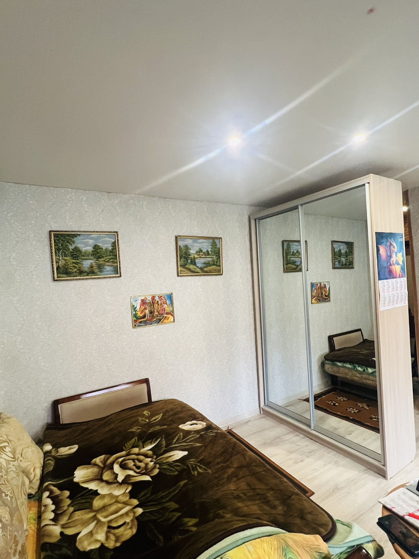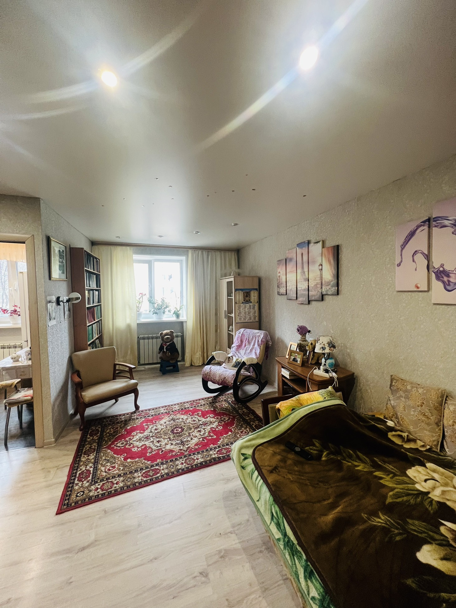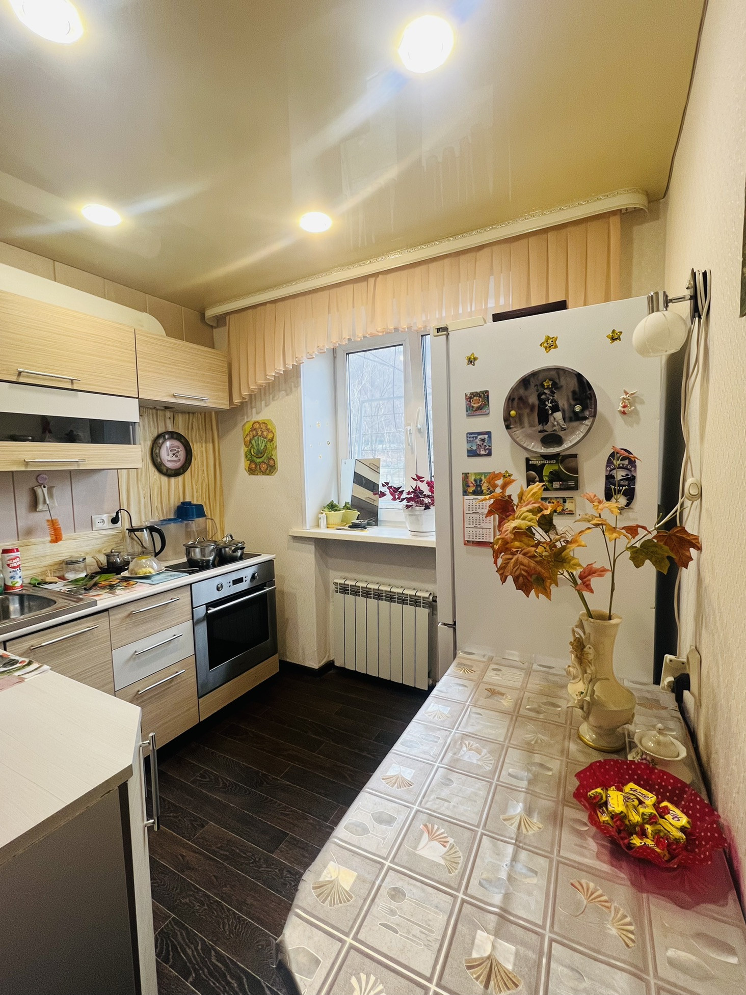 Новая Железная дверь, Ламинат, Натяжной потолок и софиты. Окна пластиковые, Межкомнатные двери. Стены выровнены. Радиаторы отопления заменены, также заменена сантехника в сан.узле, и элек.проводка в квартире.