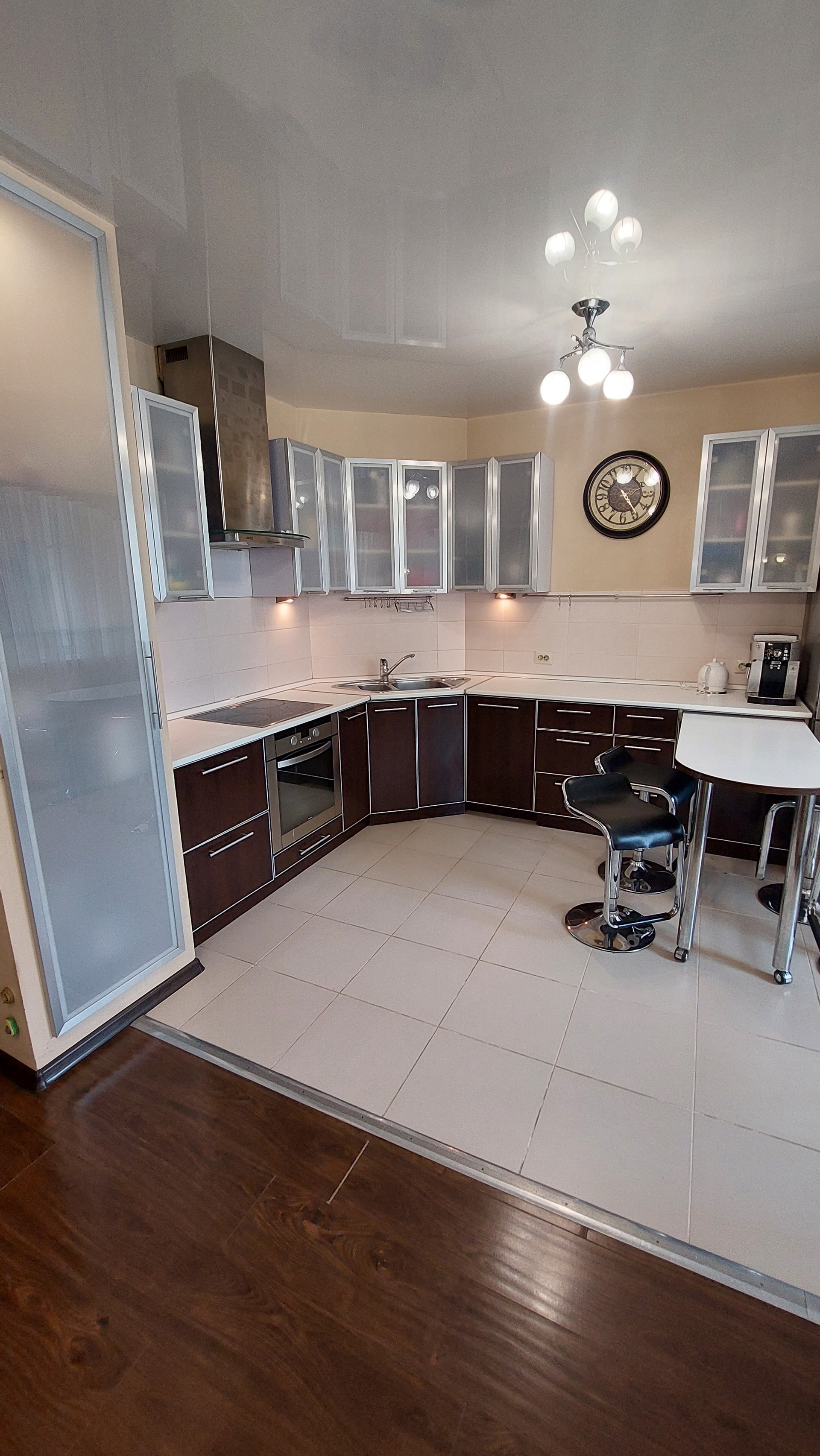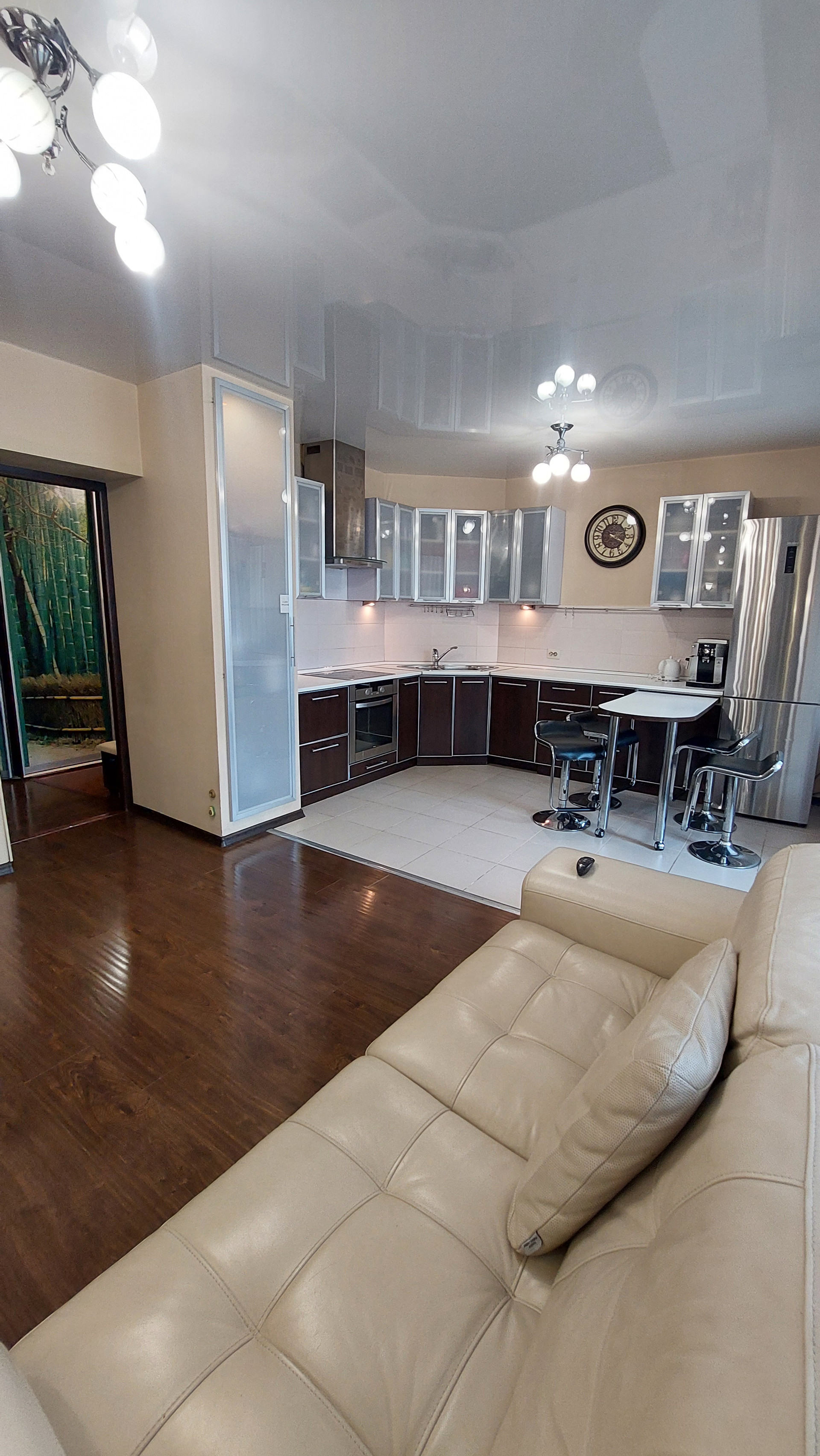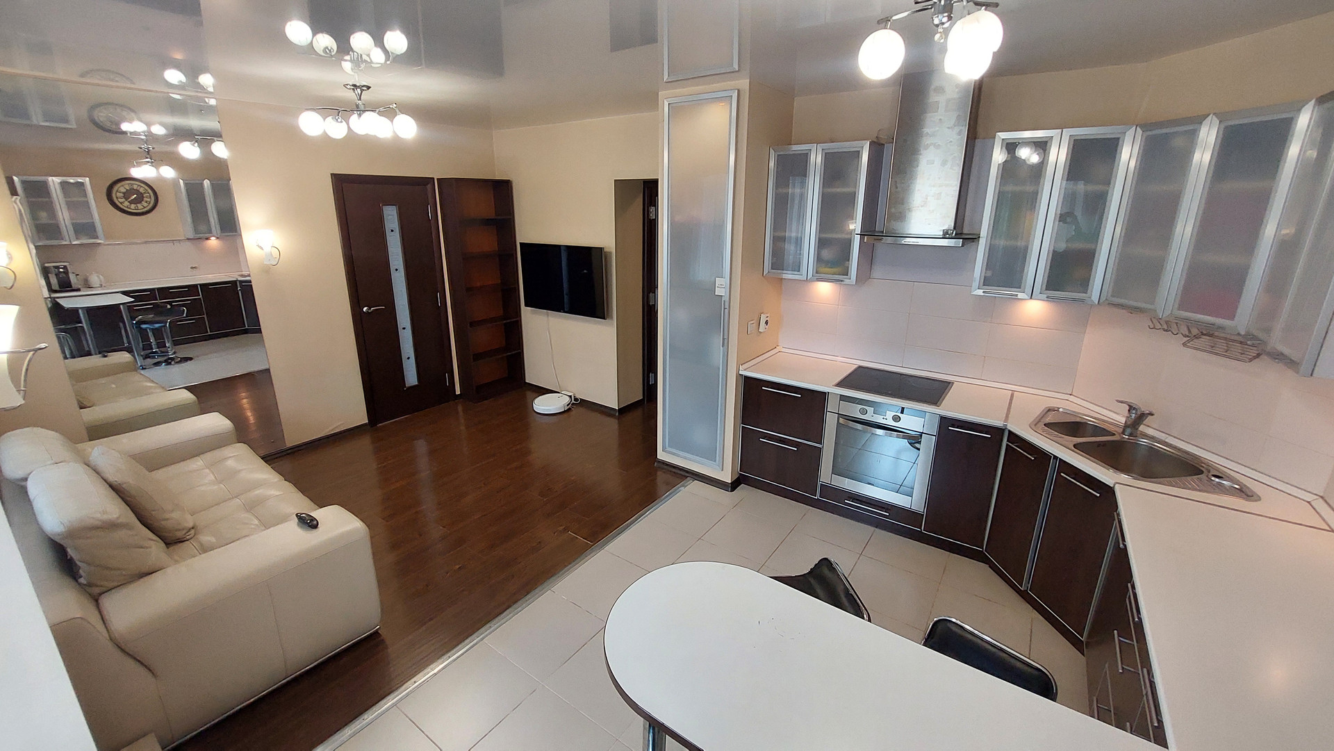 Кухня: кухонный гарнитур, выдвижная барная стойка, посудомоечная машинка, варочная панель, духовой шкаф, вытяжка, холодильник, диван.