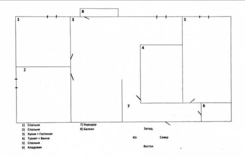 Кухня-гостиная, 3 спальни, балкон, кладовка, совмещенный санузел.