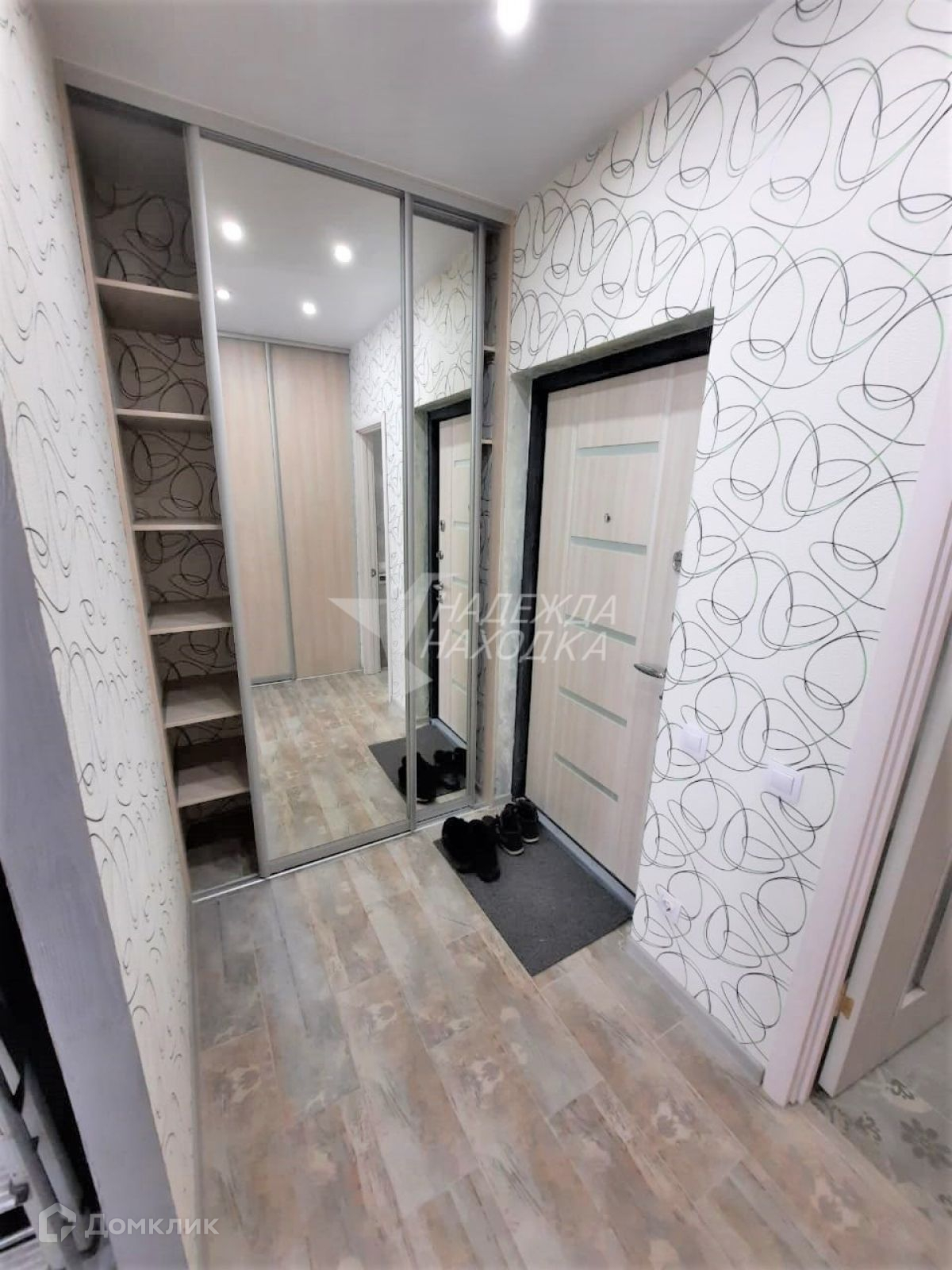 Лоджия застеклена., Гардеробная, Железная дверь, Ламинат, Натяжной потолок, Пластиковые окна, Софиты, Стены выровнены.