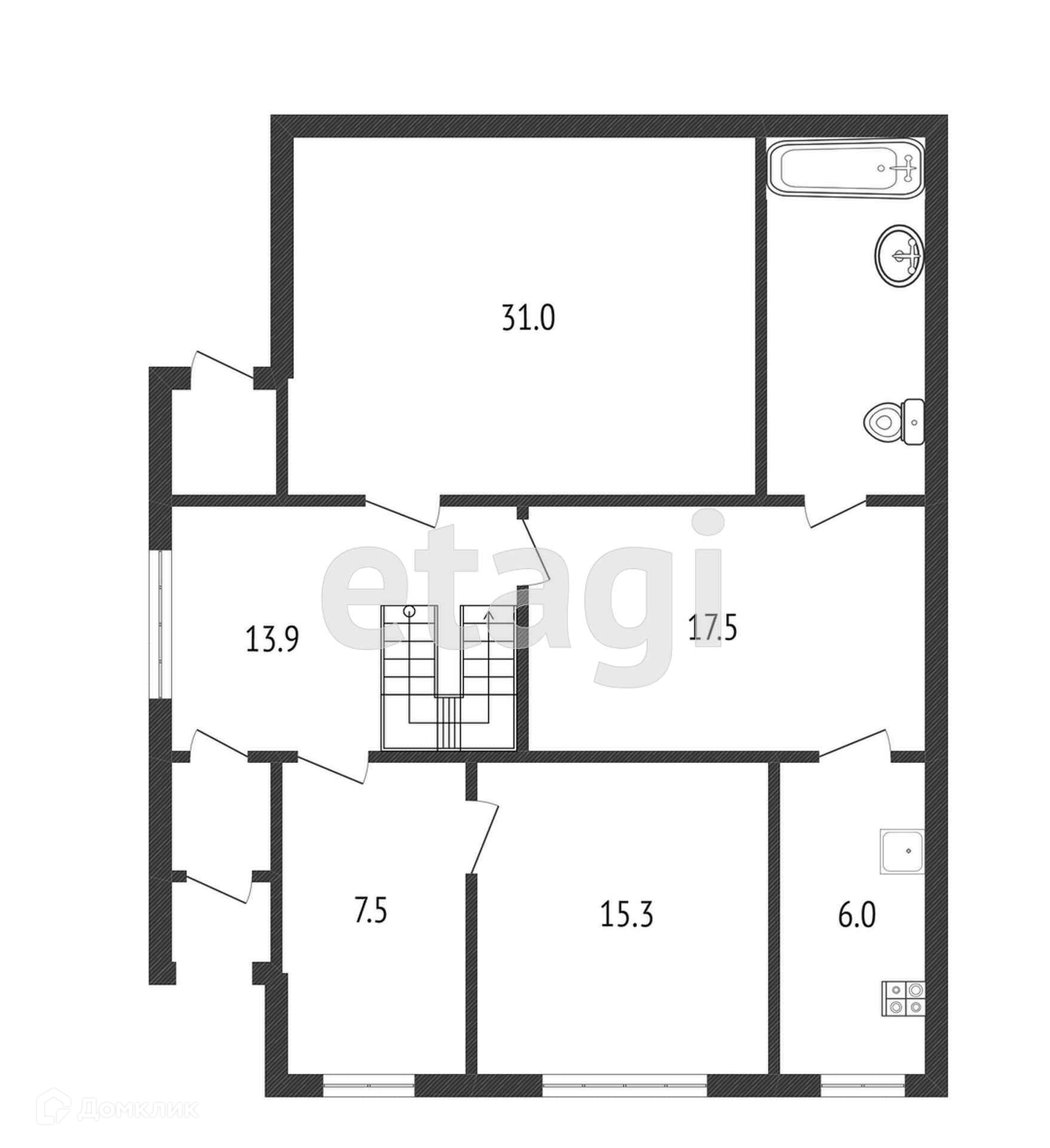 Три комнаты, столовая, санузел, кухня расположены на первом этаже, и две спальни на втором этаже.