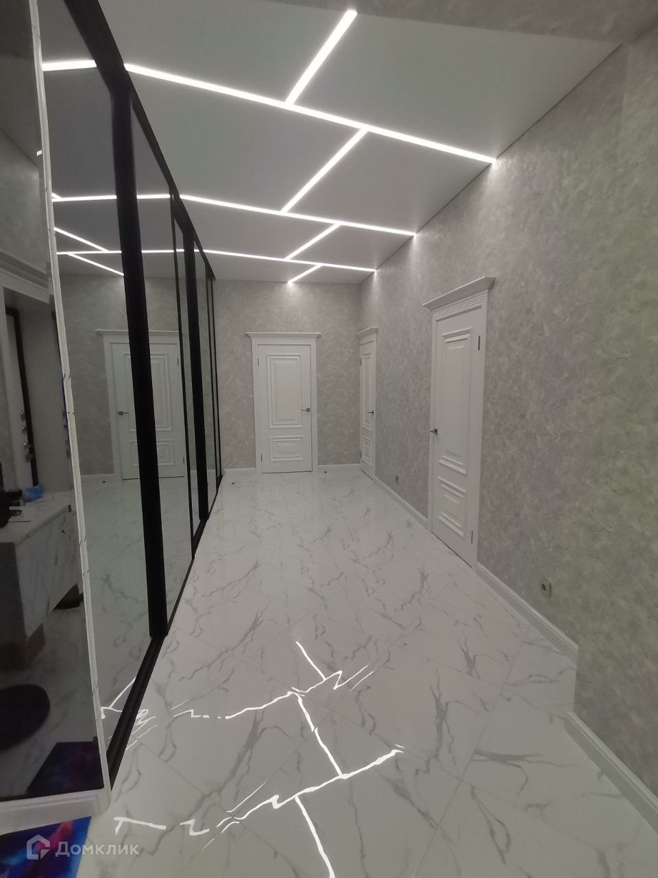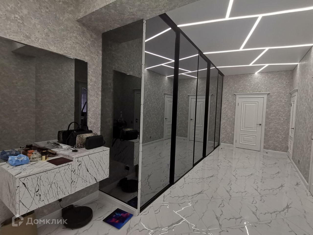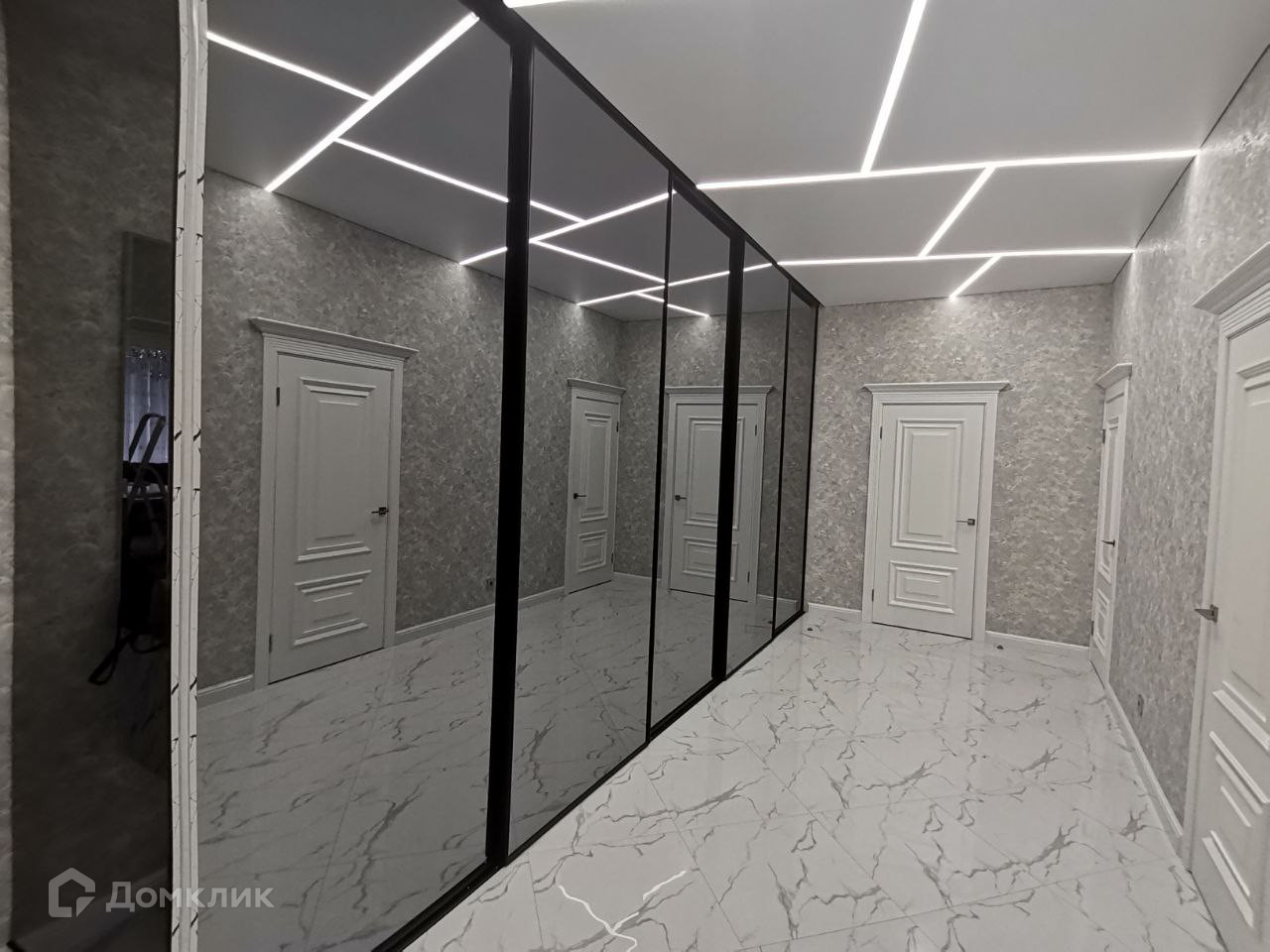 В указанном выше просторном холле на всю длину и высоту установлен винтажный раздвижной шкаф - купе чёрного цвета, в рамках которого установлены уникальные стекла. При открытии шкафа - купе, автоматически включается диодная подсветка. Данный шкаф представляет собой ту же самую гардеробную комнату только стоящую отдельно и закрытую дверцами, так как из-за его масшатов во всю длину и ширину, туда можно уместить большое количество вещей и предметов.