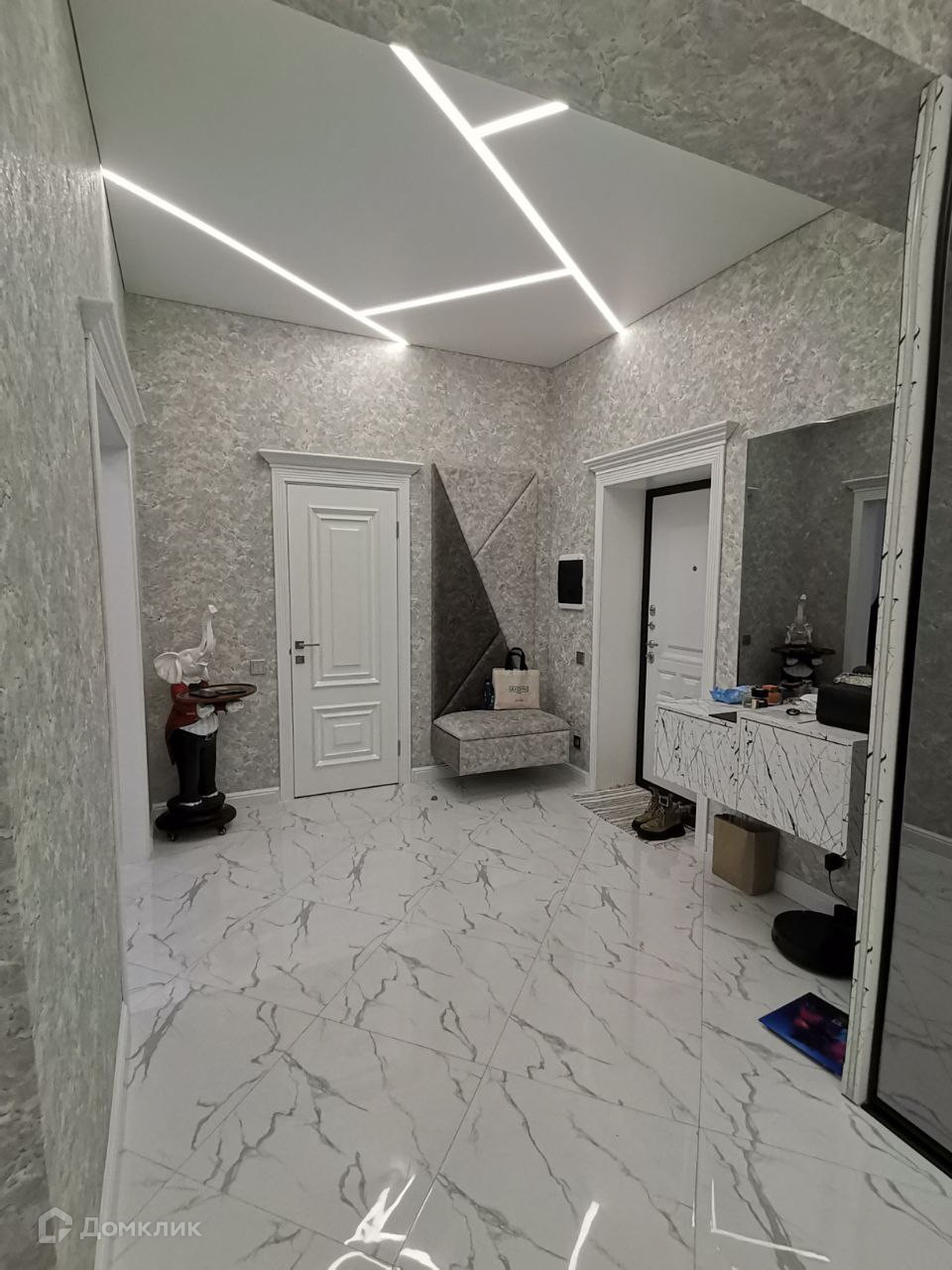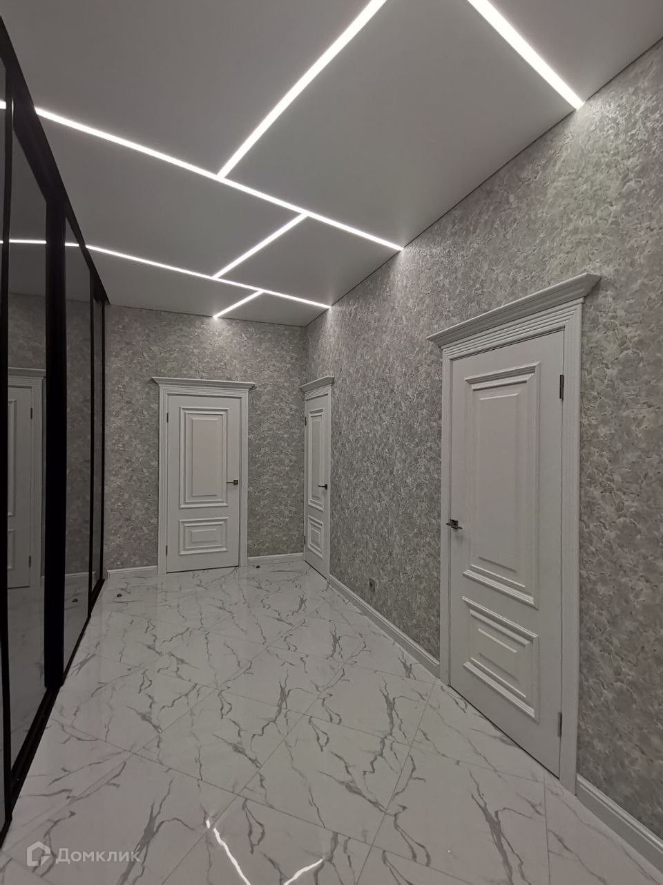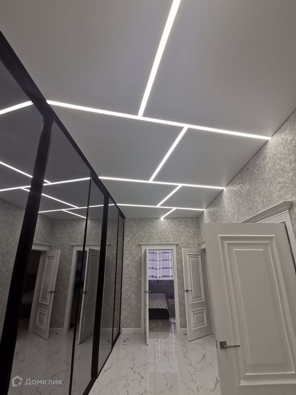 В указанном выше просторном холле на всю длину и высоту установлен винтажный раздвижной шкаф - купе чёрного цвета, в рамках которого установлены уникальные стекла. При открытии шкафа - купе, автоматически включается диодная подсветка. Данный шкаф представляет собой ту же самую гардеробную комнату только стоящую отдельно и закрытую дверцами, так как из-за его масшатов во всю длину и ширину, туда можно уместить большое количество вещей и предметов.