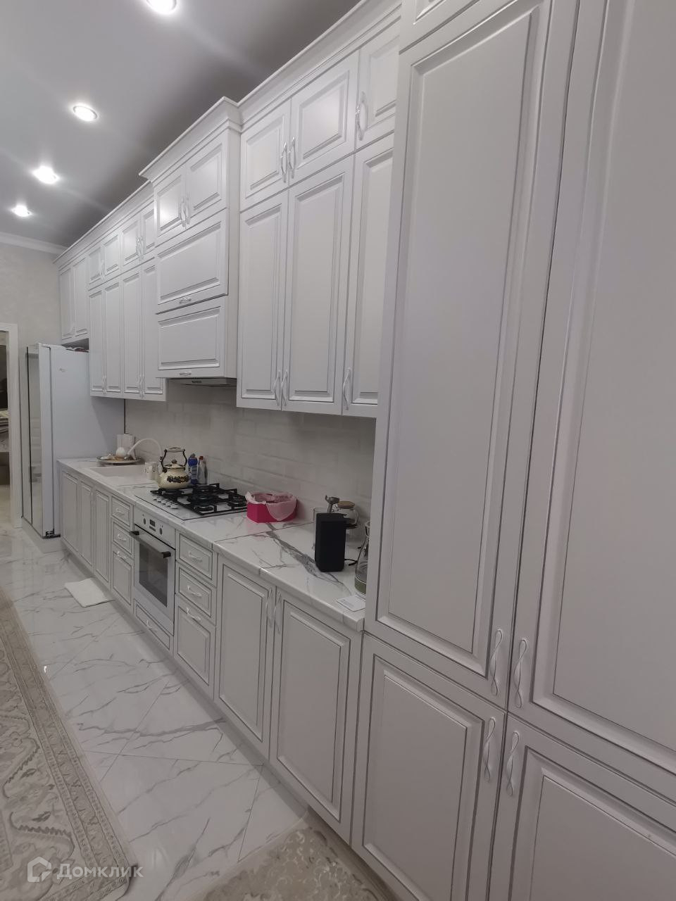 Кухня-зал передаёт своим видом ту самую изысканность переданную в словах выше о светлых тонах. Установленная на всю длину качественная кухонная мебель добавляет в общем представлении спокойных оттенков. В этом направлении дизайна каждая деталь и общее впечатление дышат благородством.