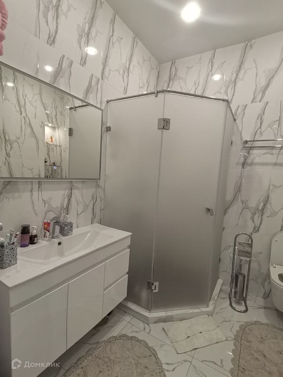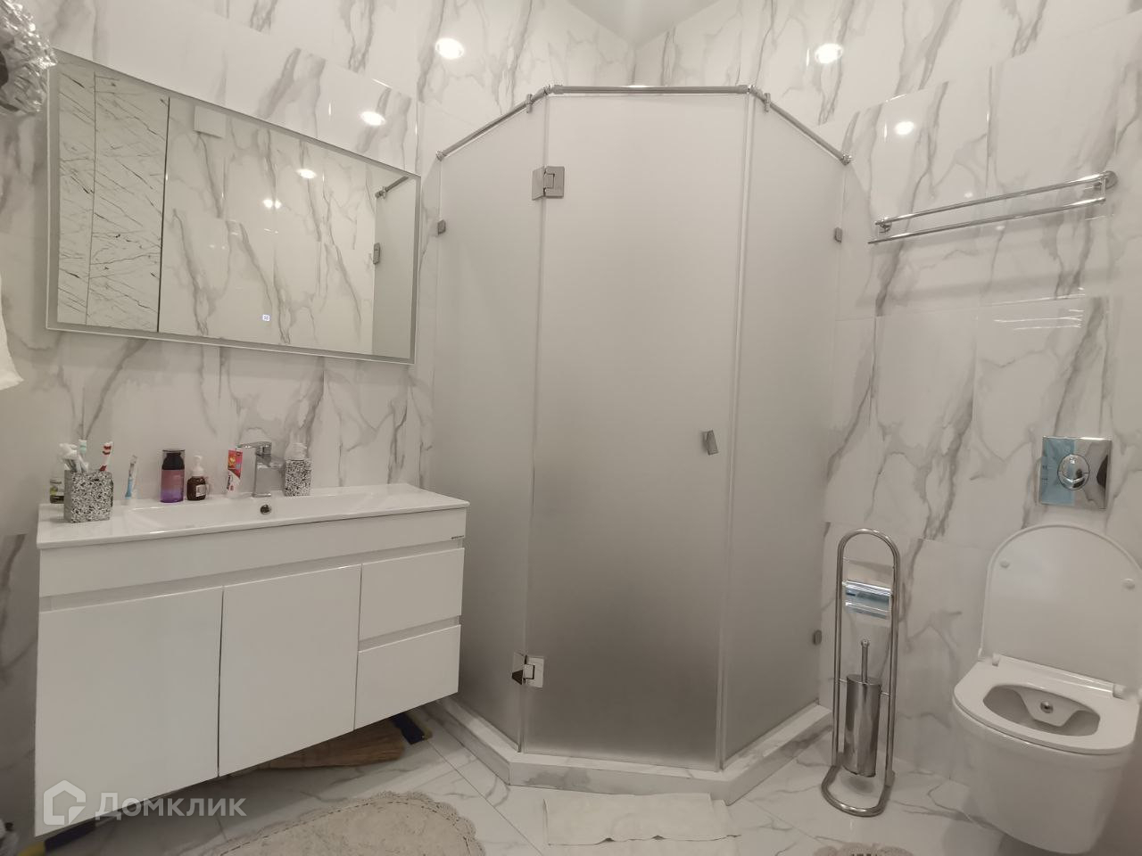 Сануезел выполнен также с нотой дизайна, везде светлые тона, установлена душевая кабина, большое зеркало с подсветкой.