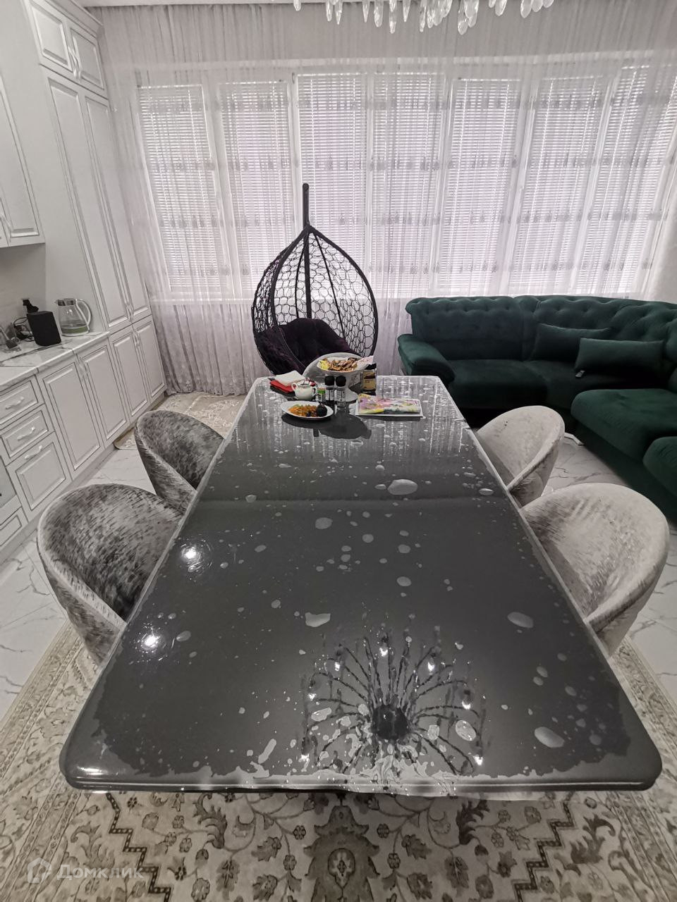 Посередине кухни расположены обеденный стол и стулья. Обязательный элемент на кухне в классическом интерьере. Это центр всей композиции, поэтому эта зона дополнительно освещается светом и присутствуем ковра. Вся техника импортная, качественная.