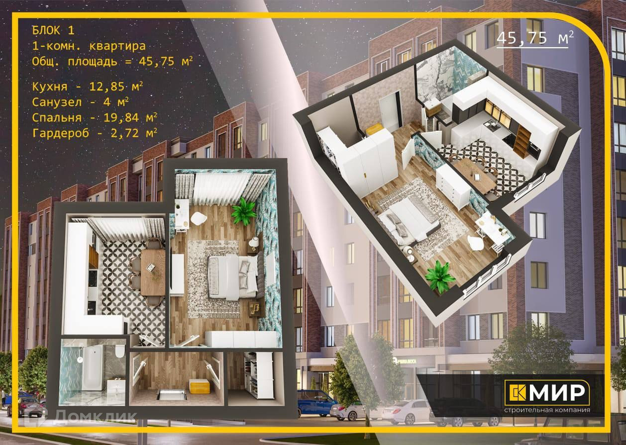 1-комнатная квартира, 45.75 м2, этаж 3 / 8, на продажу в Нальчике, Кабардинская улица, 1