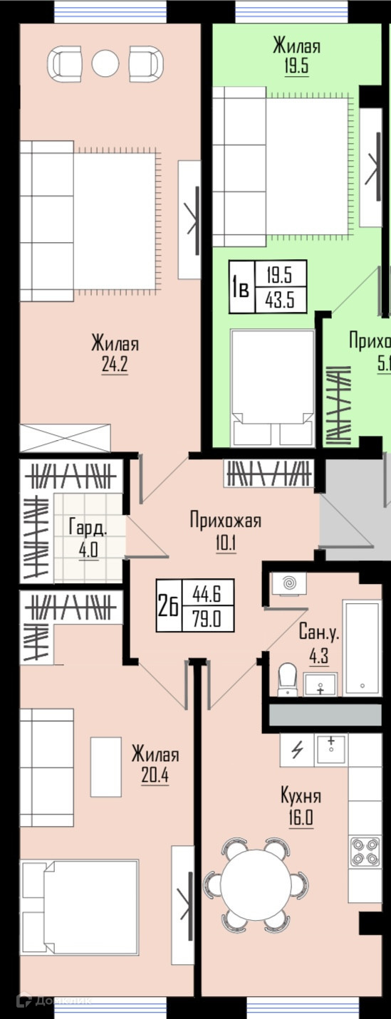 Жилая площадь 44.6 м2