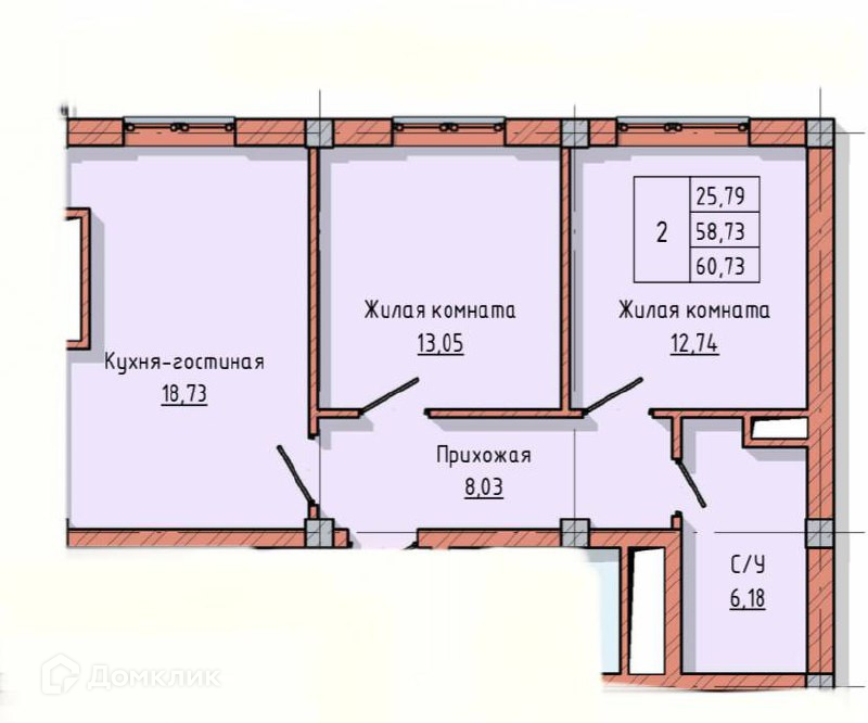 Общая площадь 60.73 м2