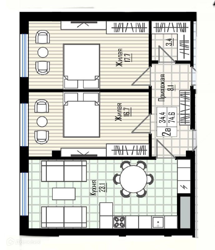 Жилая площадь 34.4 м2