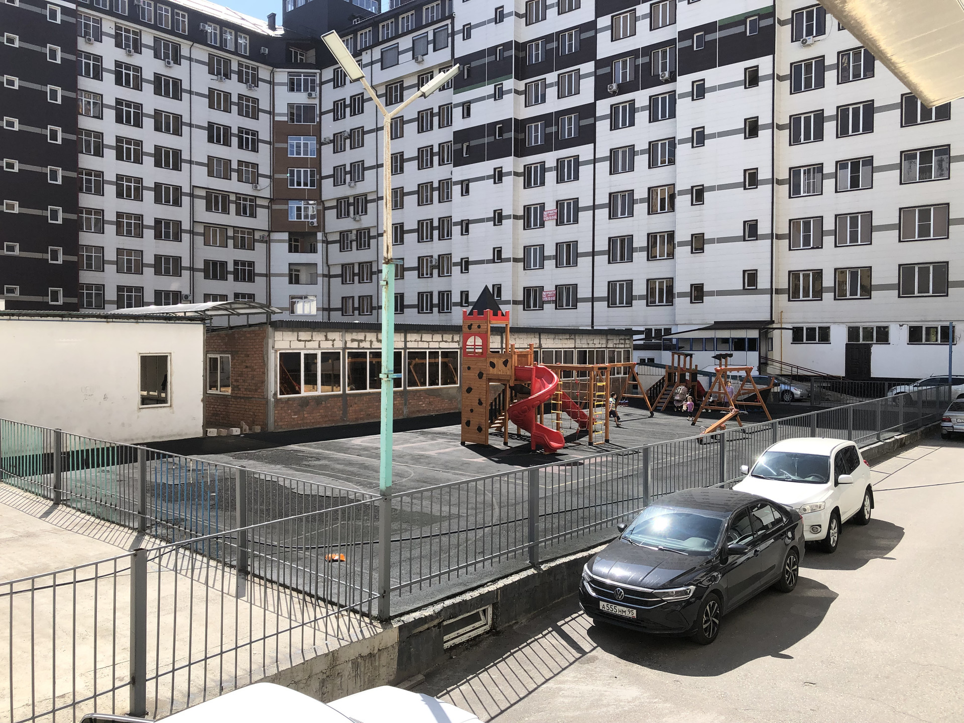 - Закрытый двор с полями для футбола и баскетбола, детская площадка