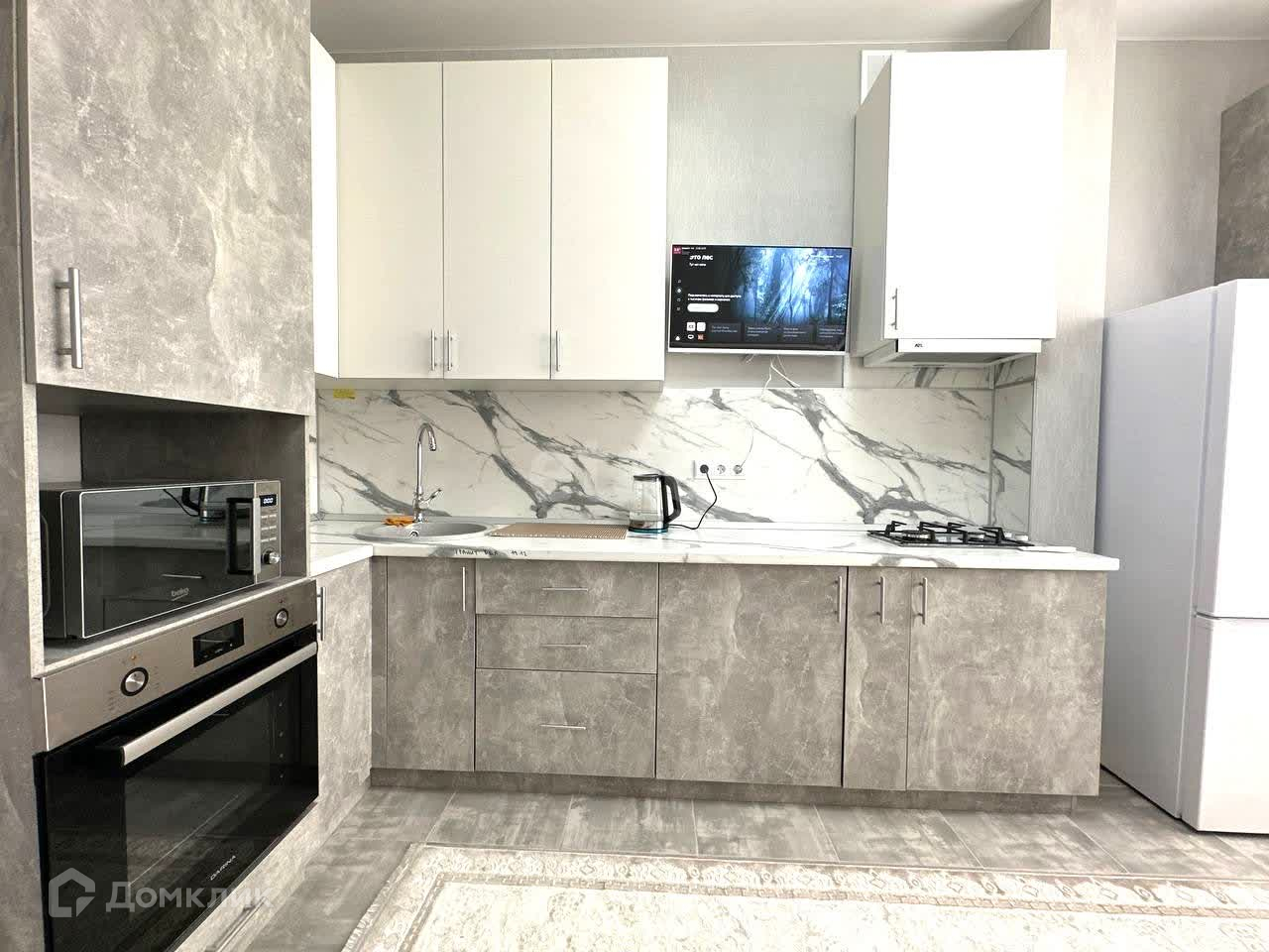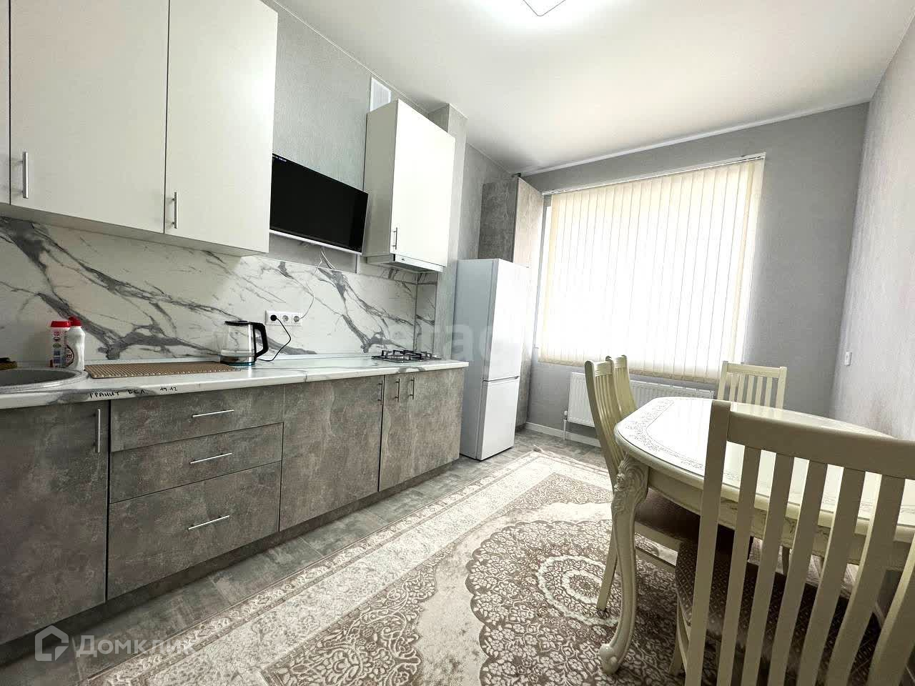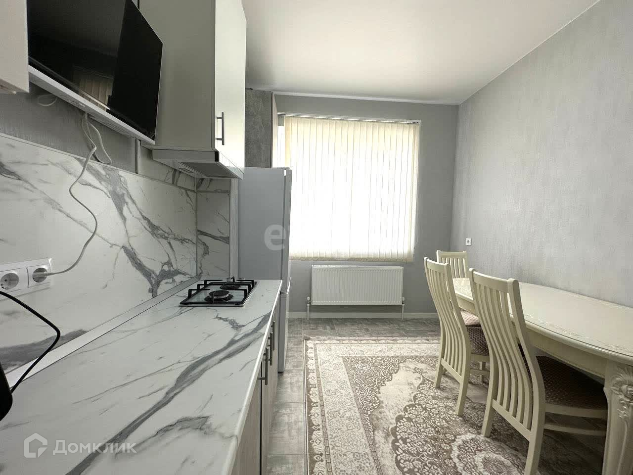 Большая светлая кухня с телевизором, большим обеденным столом.