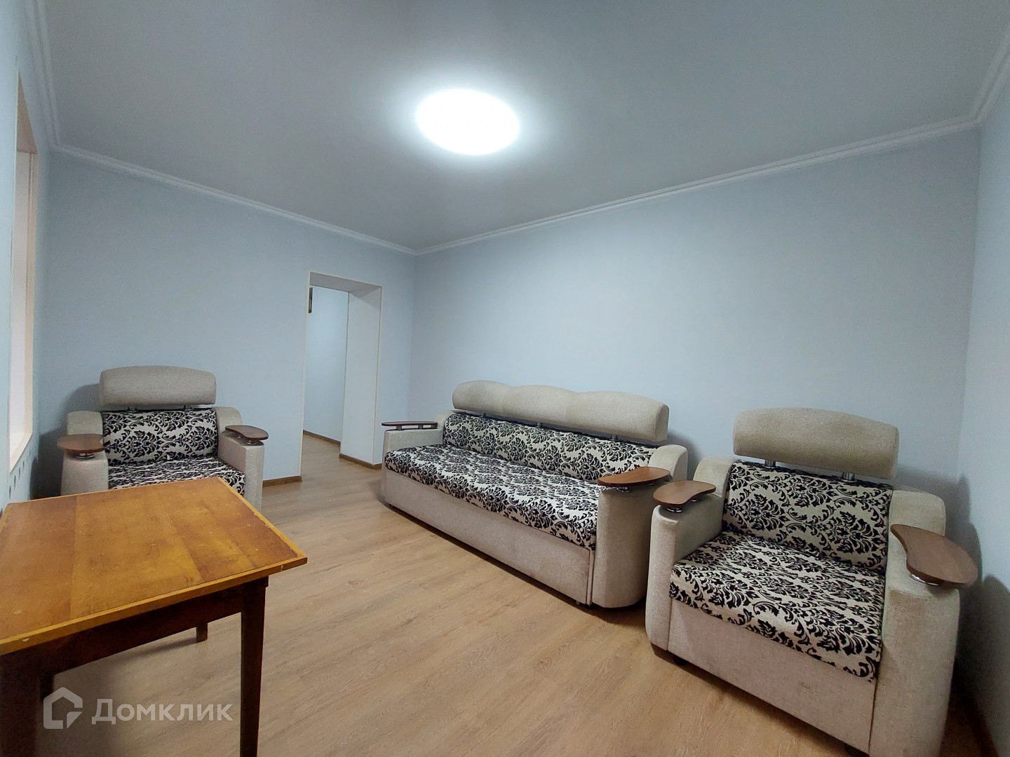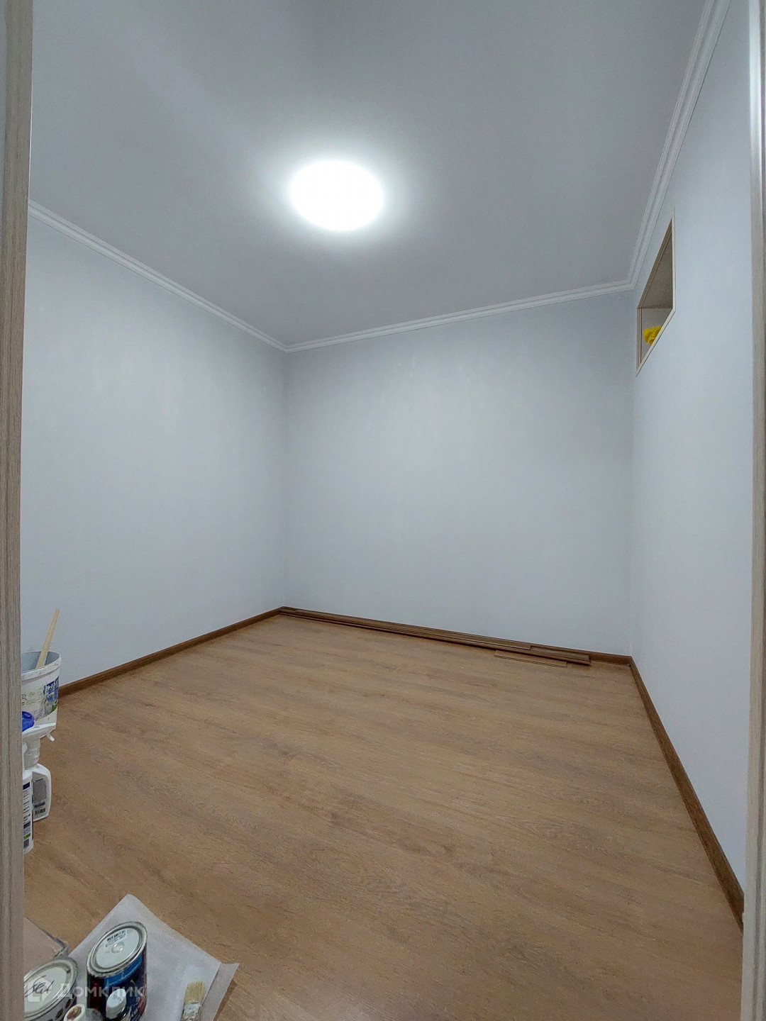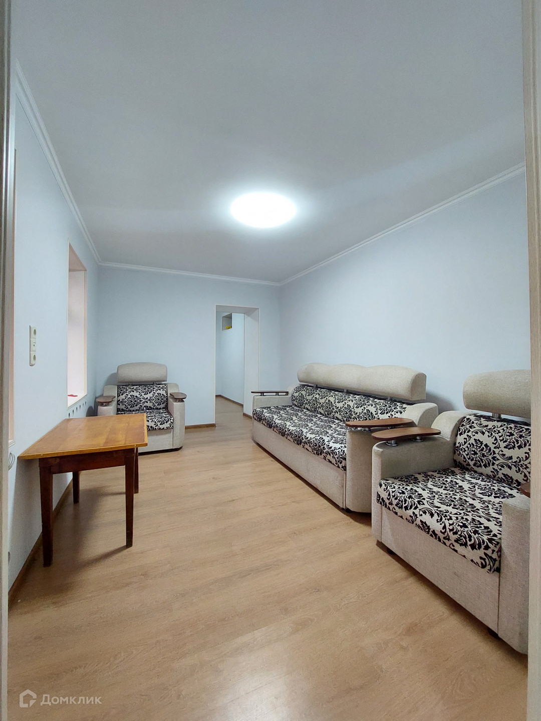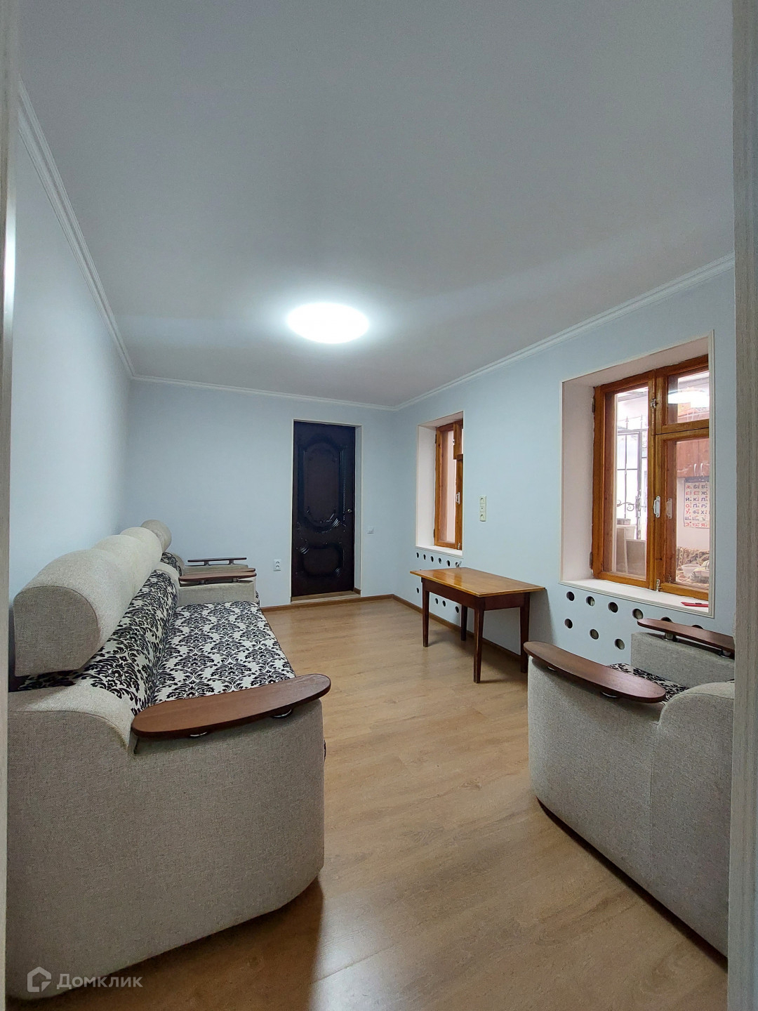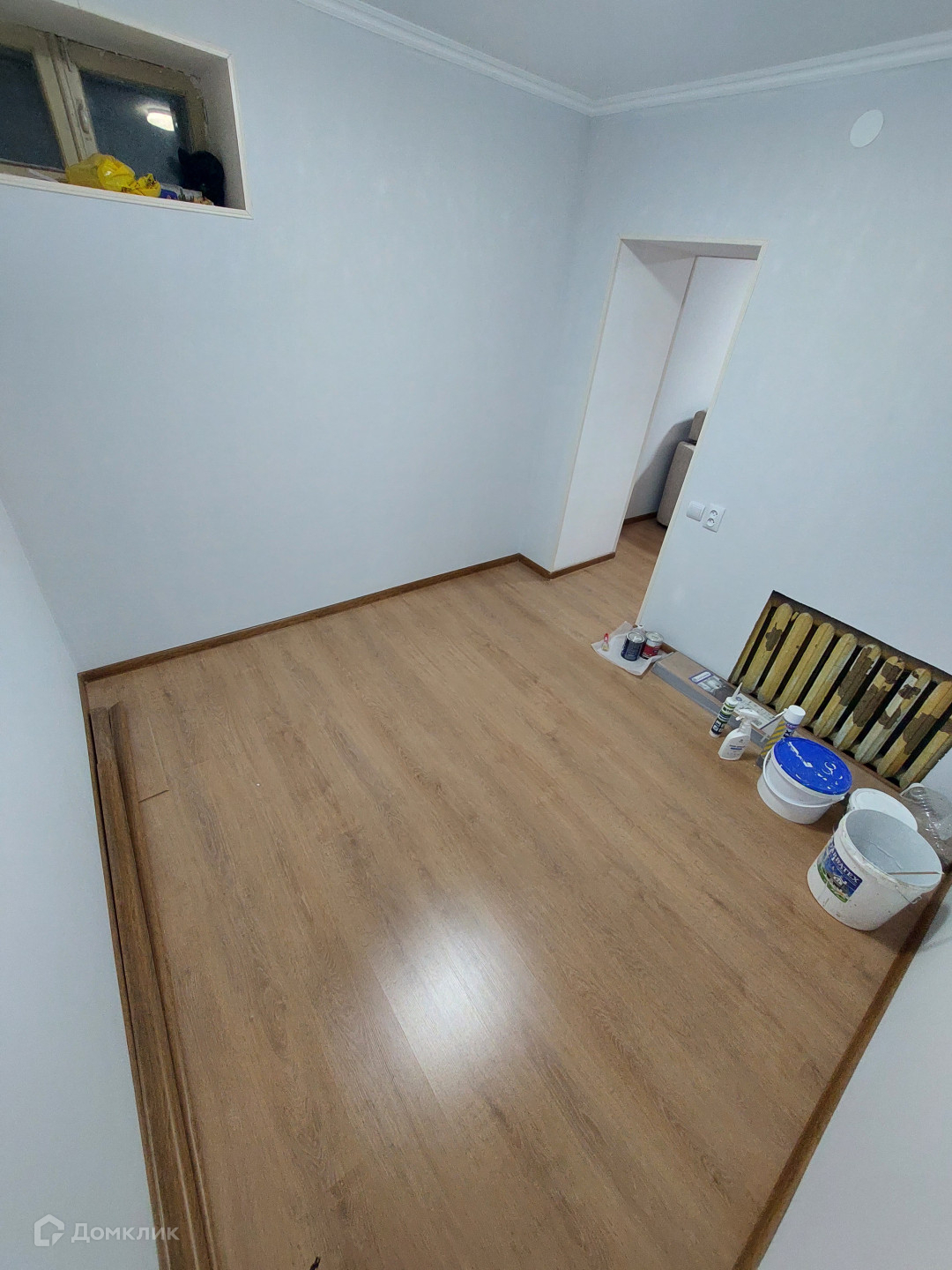 Пол - ламинат, стеклопакеты, санузел и кухня -плитка.