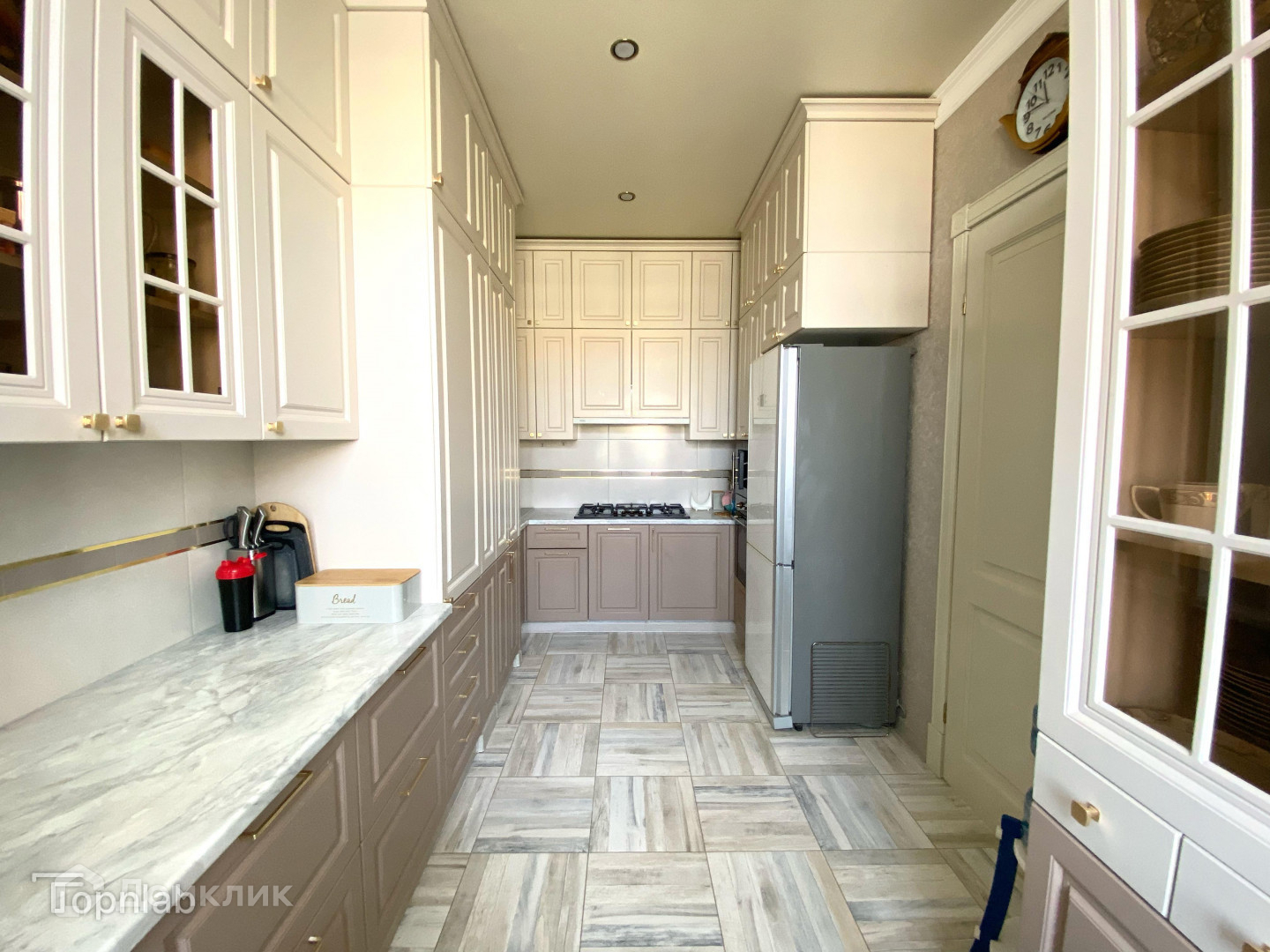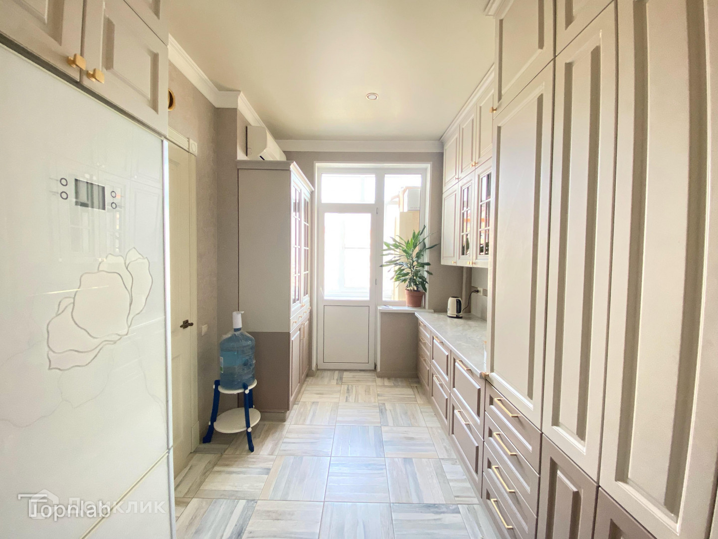 Изолированная кухня, со встроенной техникой и мебелью под заказ. Имеется выход на балкон, который можно использовать как дополнительное подсобное место для хранения;