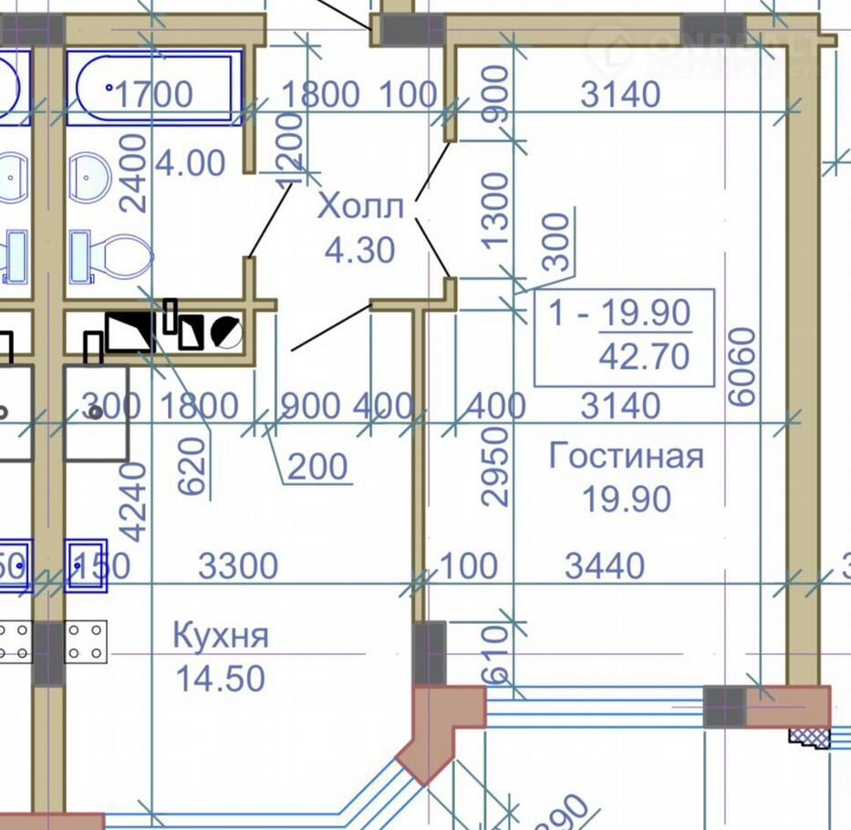 Общая площадь 42.7 м2