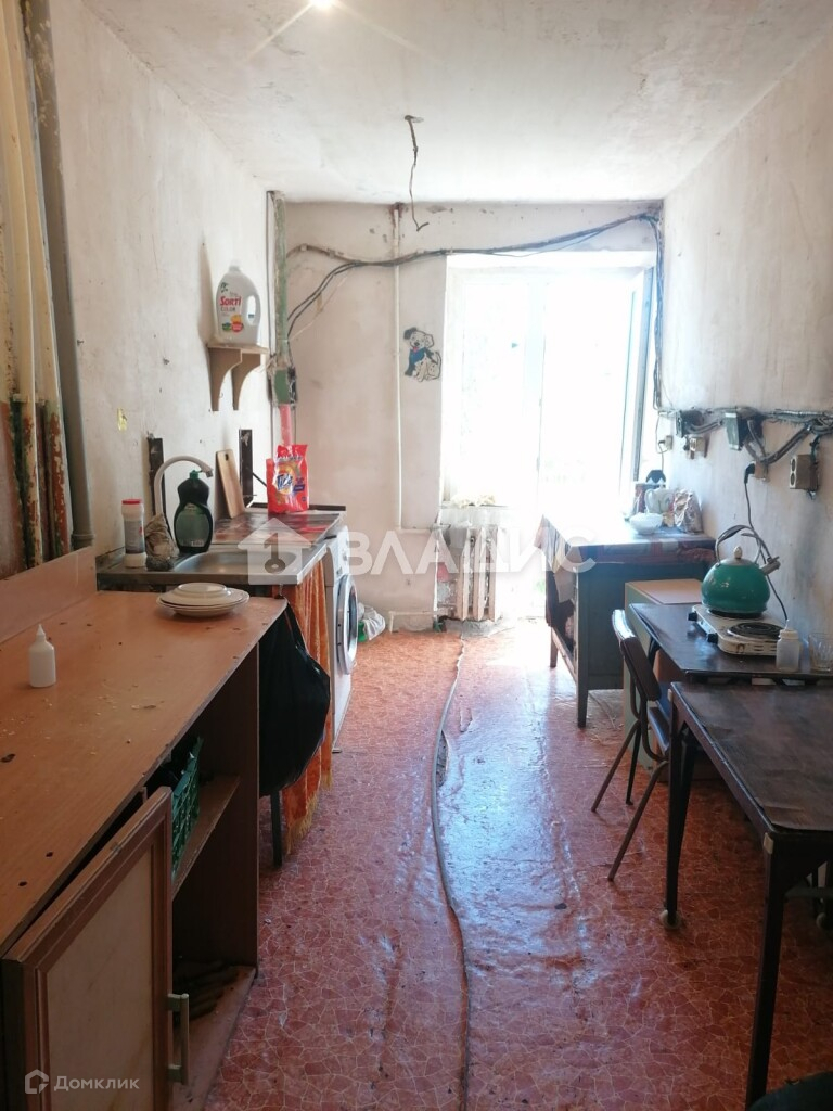 Общая площадь комнаты составляет 18 кв. м., из них кухня занимает 10 кв. м. Комната находится в квартире с пятью комнатами. Окна выходят на улицу и во двор.