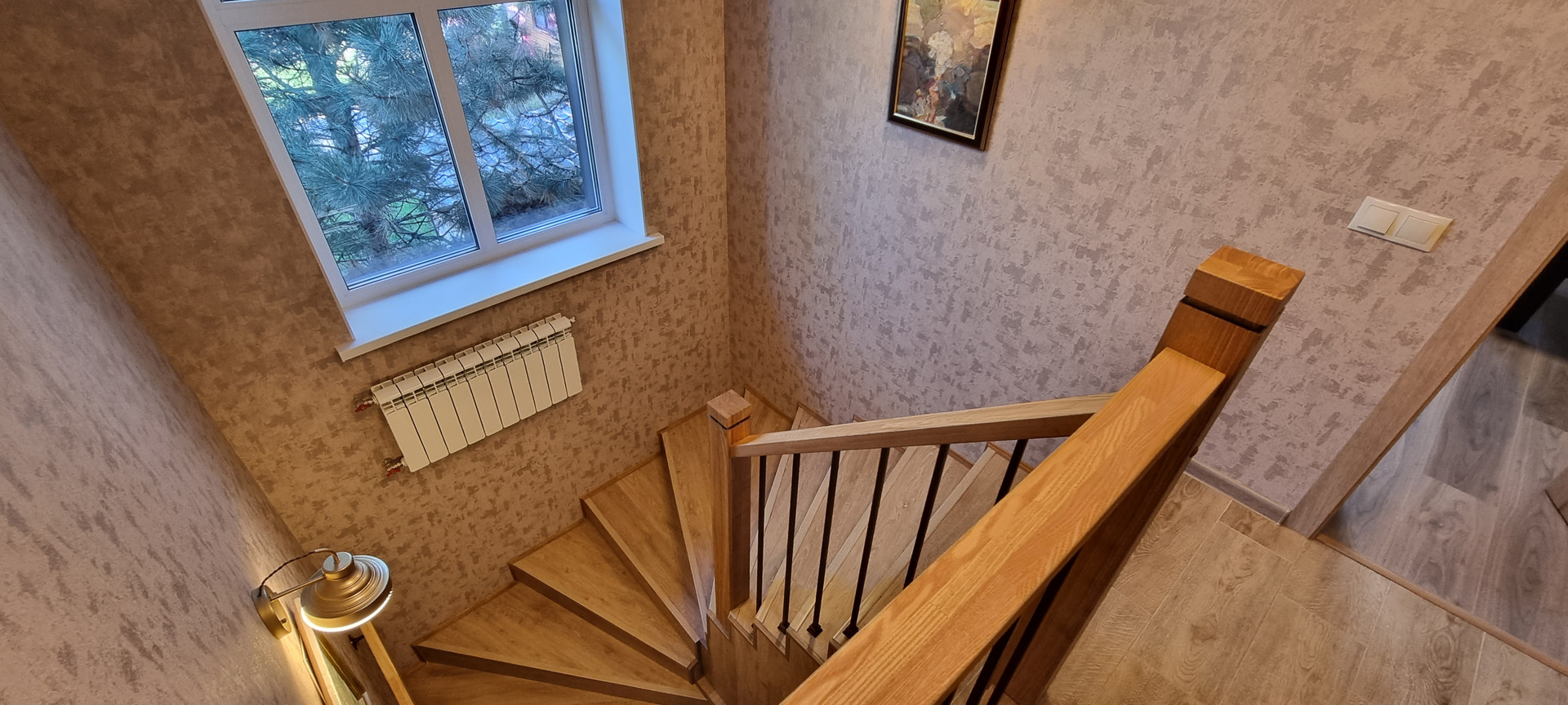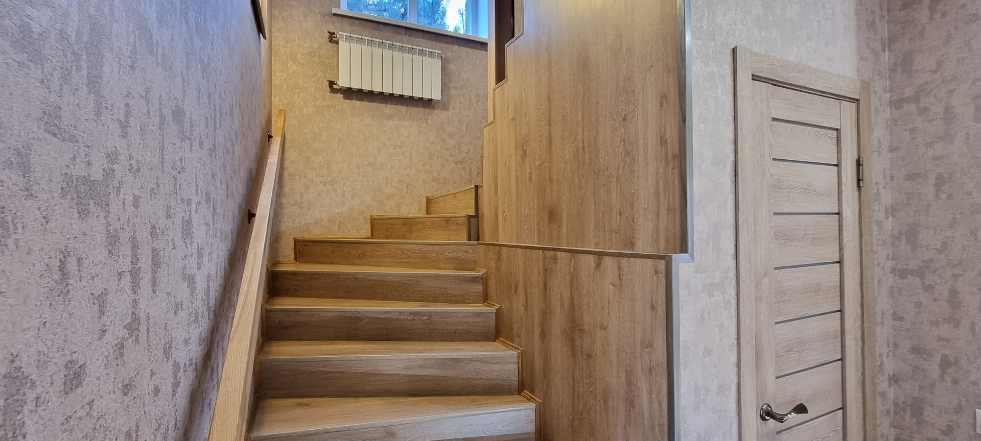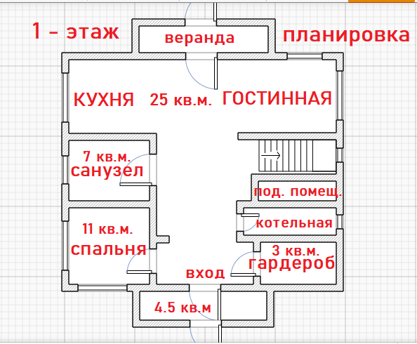 Планировка 1 - этажа: кухня-гостинная, спальня, санузел, гардеробная, бойлерная. Лестница на второй этаж бетонная (не деревянная).