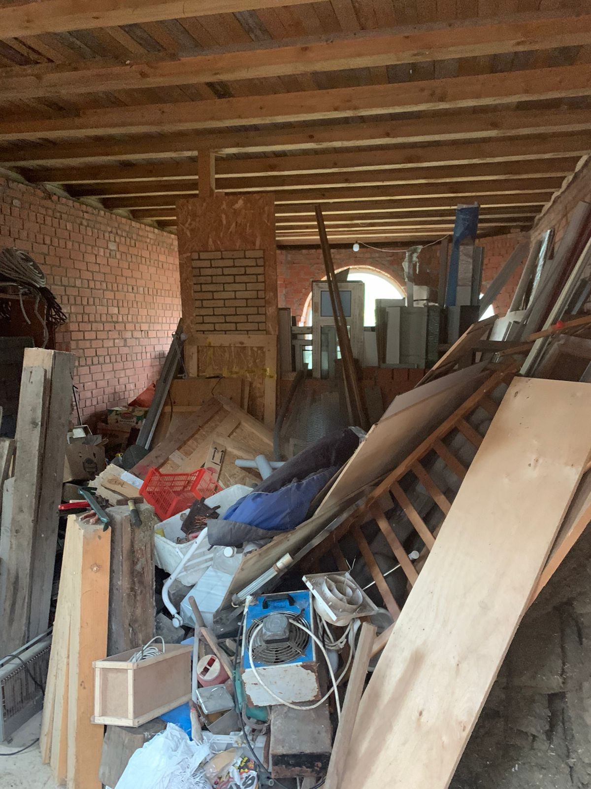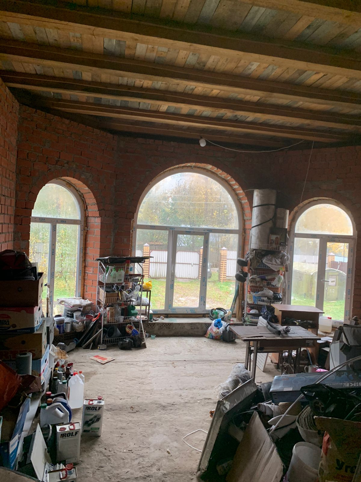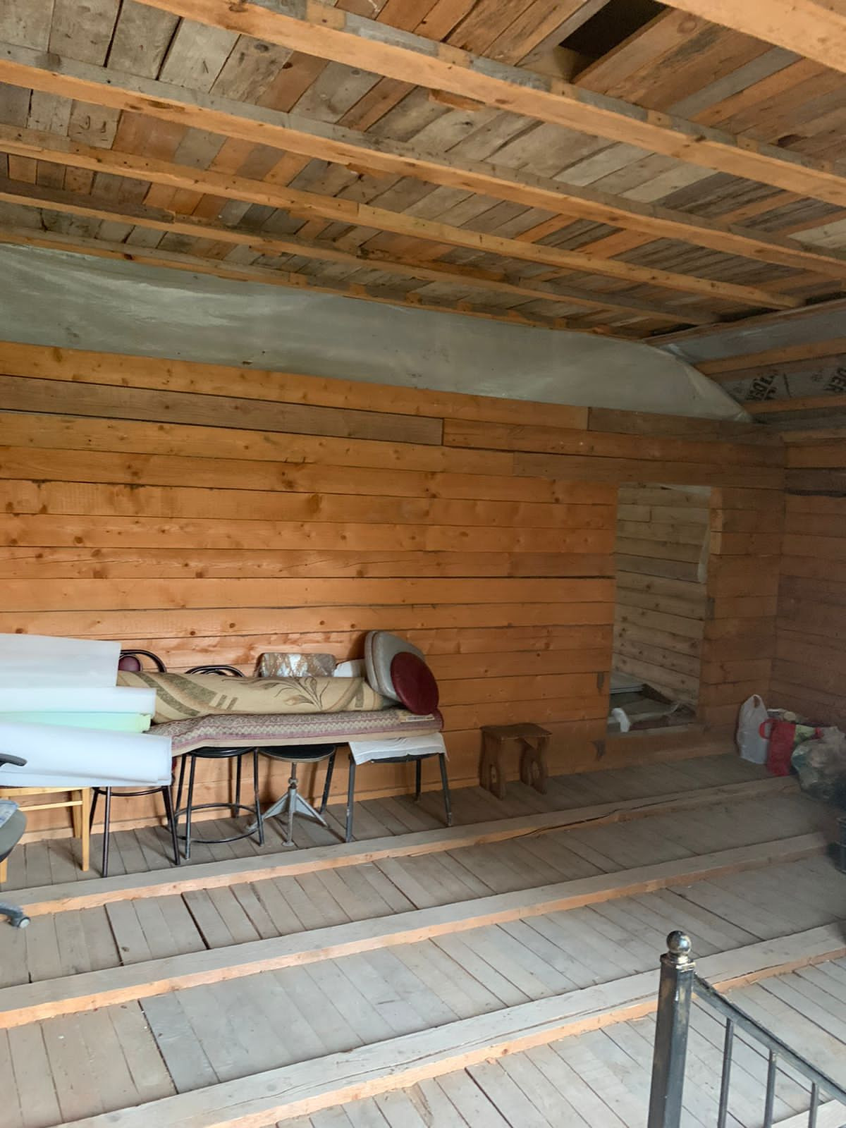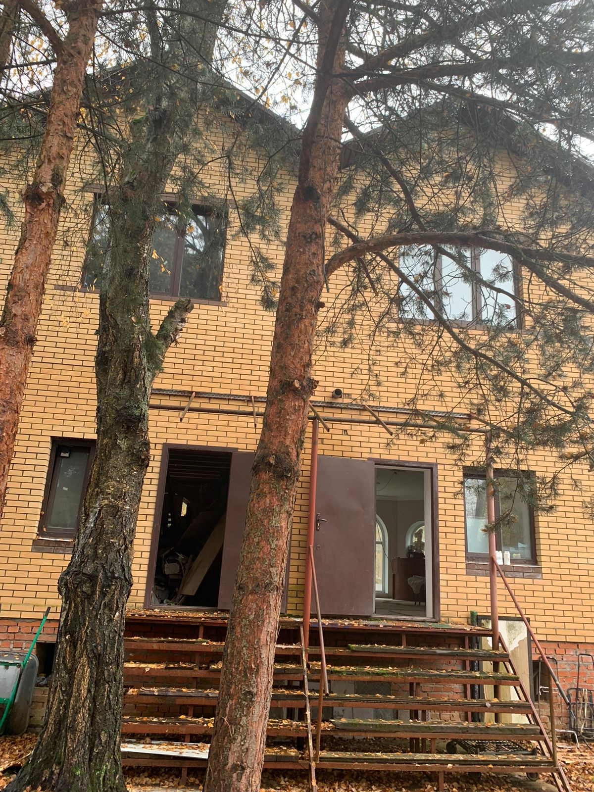 Внутренние отделки нет, только каркас, посередине сплошная стена. Дом на две семьи, два входа с каждой стороны.