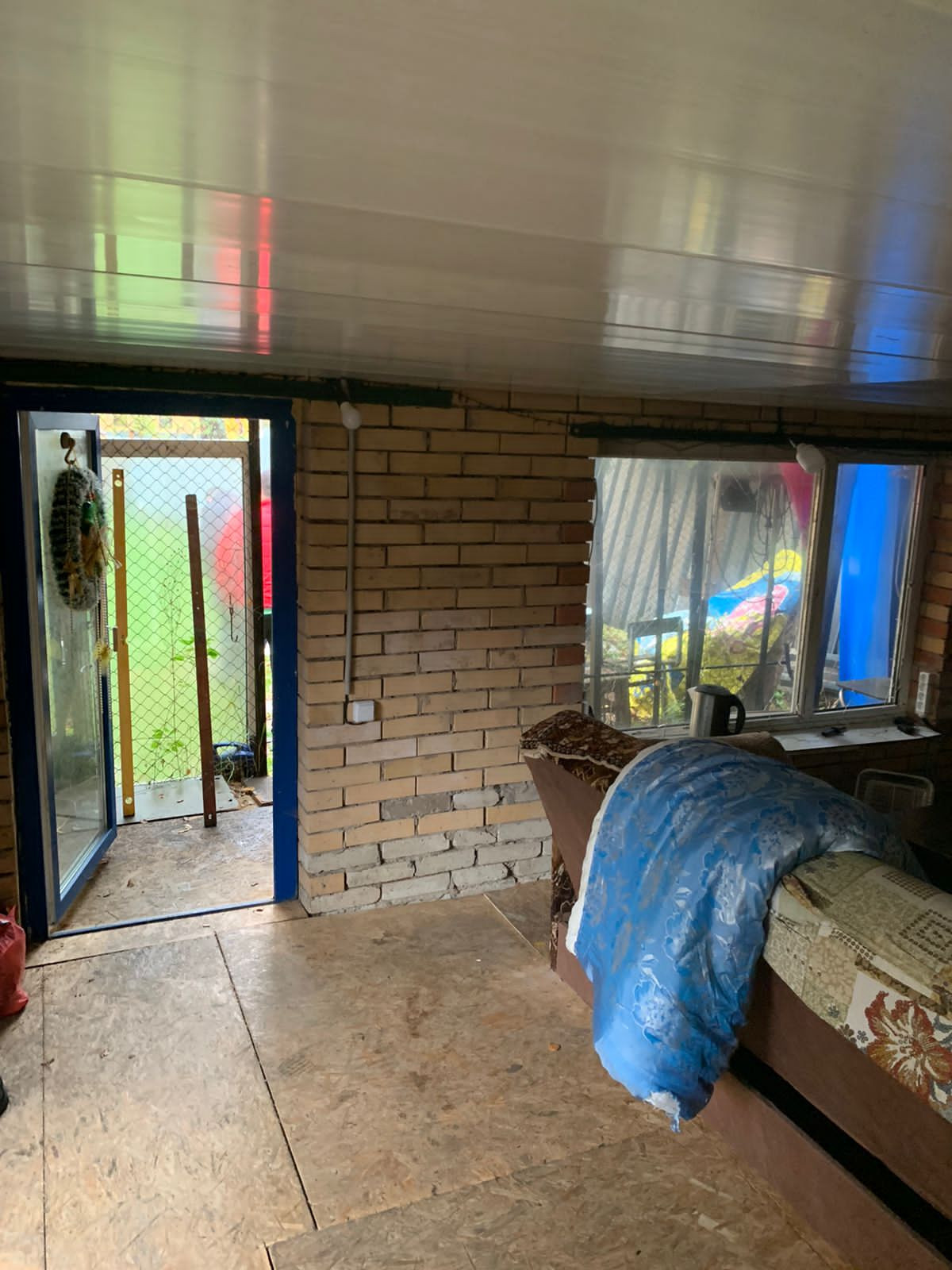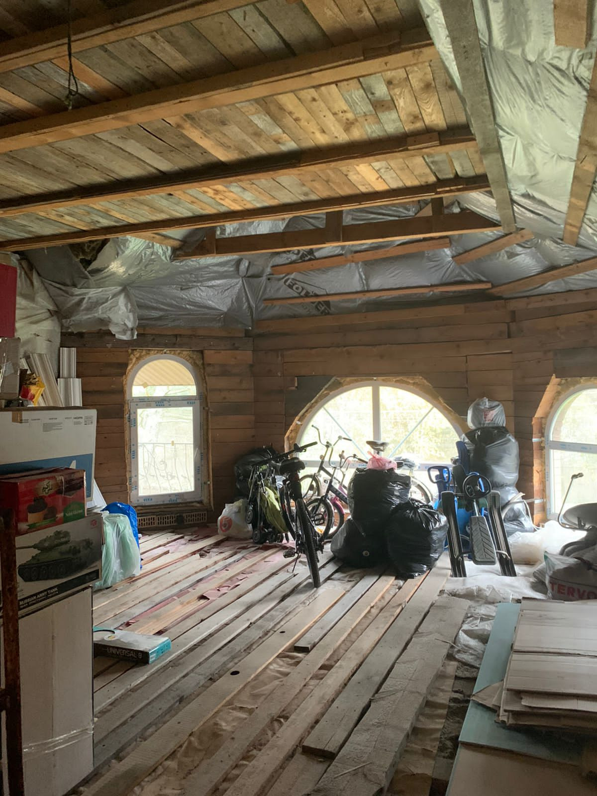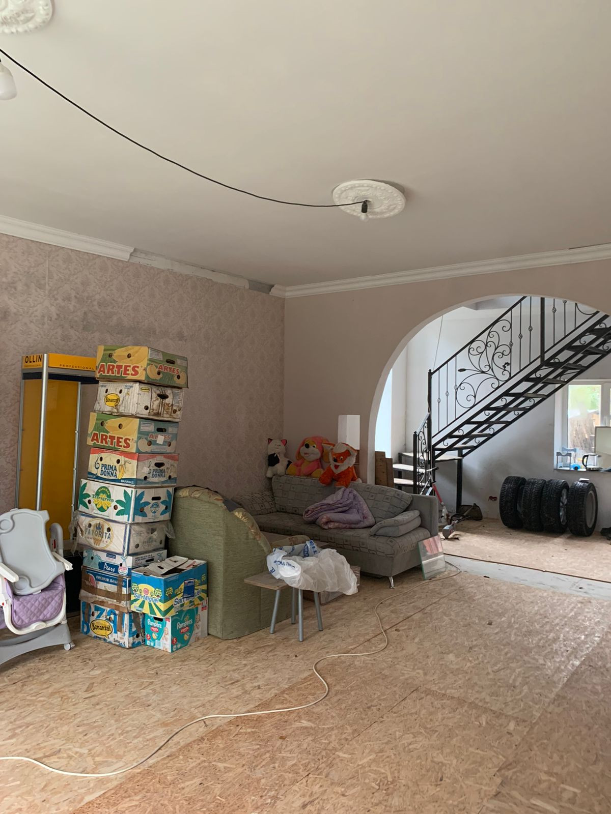 Внутренние отделки нет, только каркас, посередине сплошная стена. Дом на две семьи, два входа с каждой стороны.