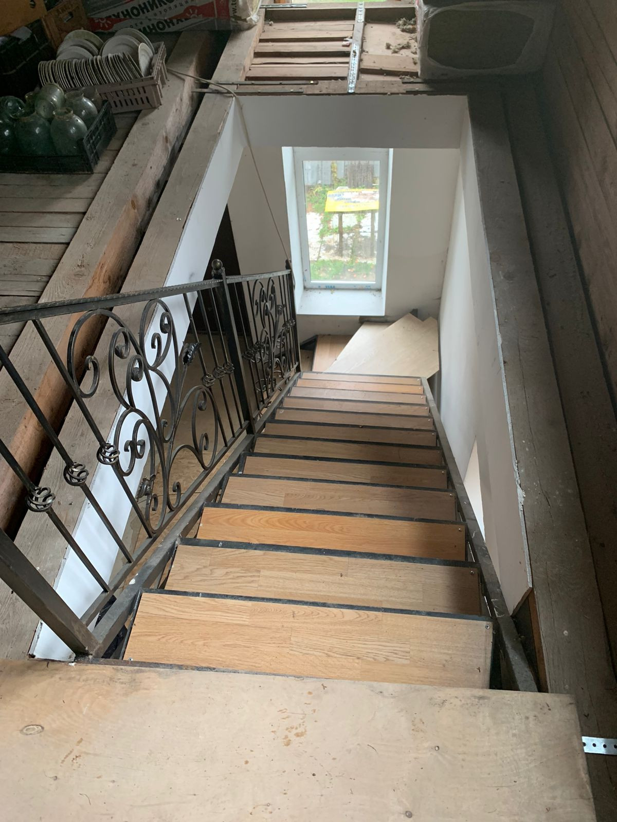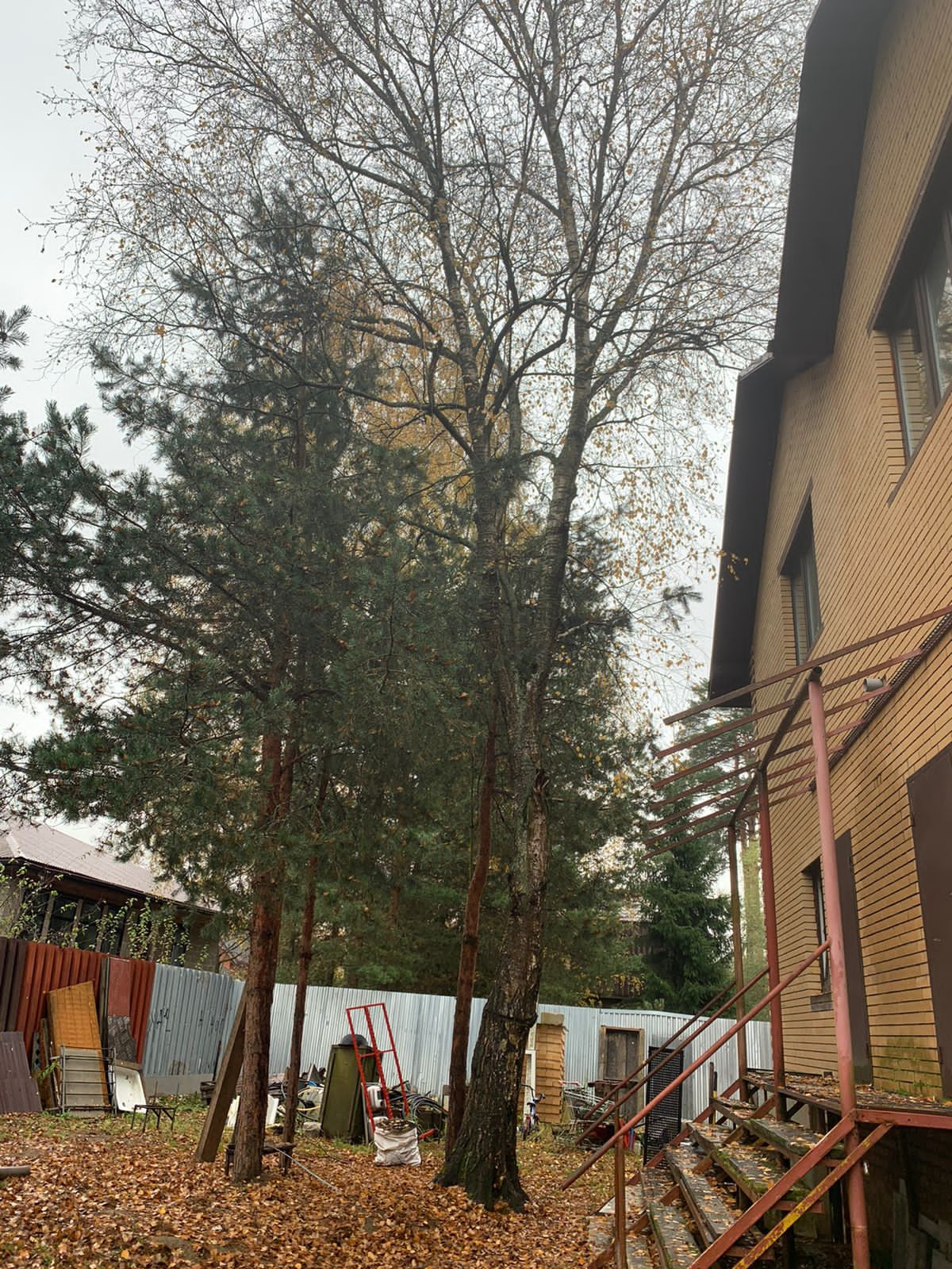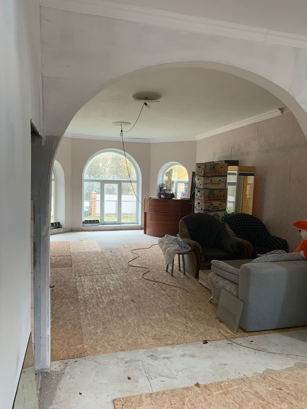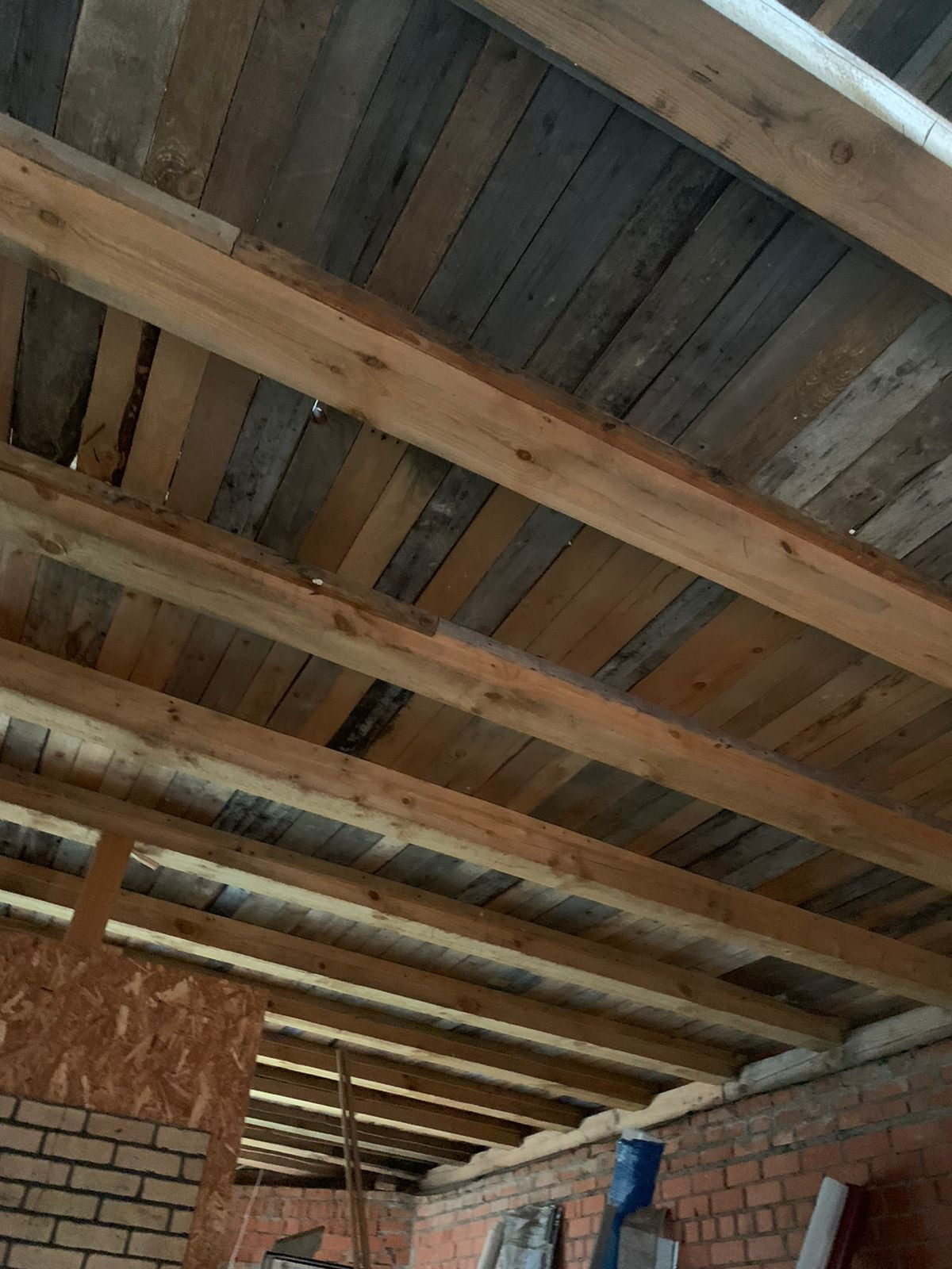 Внутренние отделки нет, только каркас, посередине сплошная стена. Дом на две семьи, два входа с каждой стороны.