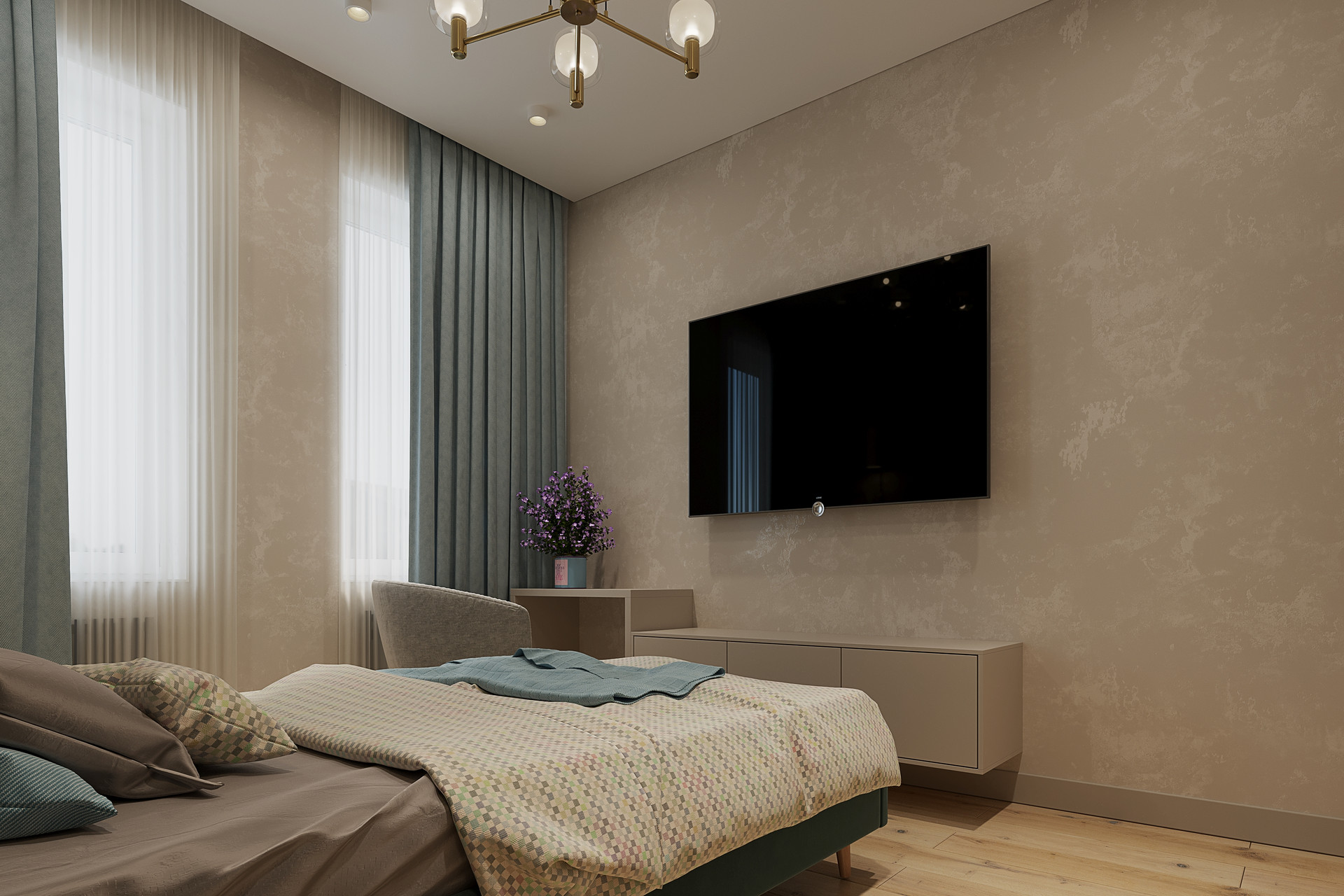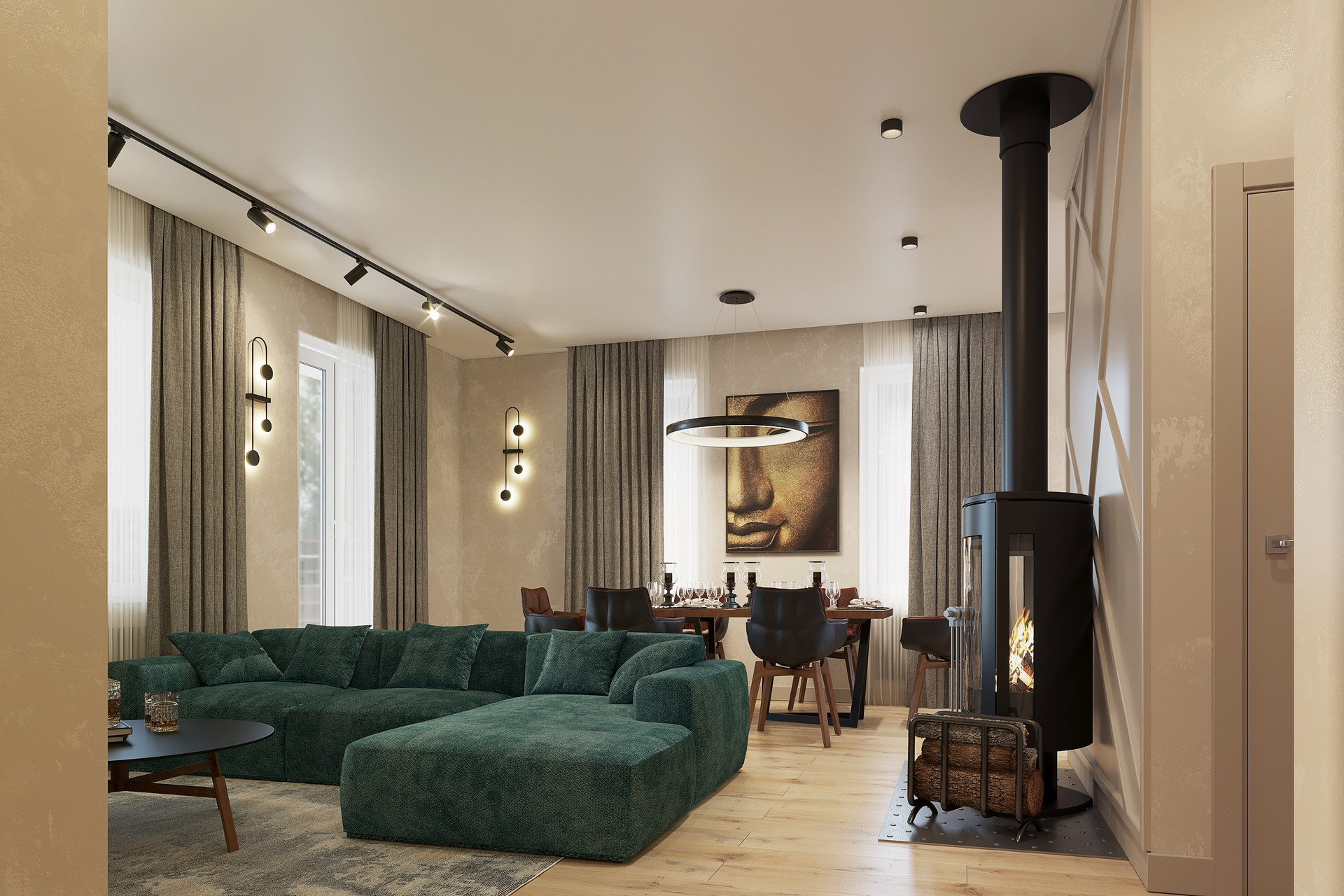 Функциональная планировка: три спальни, кухня-гостиная, гостевой с/у, основной с/у, гардеробная, прихожая, котельная, мансардный этаж, терраса