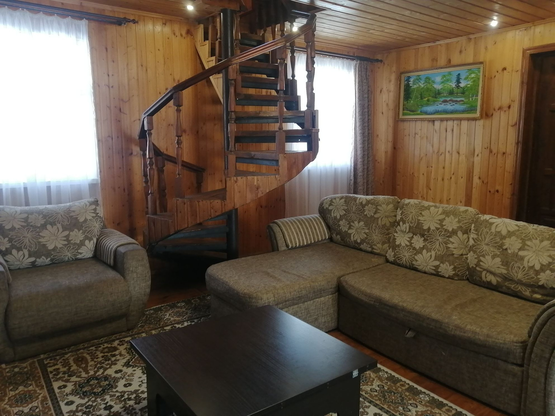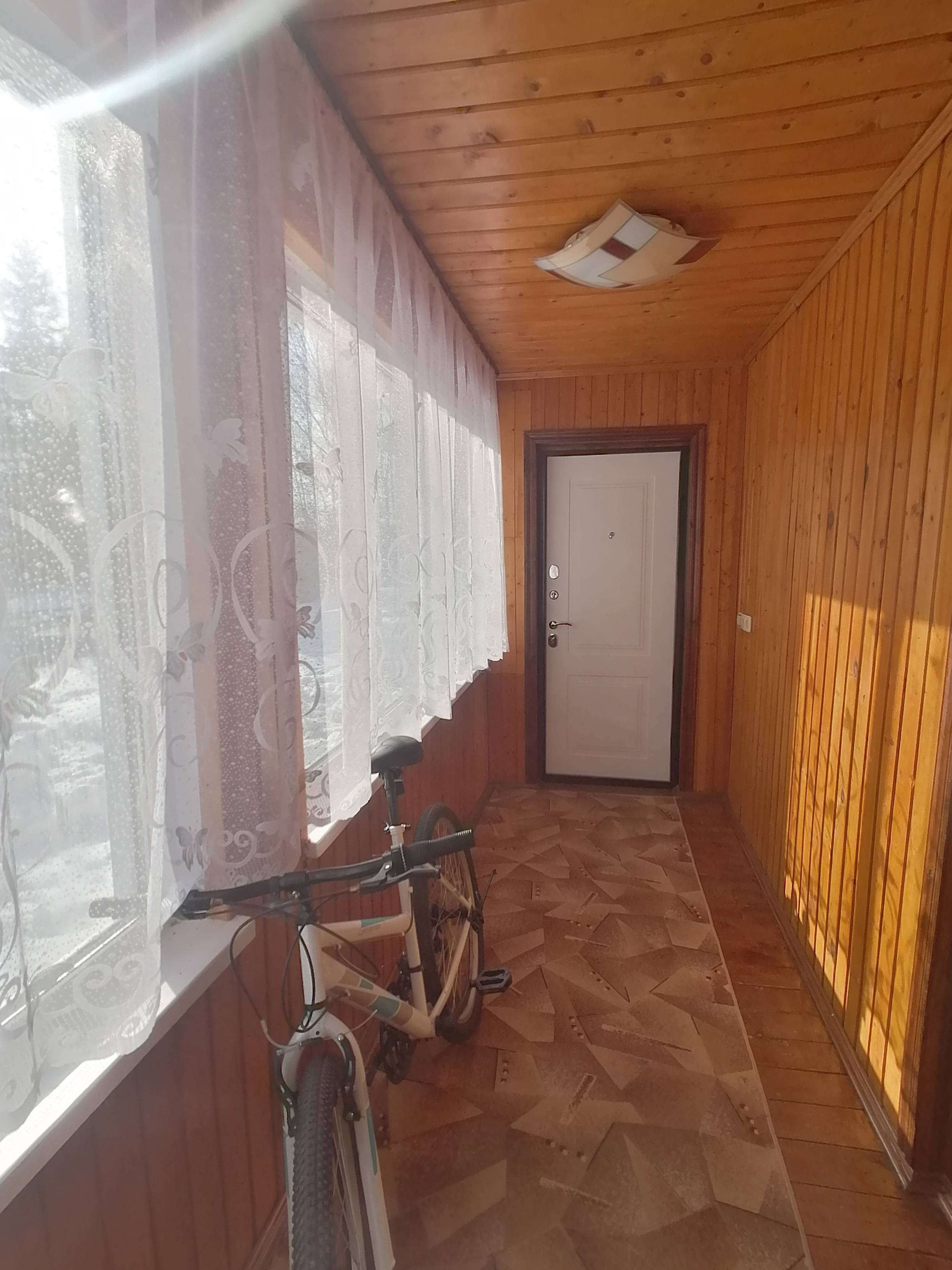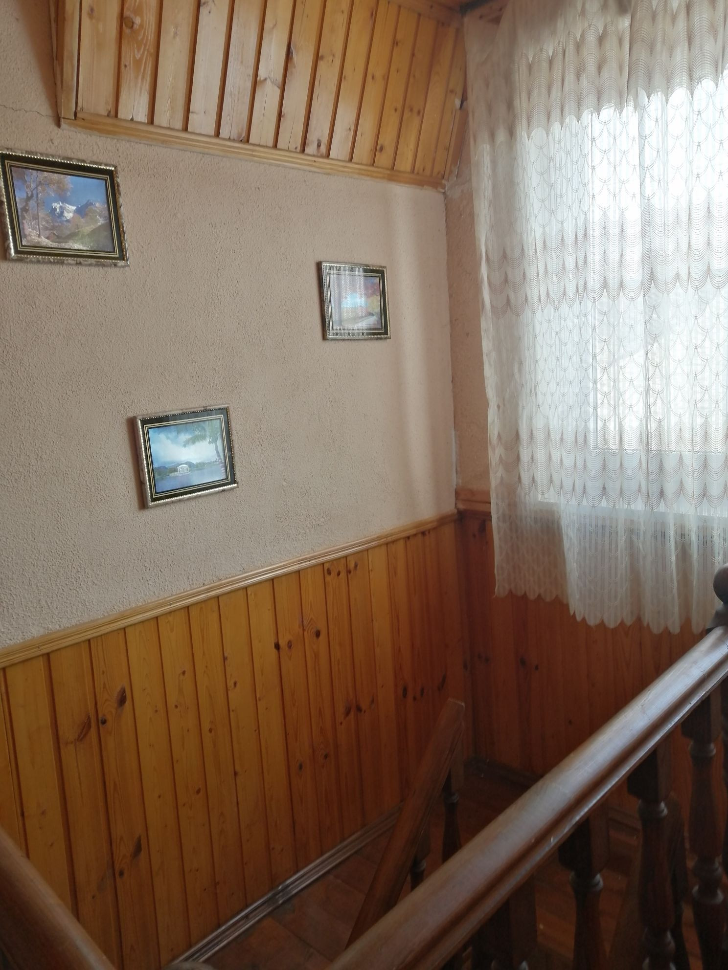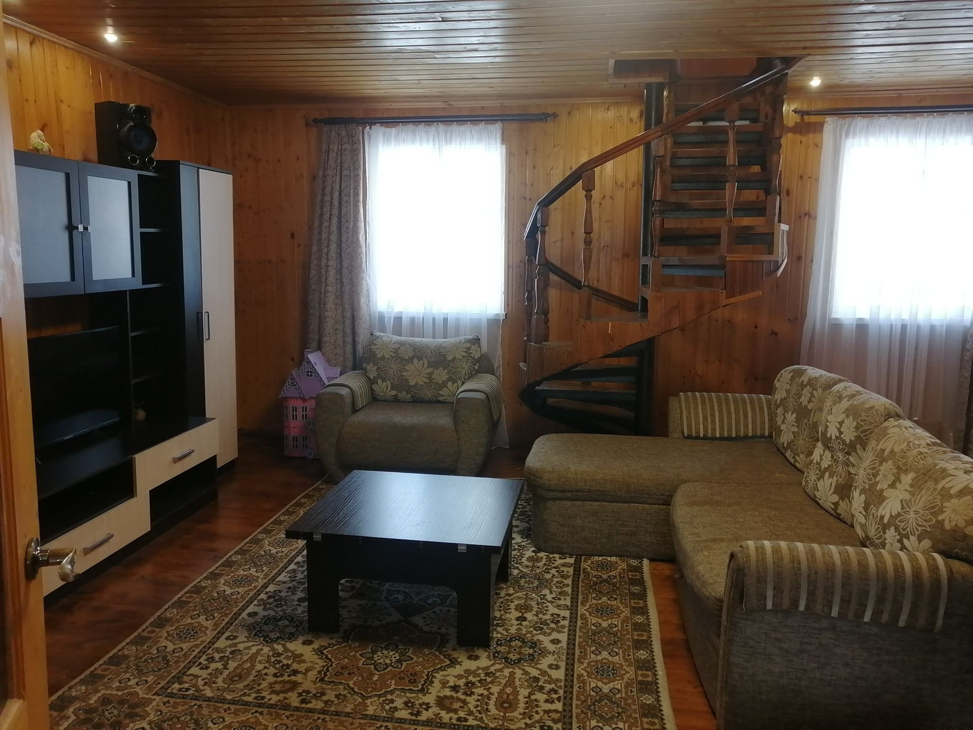 Планировка 1 этажа: веранда-прихожая, большая гостинная с дровянным камином, большая кухня, душевая комната (душевая кабина, водонагреватель, умывальник, стиральная машина). На втором этаже 2 спальни (на стенах жидкие обои), балкон.