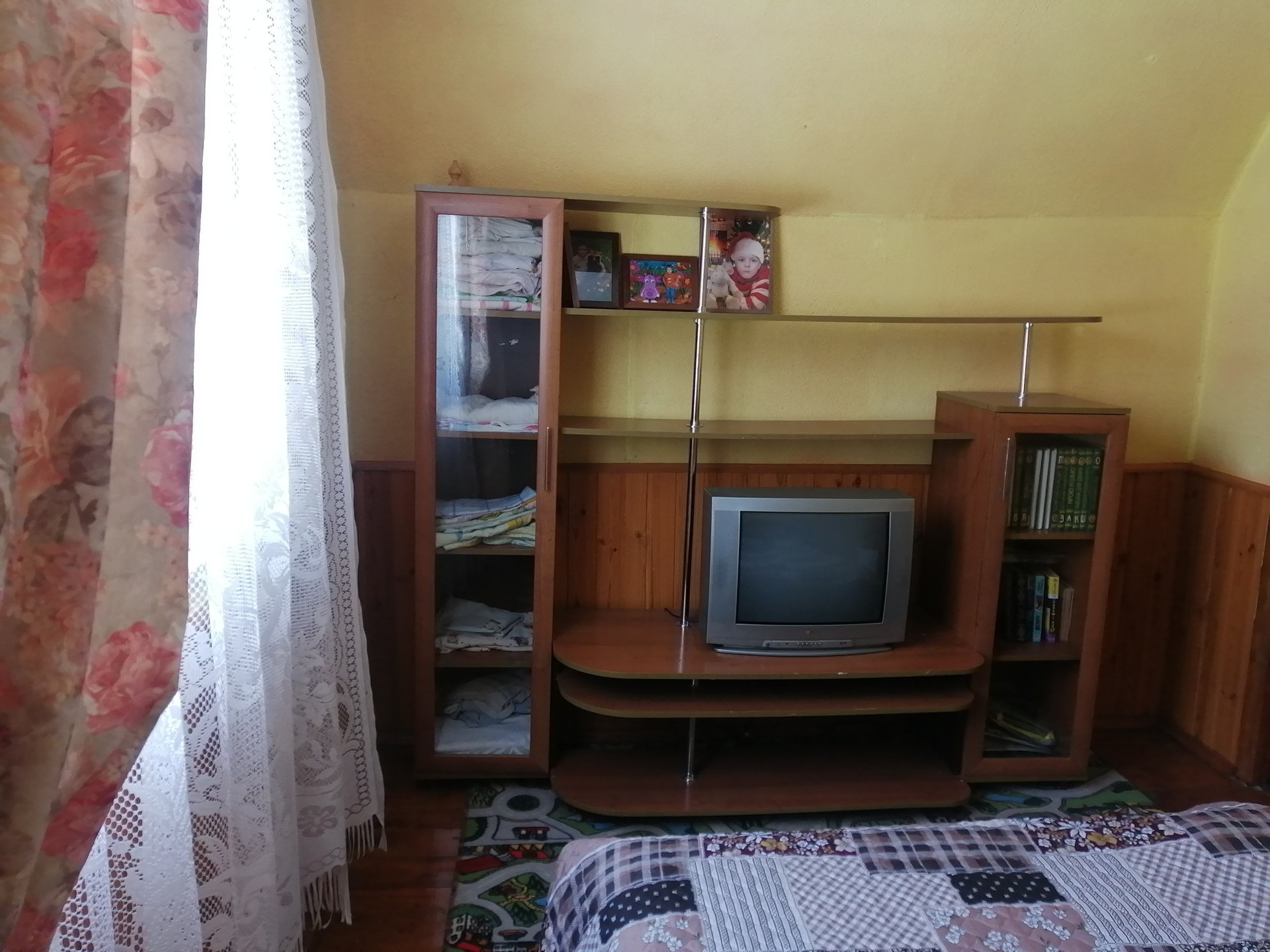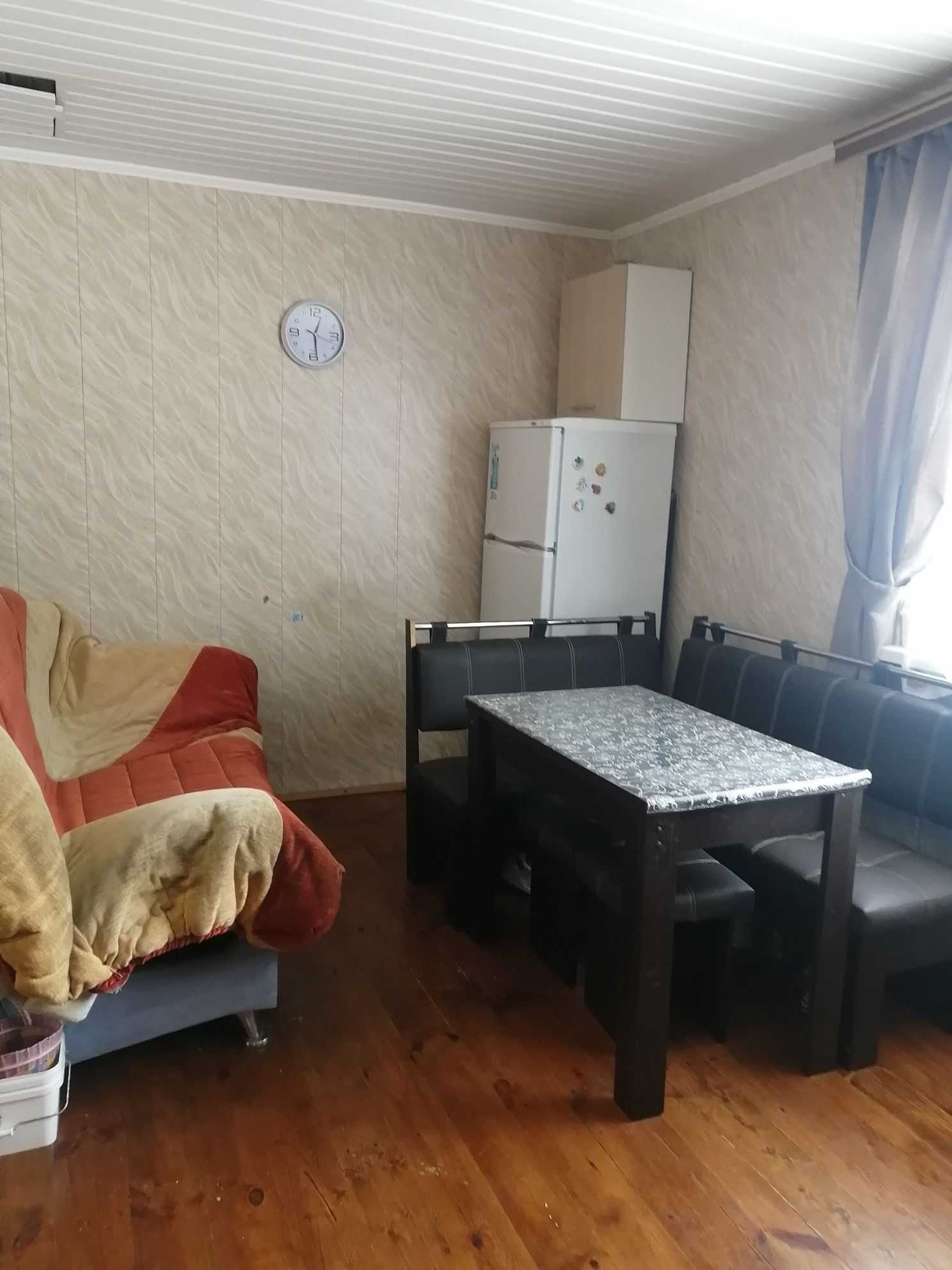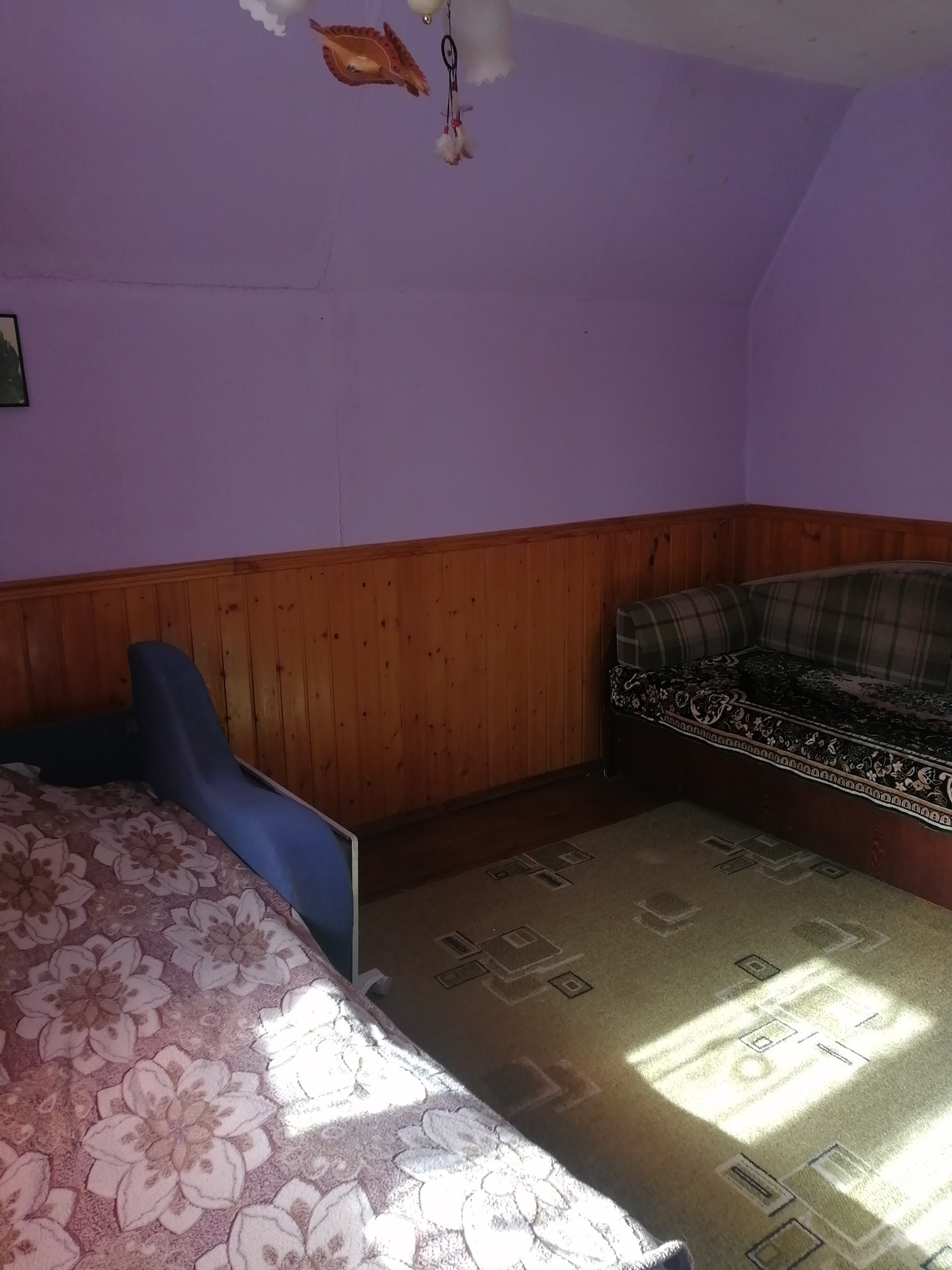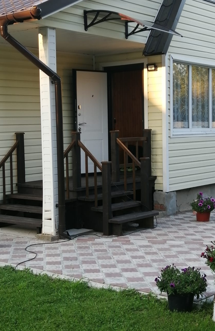 Планировка 1 этажа: веранда-прихожая, большая гостинная с дровянным камином, большая кухня, душевая комната (душевая кабина, водонагреватель, умывальник, стиральная машина). На втором этаже 2 спальни (на стенах жидкие обои), балкон.
