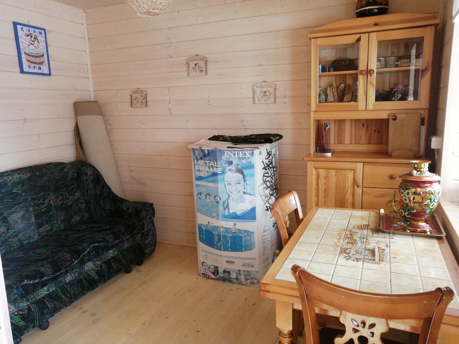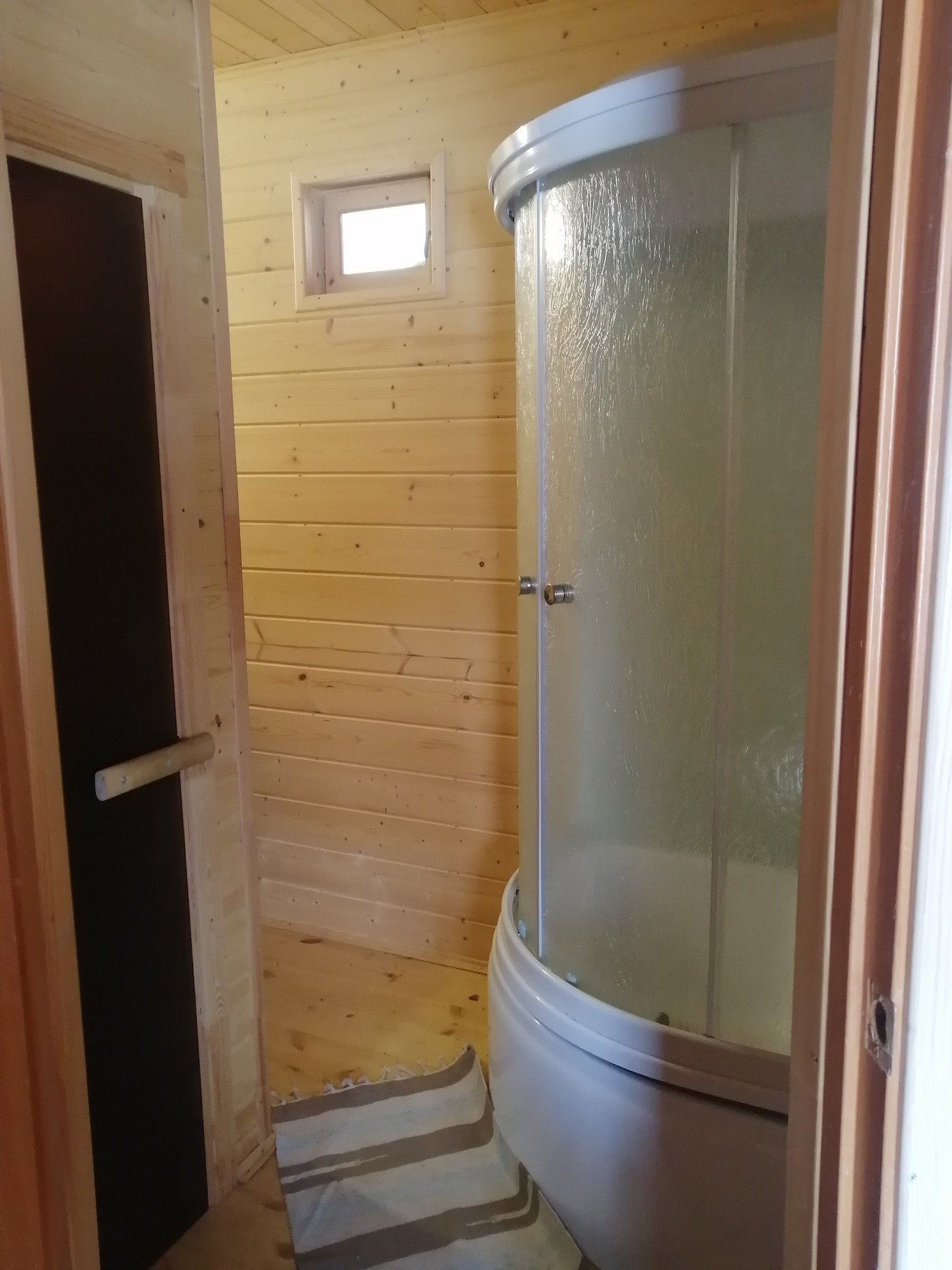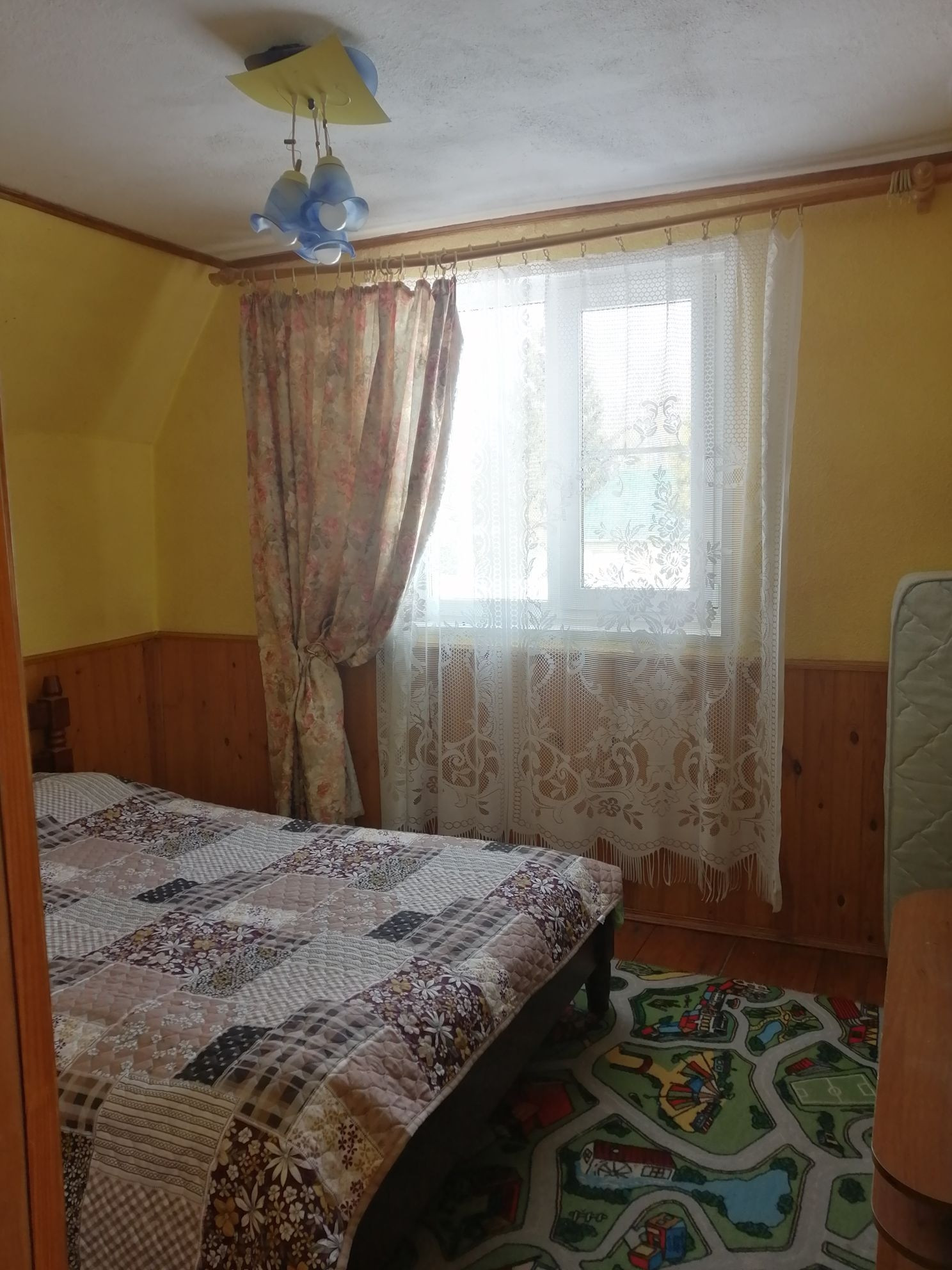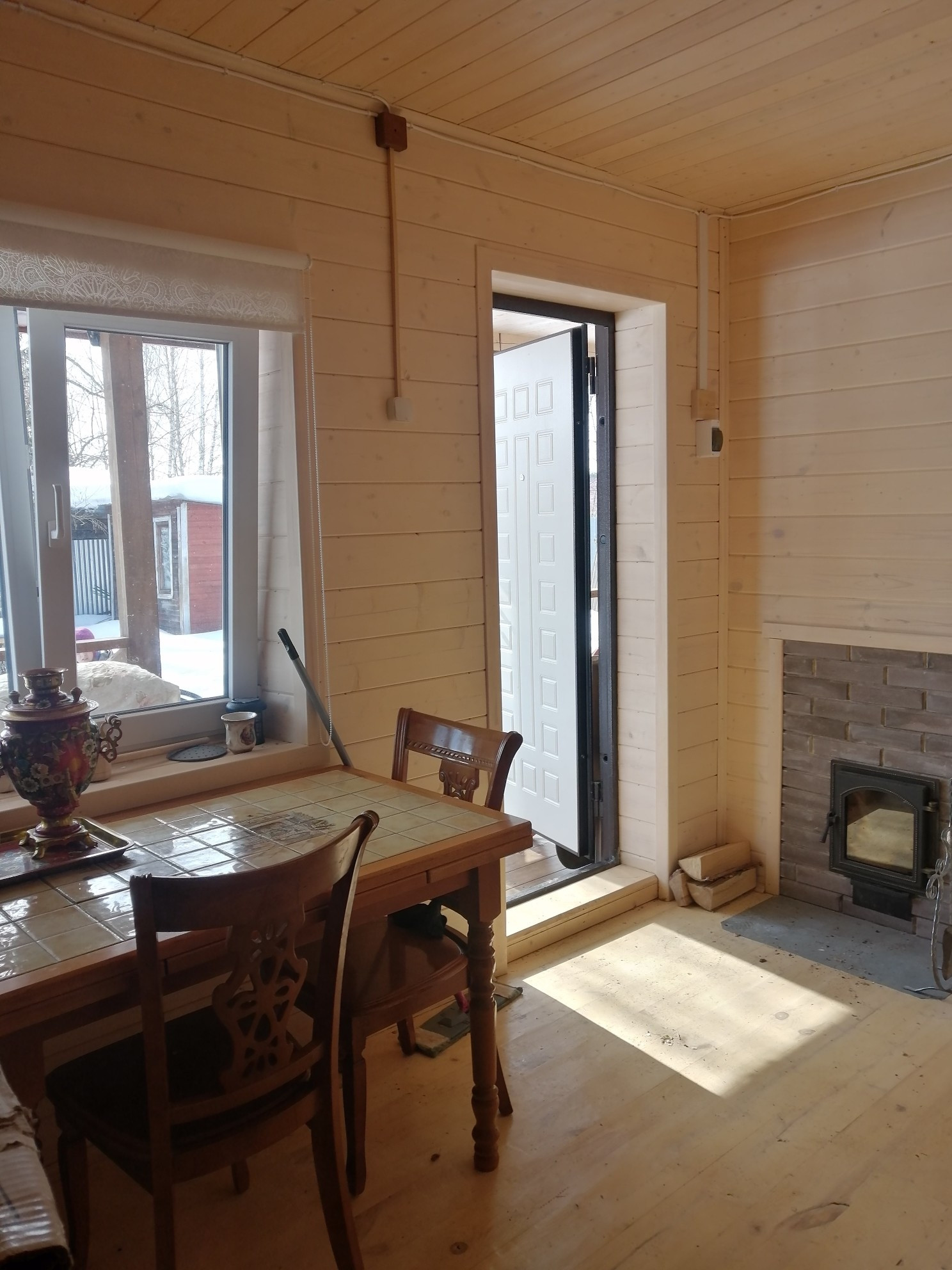 Планировка 1 этажа: веранда-прихожая, большая гостинная с дровянным камином, большая кухня, душевая комната (душевая кабина, водонагреватель, умывальник, стиральная машина). На втором этаже 2 спальни (на стенах жидкие обои), балкон.