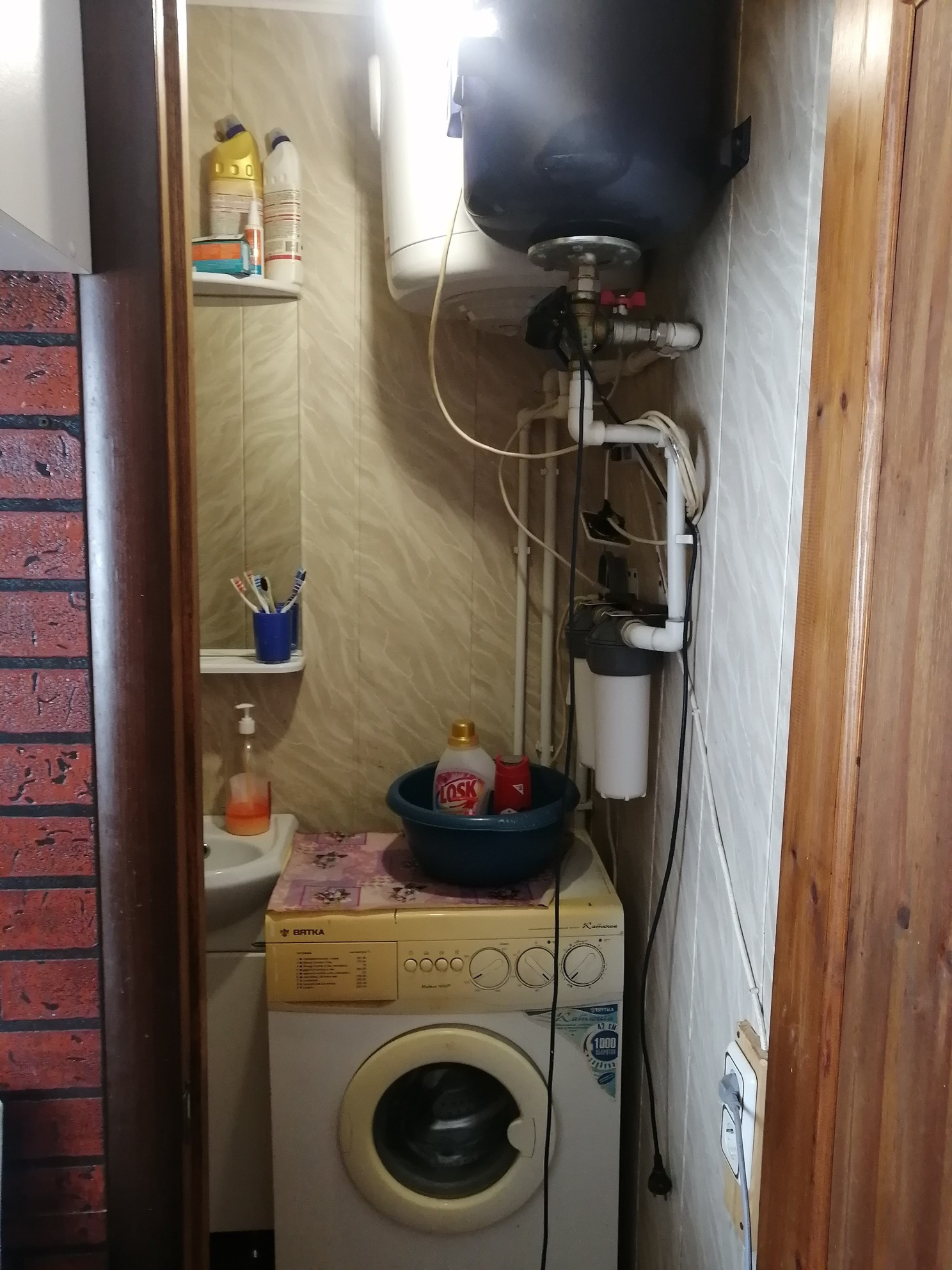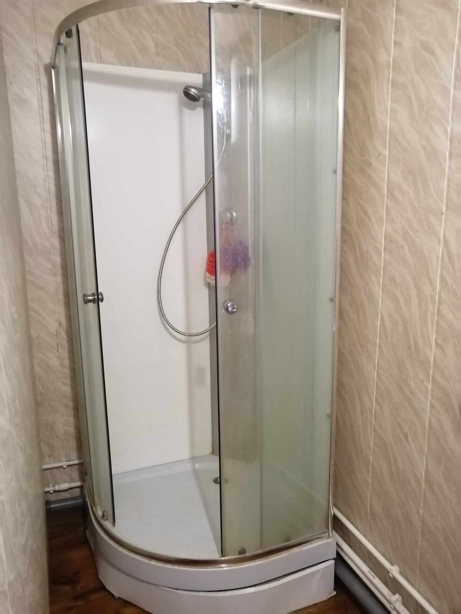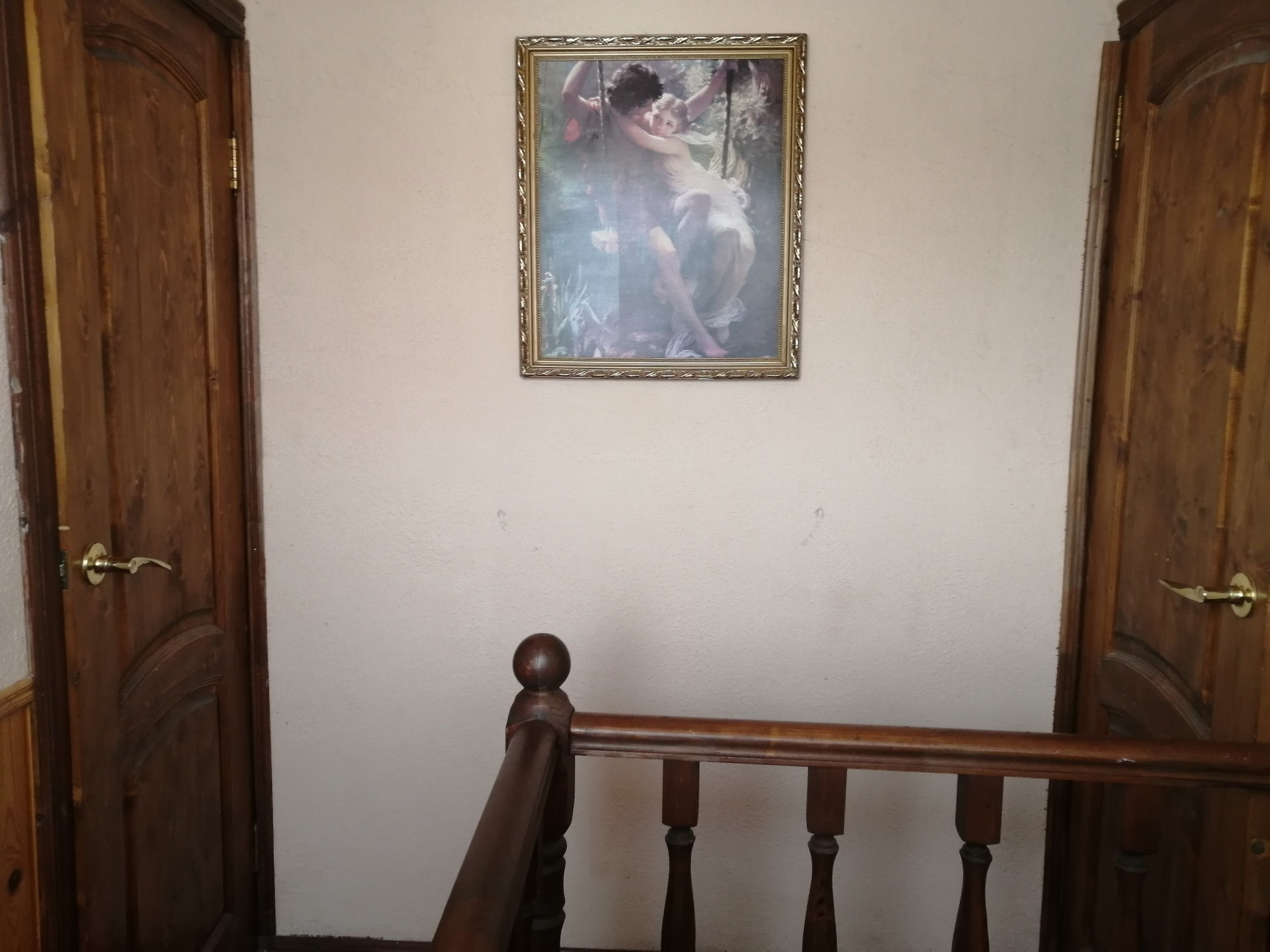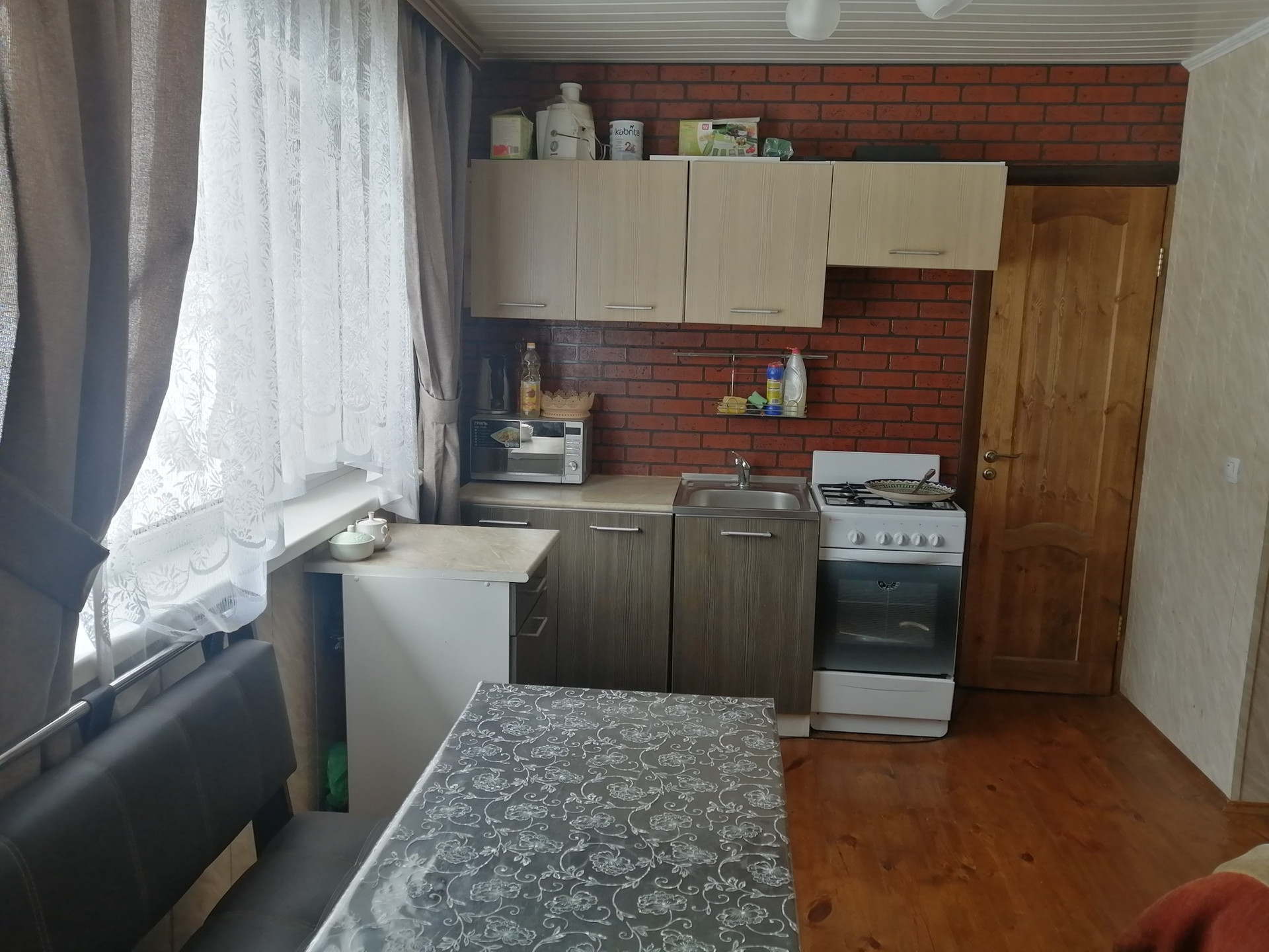 Планировка 1 этажа: веранда-прихожая, большая гостинная с дровянным камином, большая кухня, душевая комната (душевая кабина, водонагреватель, умывальник, стиральная машина). На втором этаже 2 спальни (на стенах жидкие обои), балкон.