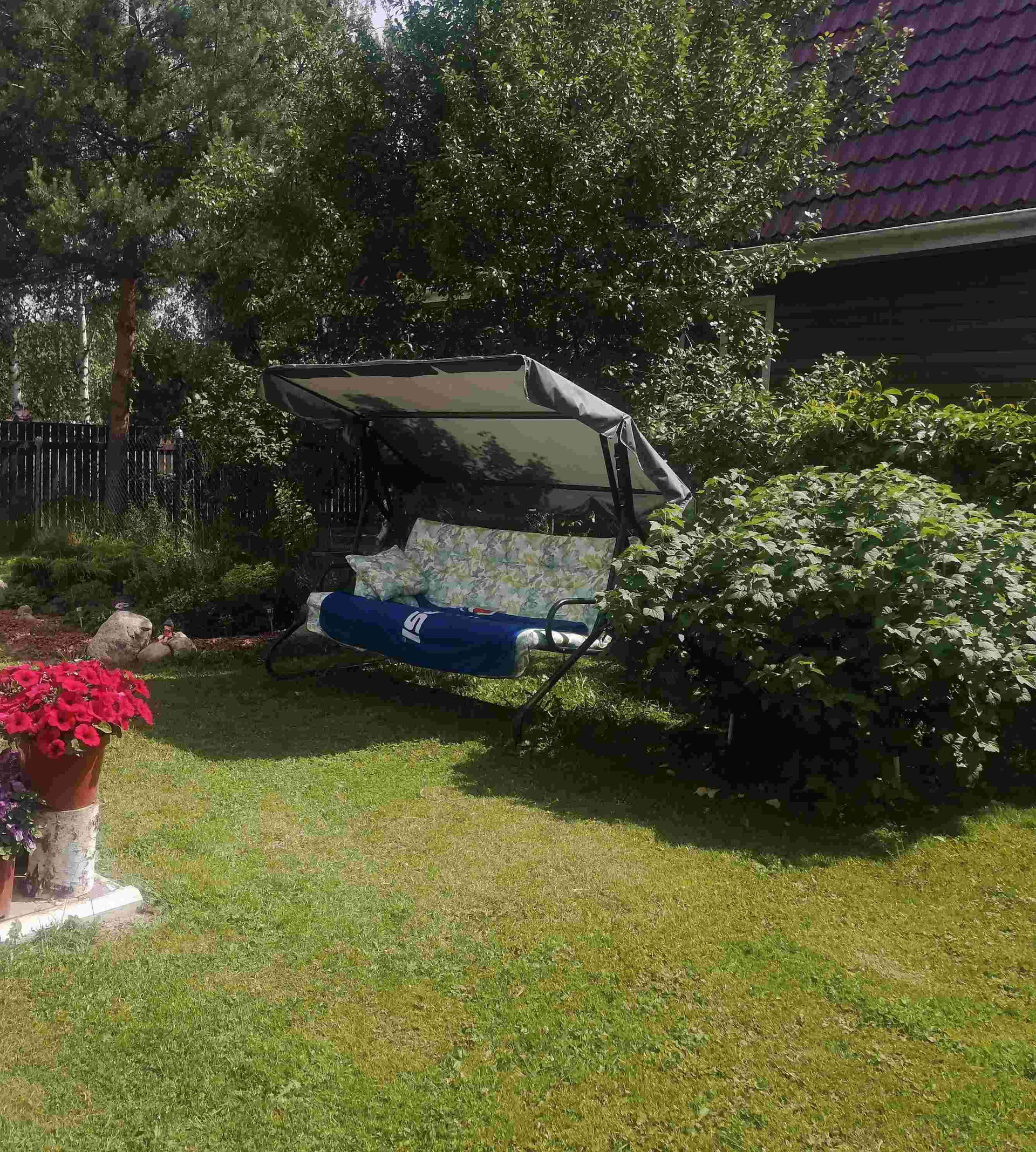 Огород и ягодные кустарники - зонированы. Из насаждений: смородина, крыжовник, малина, жимолость, голубика, клубника, Груша, яблоня (сортовые), по периметру - декоративный виноград. Вода: колодец 7 колец, летний водопровод. Обе системы заведены в дом и баню.
