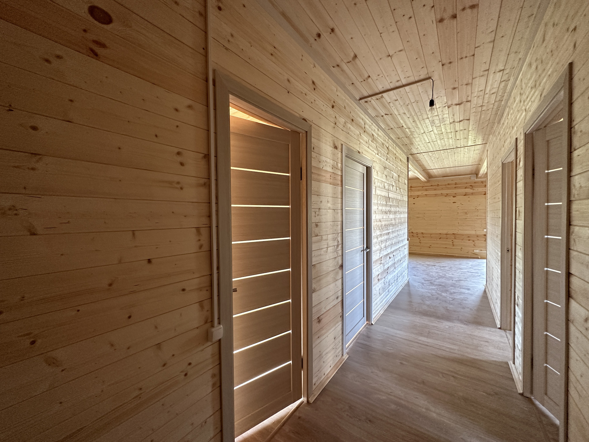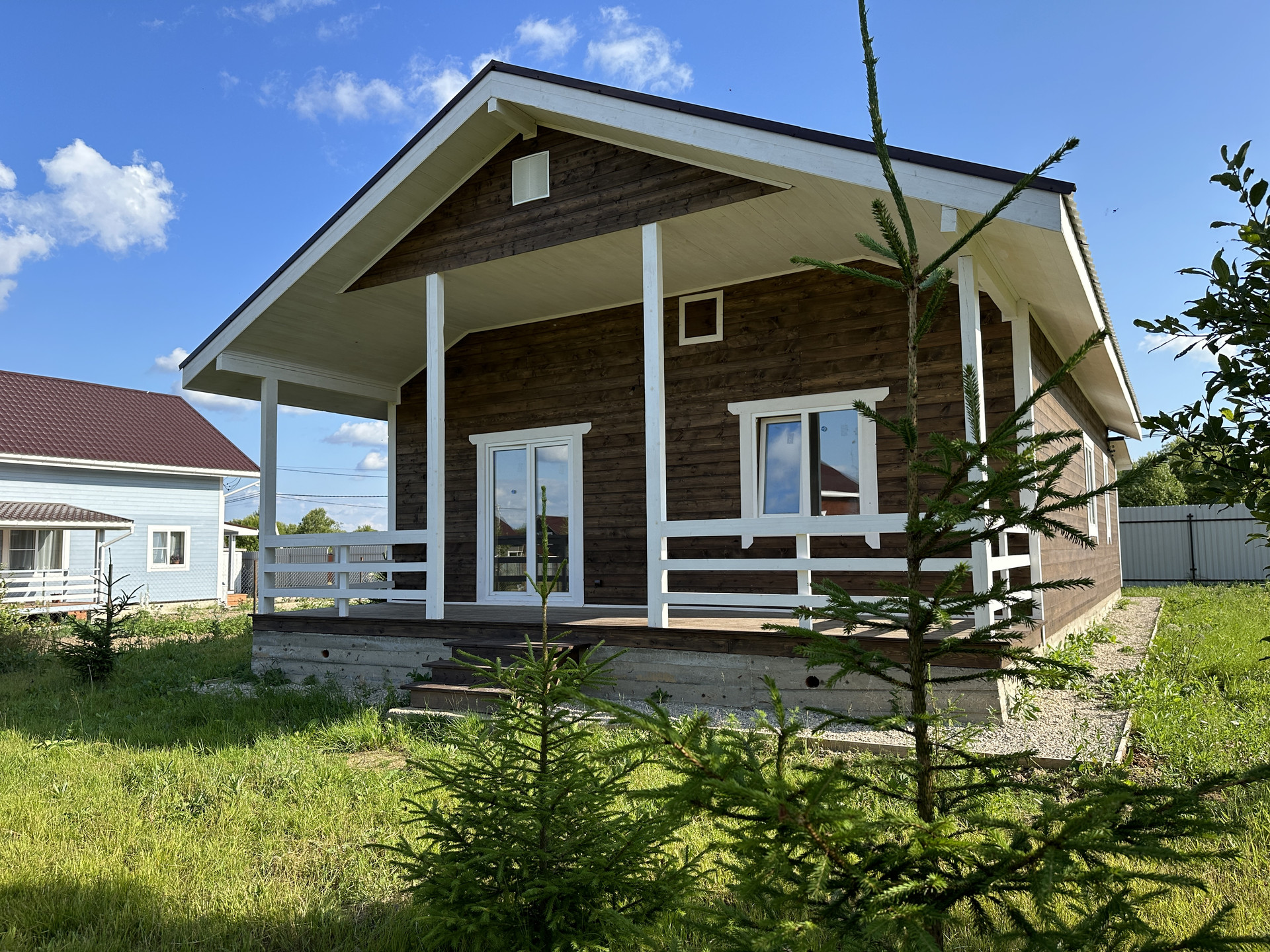 Одноэтажный дом из бруса, с тремя спальными комнатами, просторной гостиной и террасой.