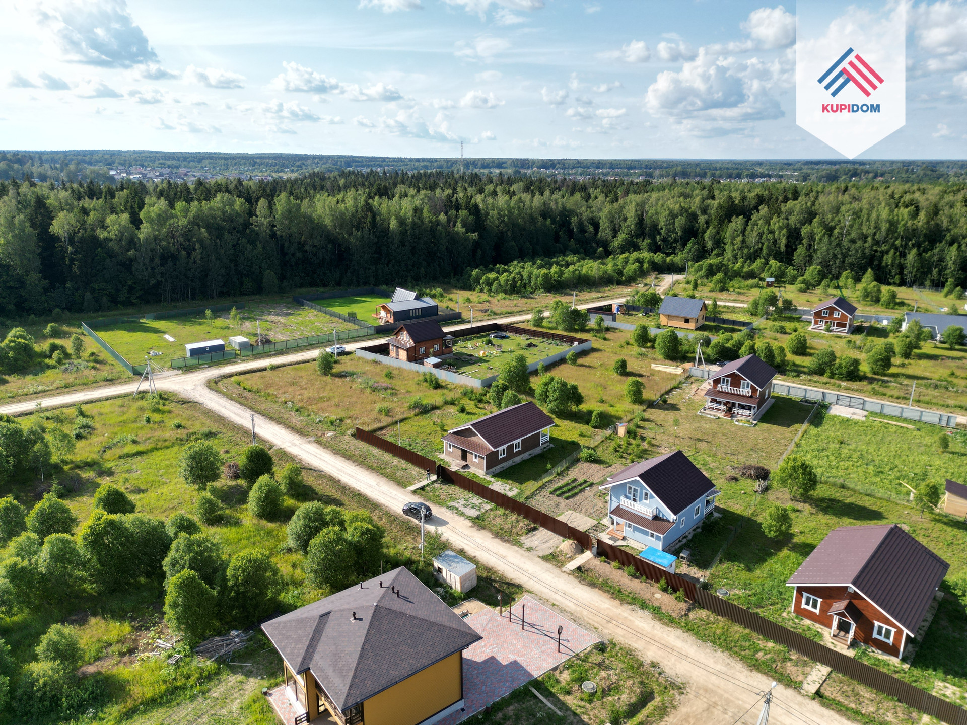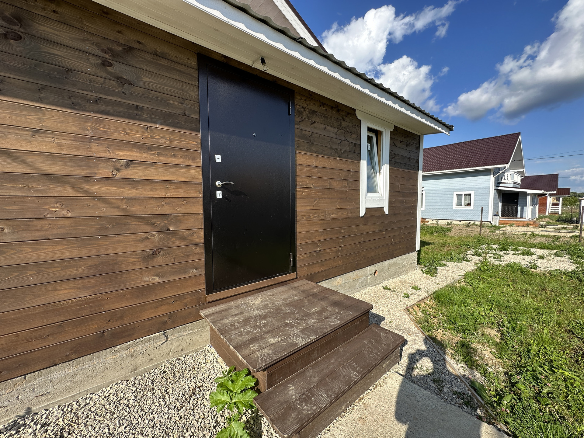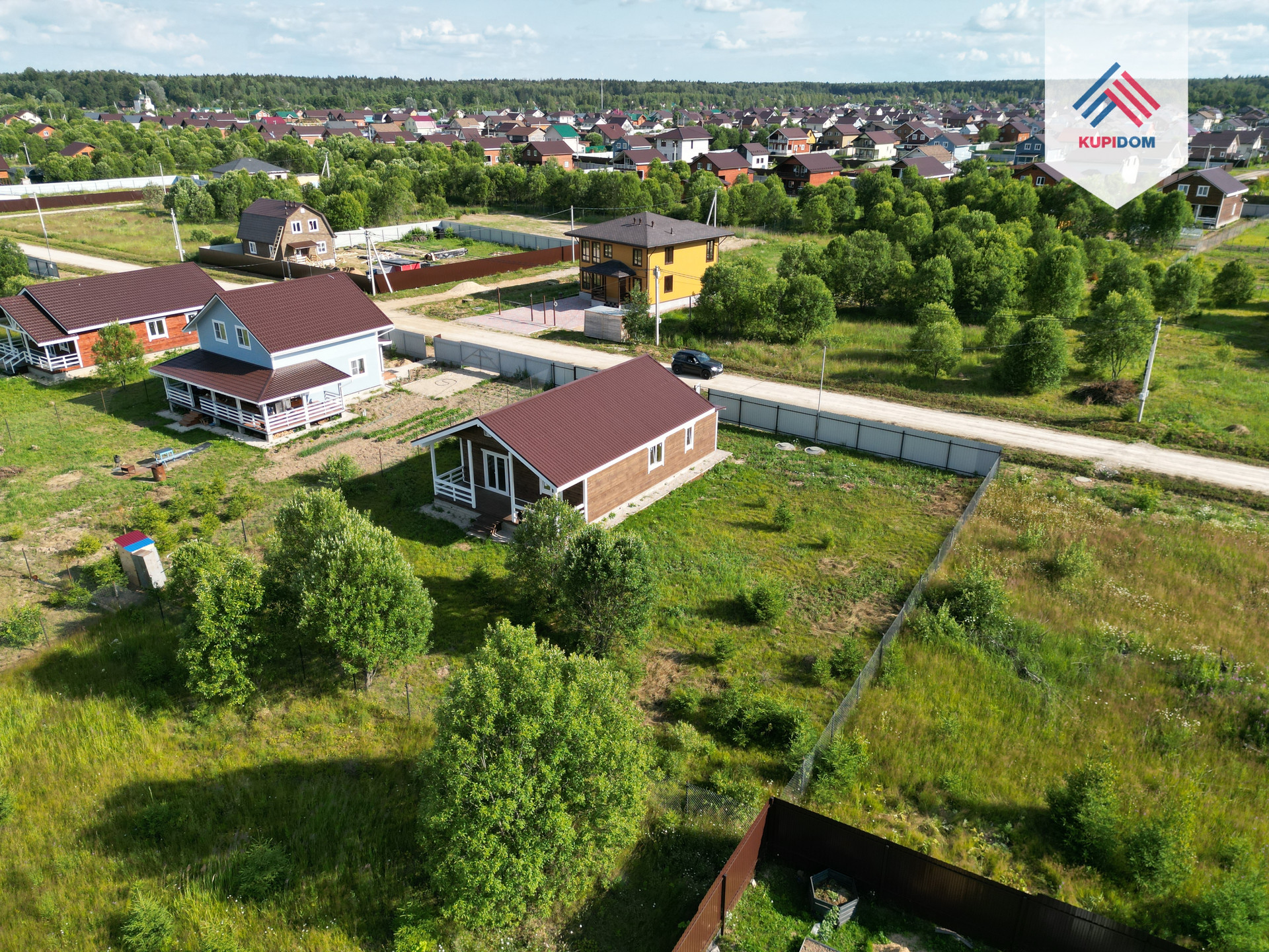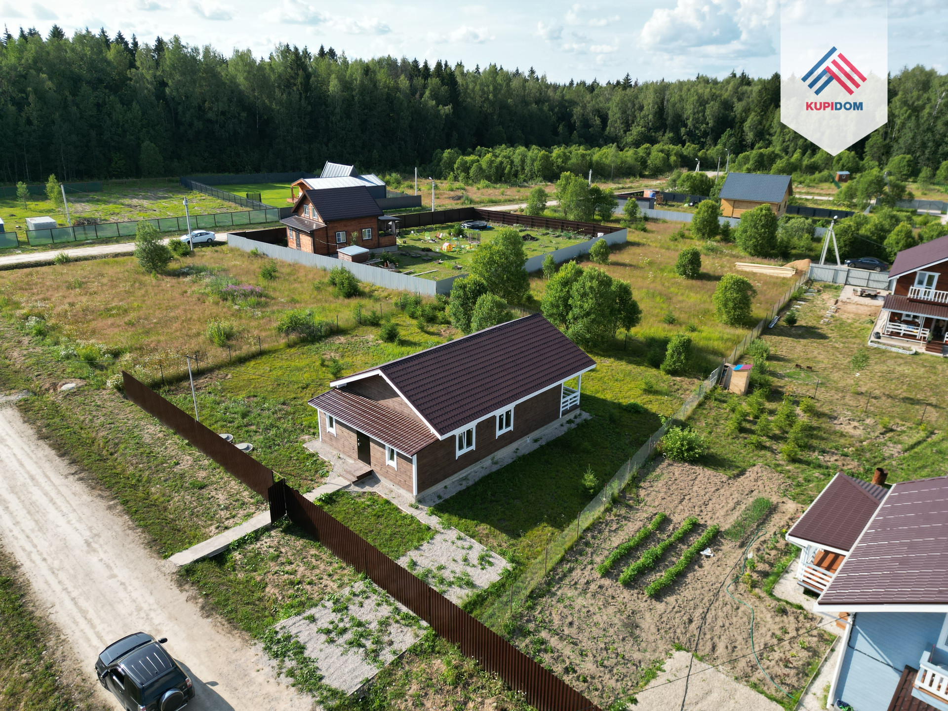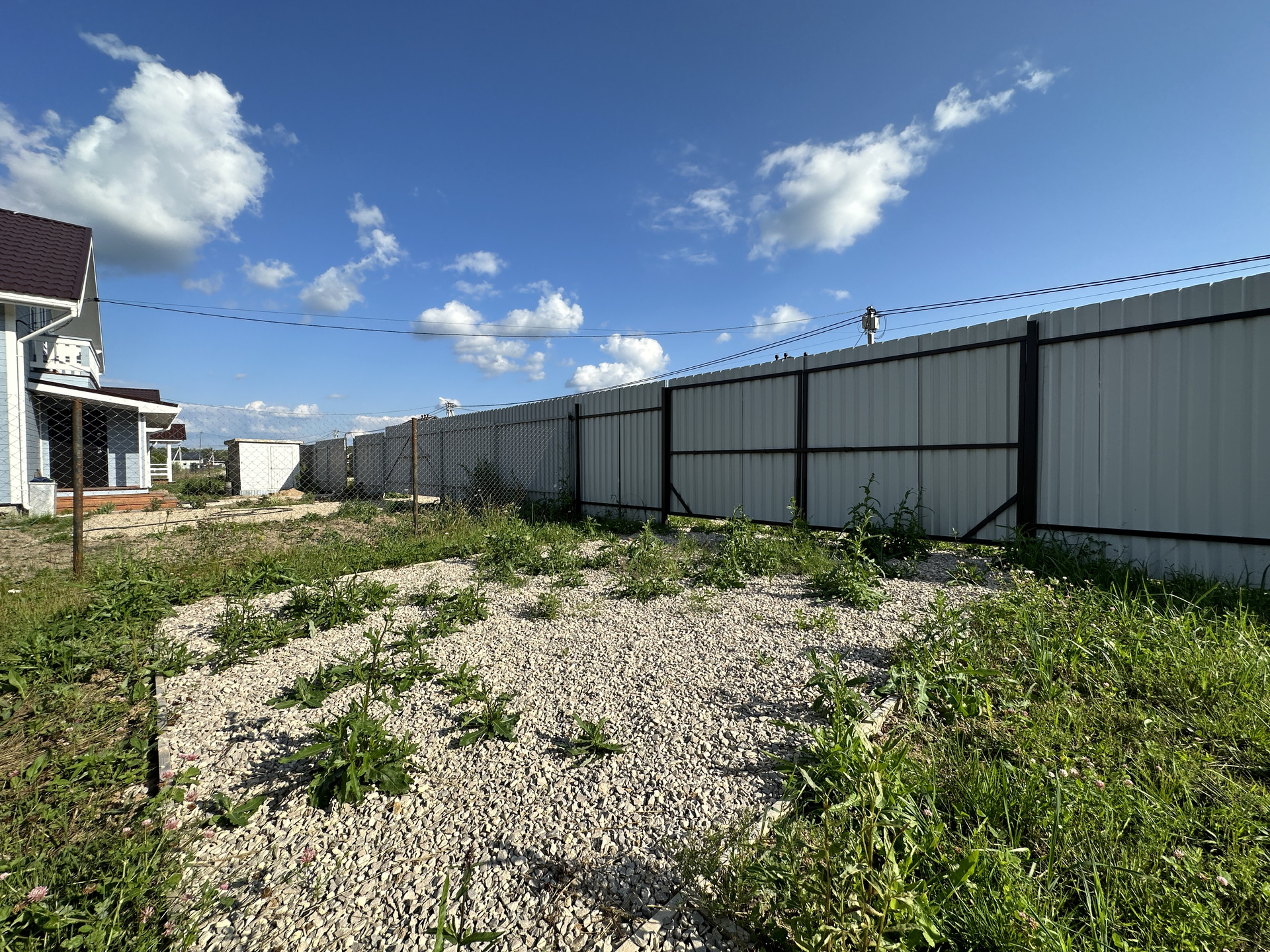 9,5 соток, ровный, правильной формы; По периметру установлен забор - профлист / рабица; Оборудовано место для машины; Отмостка и тропинки отсыпаны щебенкой.