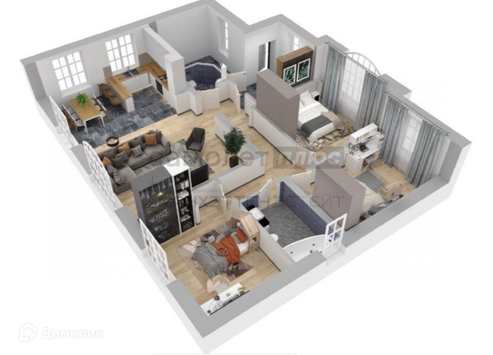 Кухня-гостиная площадью 44 кв. м. + 3 изолированных комнаты 13 кв. м. +13 кв. м. + 14 в. м.;