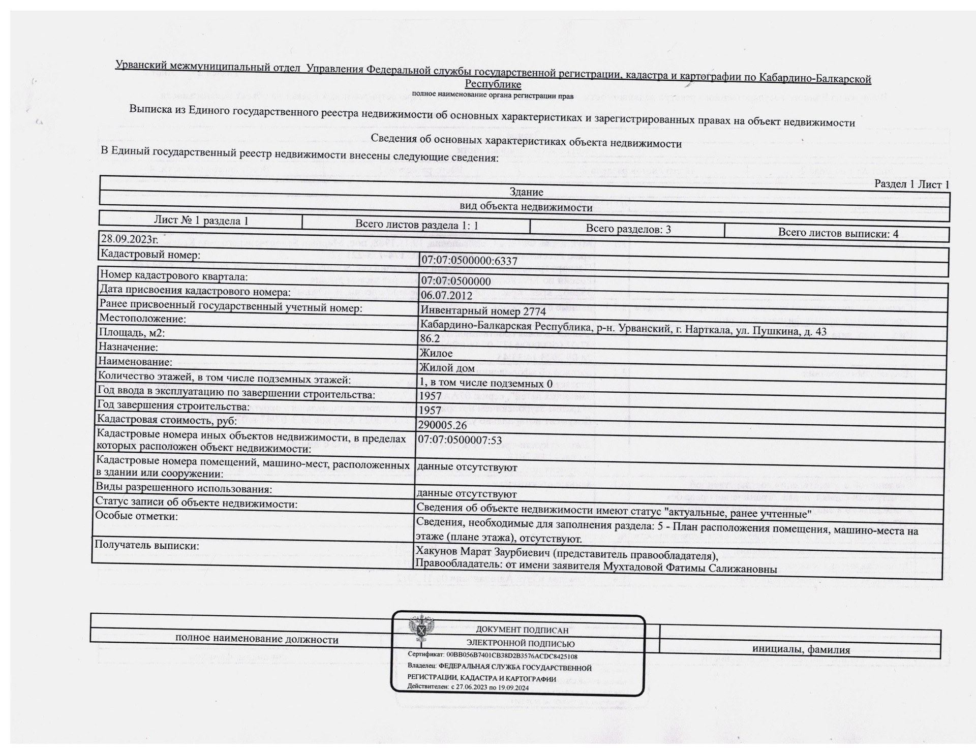 1-этажный дом, 86.2 м2, на продажу в Нарткале, улица Пушкина, 43
