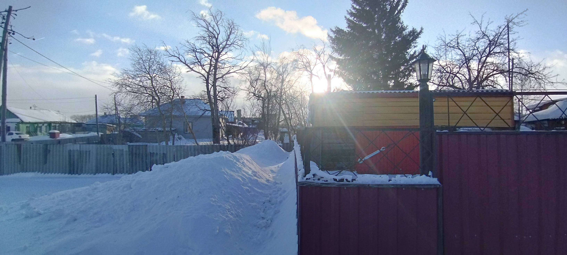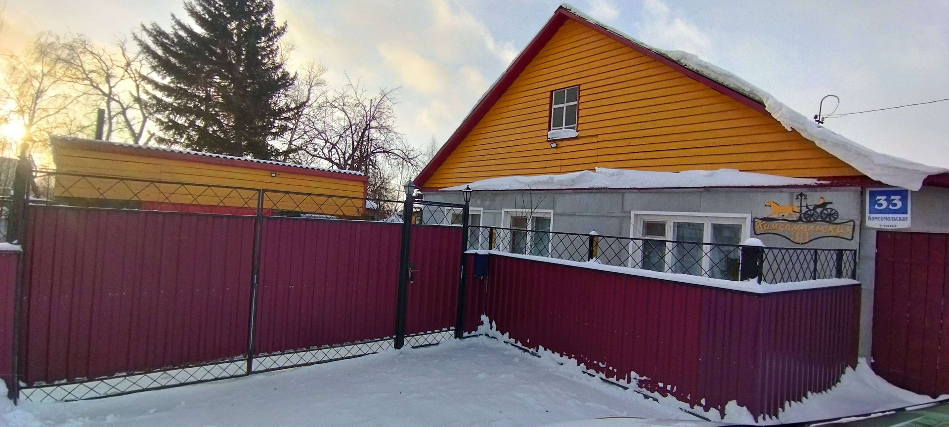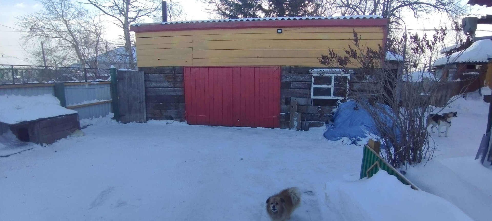Часть ограды, в которой расположены все постройки кроме гаража и углярки, находится под одной крышей.