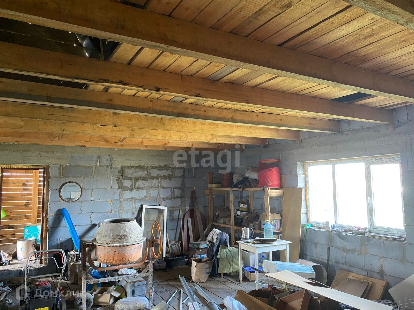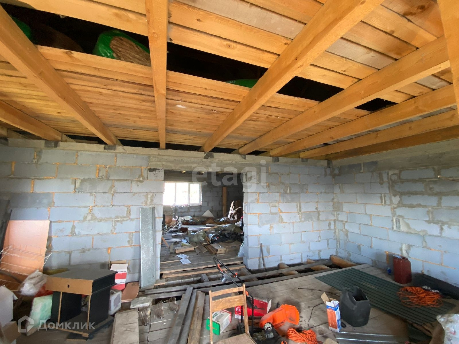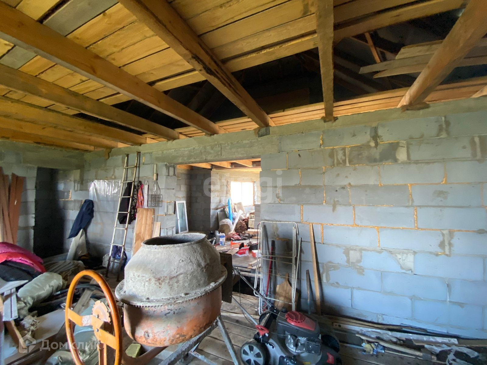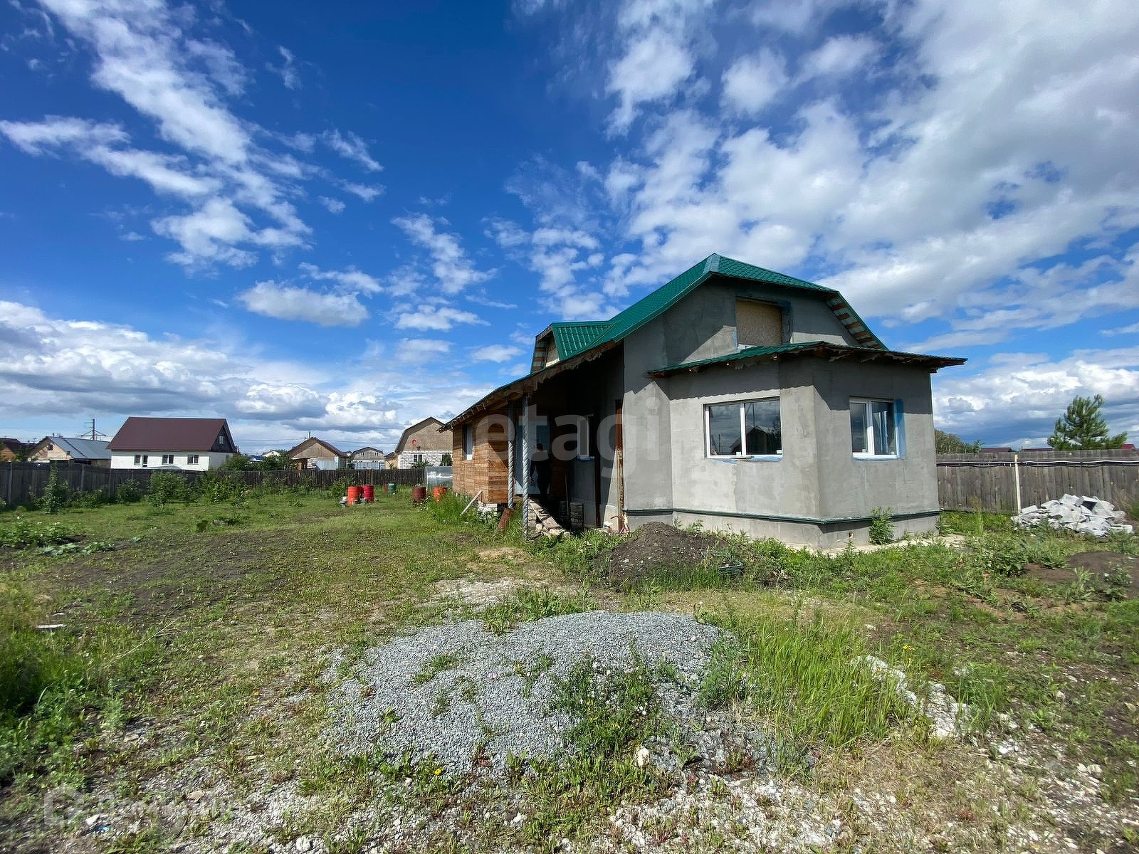 Дом сделан из газоблока. Установлены стеклопакеты. Электричество заведено в дом. Источник воды на участке - скважина. Газ заведен на участок, но не подключен.