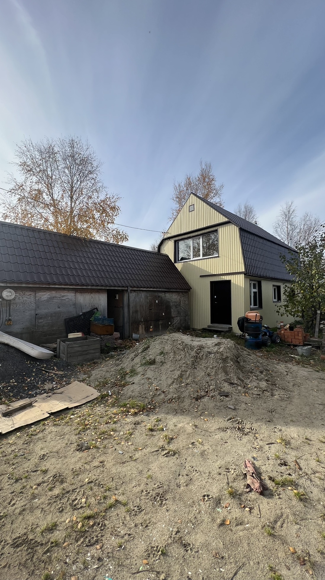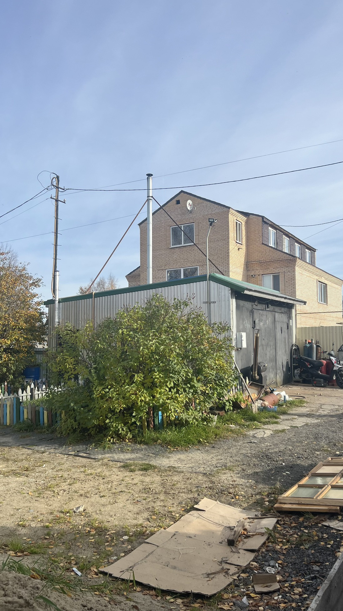 Ленточный фундамент, стены - арбоблок и брус, облагороженные лицевым кирпичем, дом построен в 1991 году. Свободный проезд с достаточной придомовой территорией. На участке 8 соток расположены в том числе кап.гараж с ямой и баня (достроена на 70 процентов). Забор из профлиста, ворота распашные подготовлены к установке приводов для автоматизации.