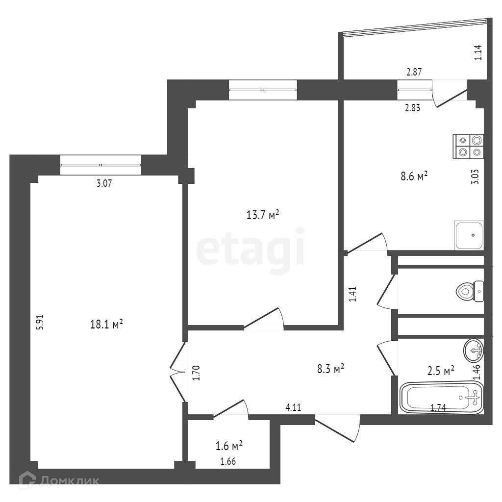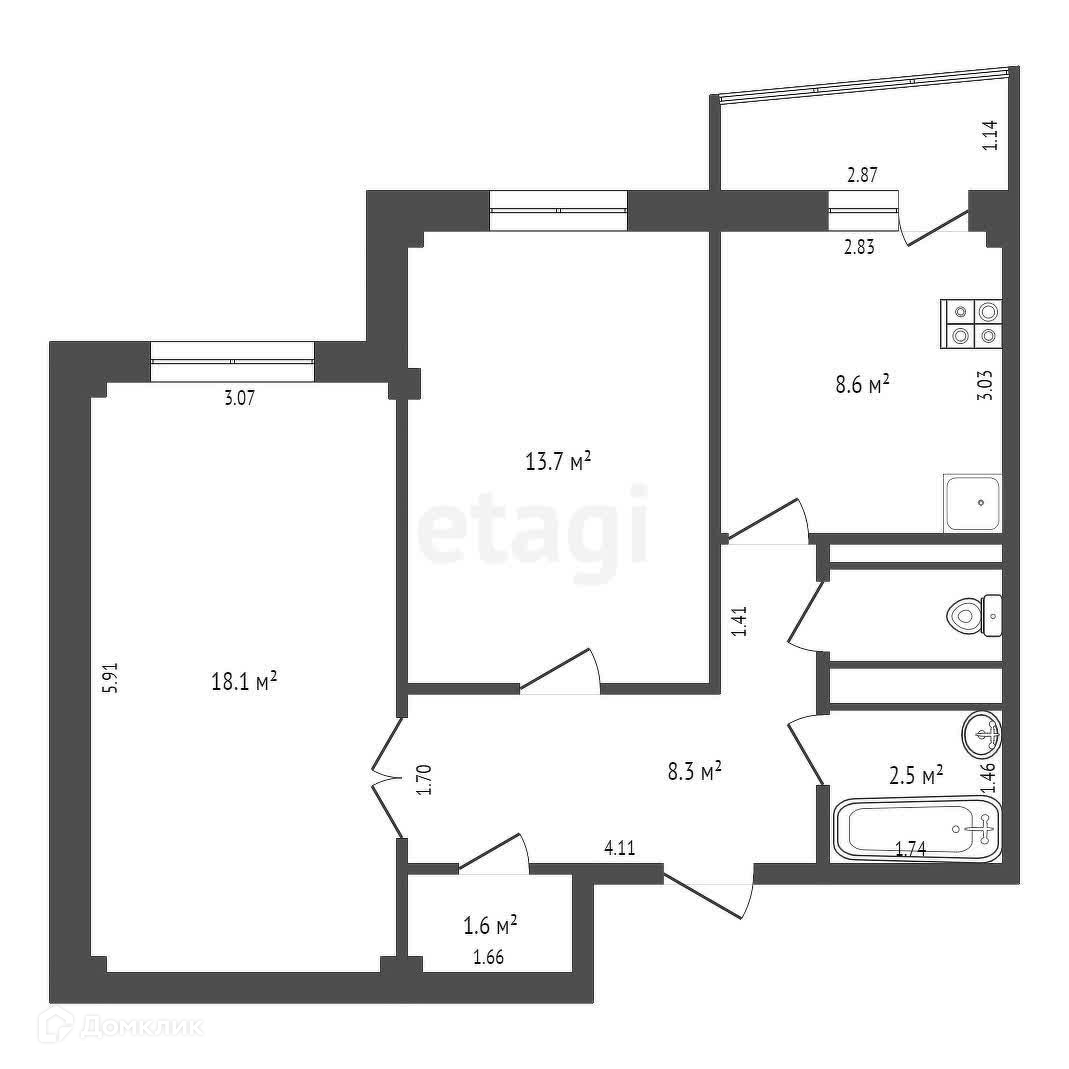 Общая площадь 54.5 м2