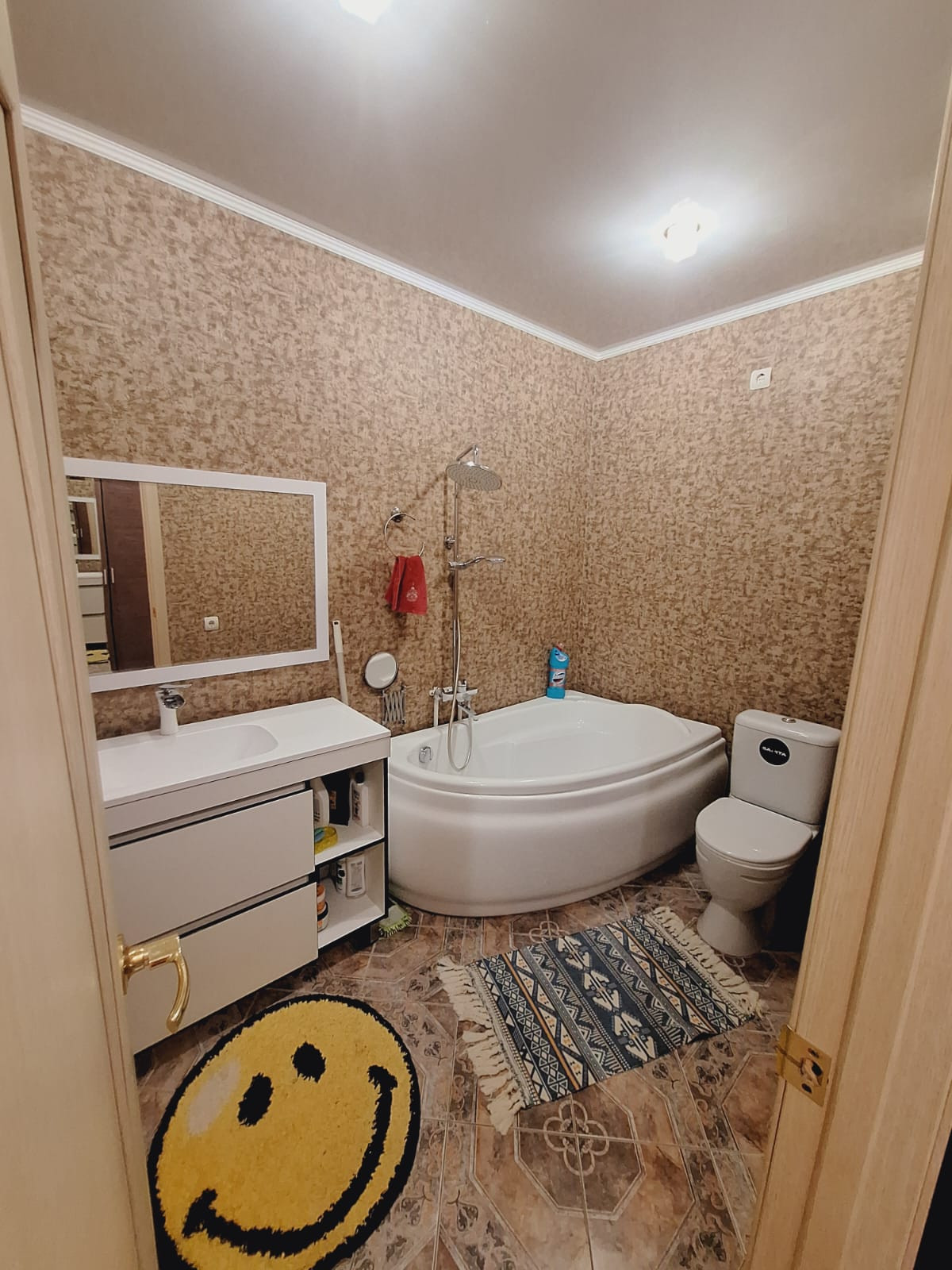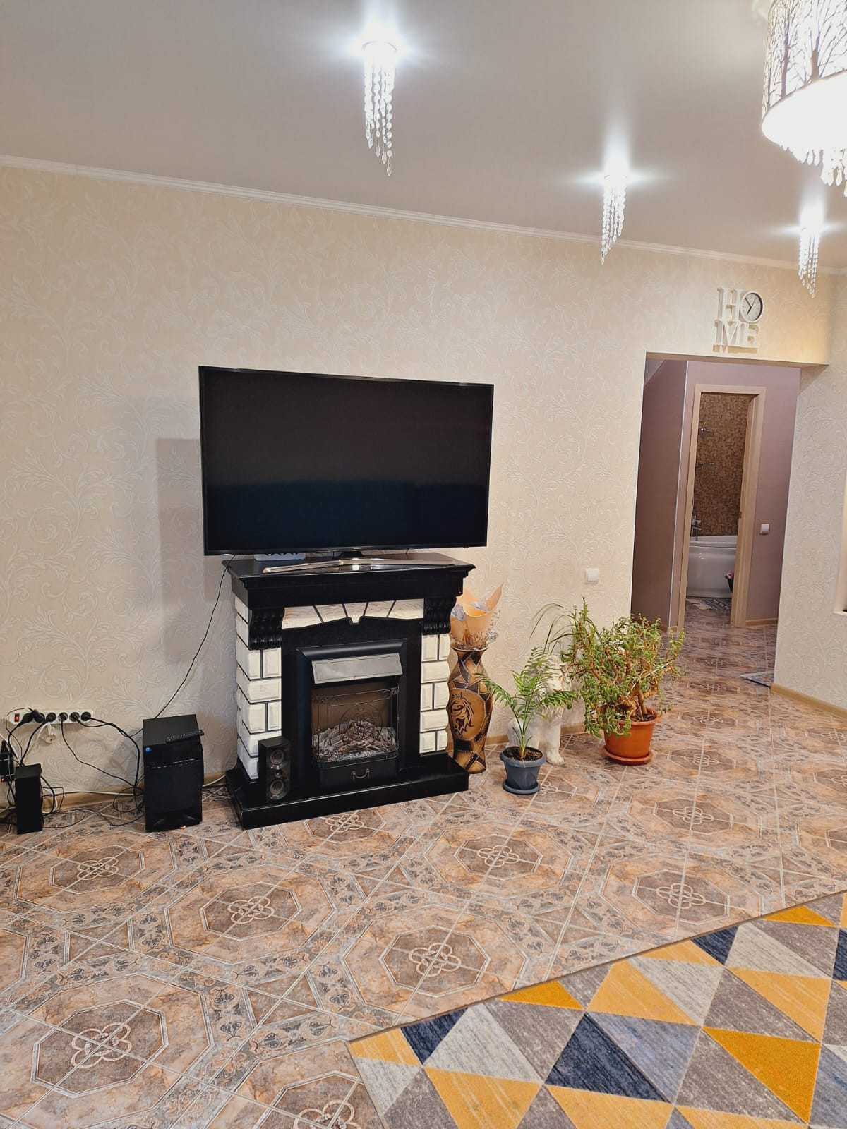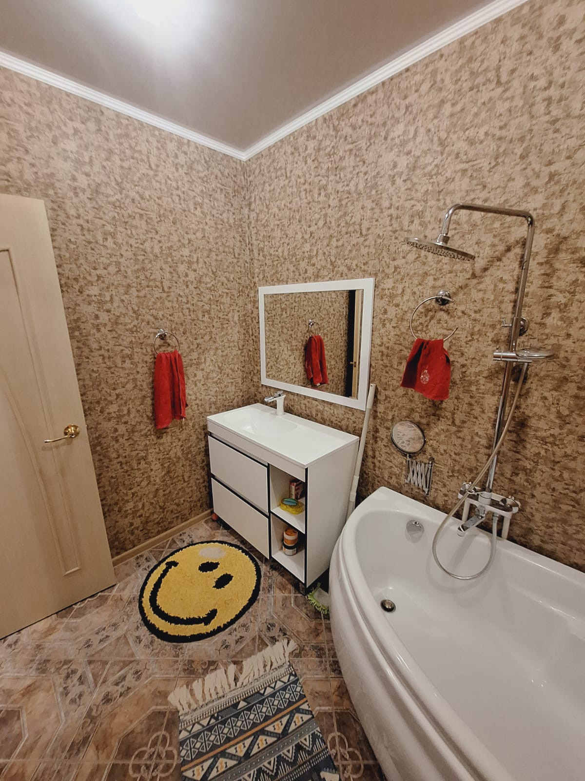 Потолок натяжной, полы кафель, стены выровнены